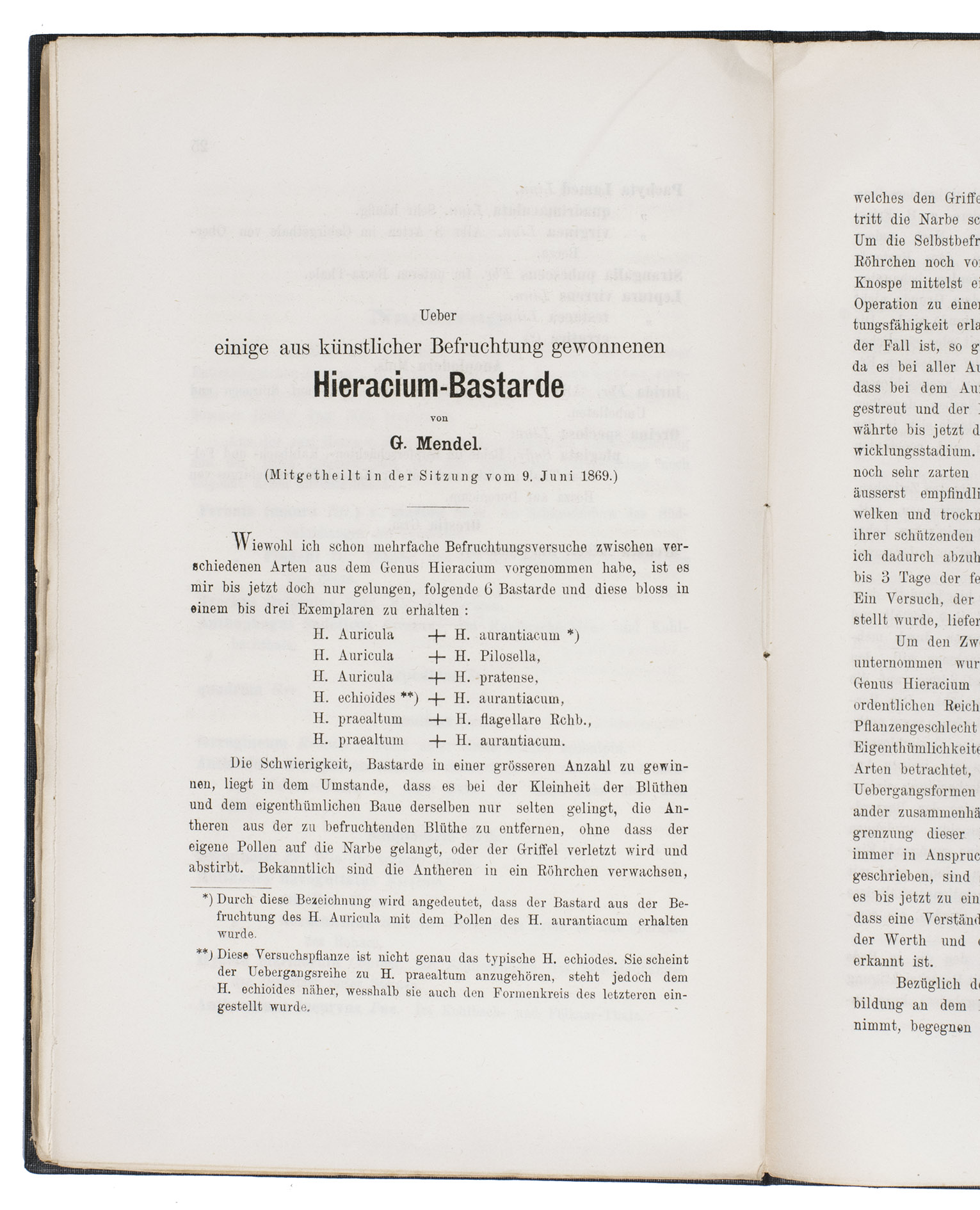 First edition of the second of two famous articles in which Gregor Mendel (1822-1884), the founder of the modern science of genetics, published the results of his research into the laws of heredity. Based on breeding experiments, Mendel showed that the transmission of characters from parents to offspring conforms to a definite pattern, which became known as the Mendelian Inheritance. His theory of genetic mutation provided an explanation for the problem of the supply of variation on which selection acts according to Darwin's theory. Darwin was acutely aware of this difficulty, but Mendel's articles, the first of which titled Versuche über Pflanzen-Hybriden was published in 1865 in the same scholarly magazine, remained unfortunately unnoticed until their rediscovery in 1900 after Darwin's, and Mendel's, death.