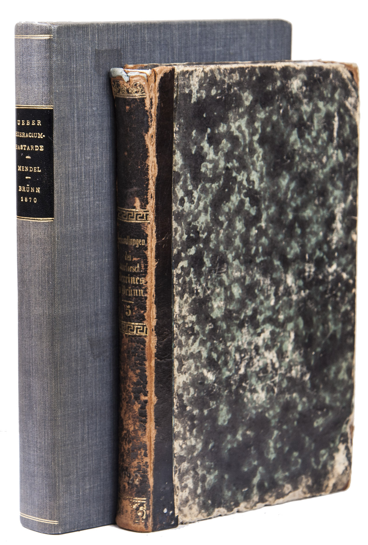 With the library stamp of the Essex Institute in Salem, Massachusetts on the front wrapper of ad 1, and a library stamp of the library of the K. K. Technische Intitutes in Brno on the title page of ad 2. The wrappers of ad 1 are somewhat discoloured and frayed around the edges, the boards and spine of ad 2 have been rubbed, with some loss of material. Ad 1 is uncut, the leaves of ad 1 and 2 are somewhat browned. Otherwise in good condition. Jakubícek & Kubícek, Bibl. Mendeliana 10; Sparrow, Milestones of science, pp. 41, 232; Stafleu & Cowan 5819; cf. DSB IX, pp. 277-286.