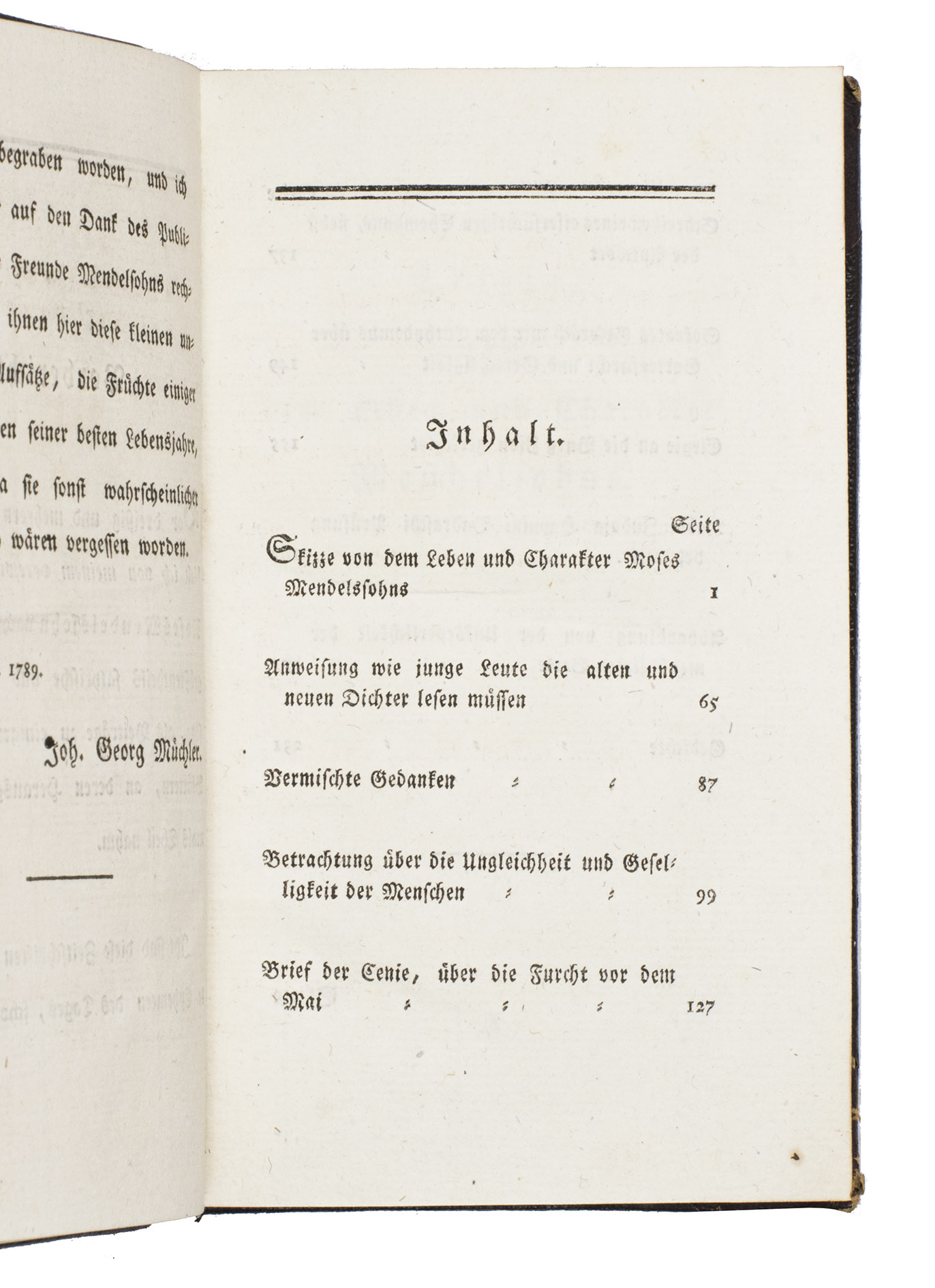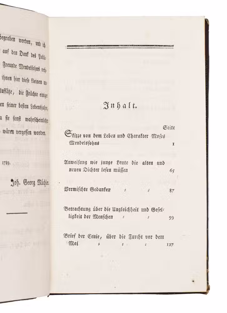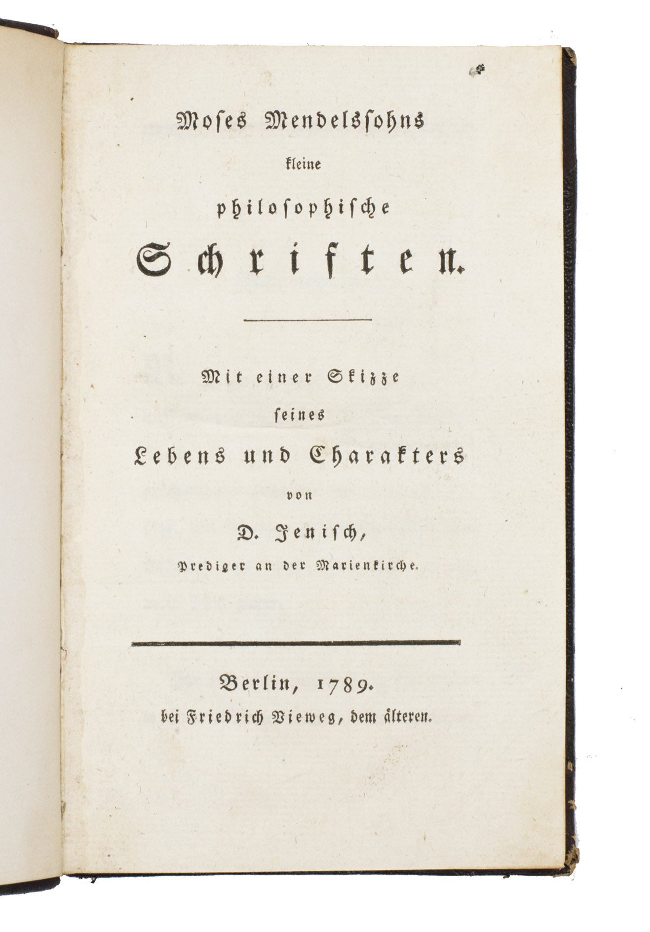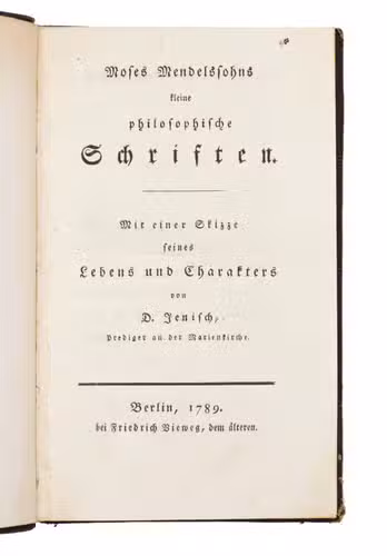 First edition of this posthumous collection of shorter writings by the influential German-Jewish philosopher Moses Mendelssohn (1729-1786), edited by Johann Georg Müchler (1724-1819). The collection was intended to preserve and re-circulate a number of Mendelssohns shorter philosophical essays, many of which had previously appeared scattered across contemporary journals and had already become difficult to obtain. In bringing them together, Müchler ensured the continued availability of texts that illuminate the breadth of Mendelssohns thought and the literary clarity for which he was celebrated.
