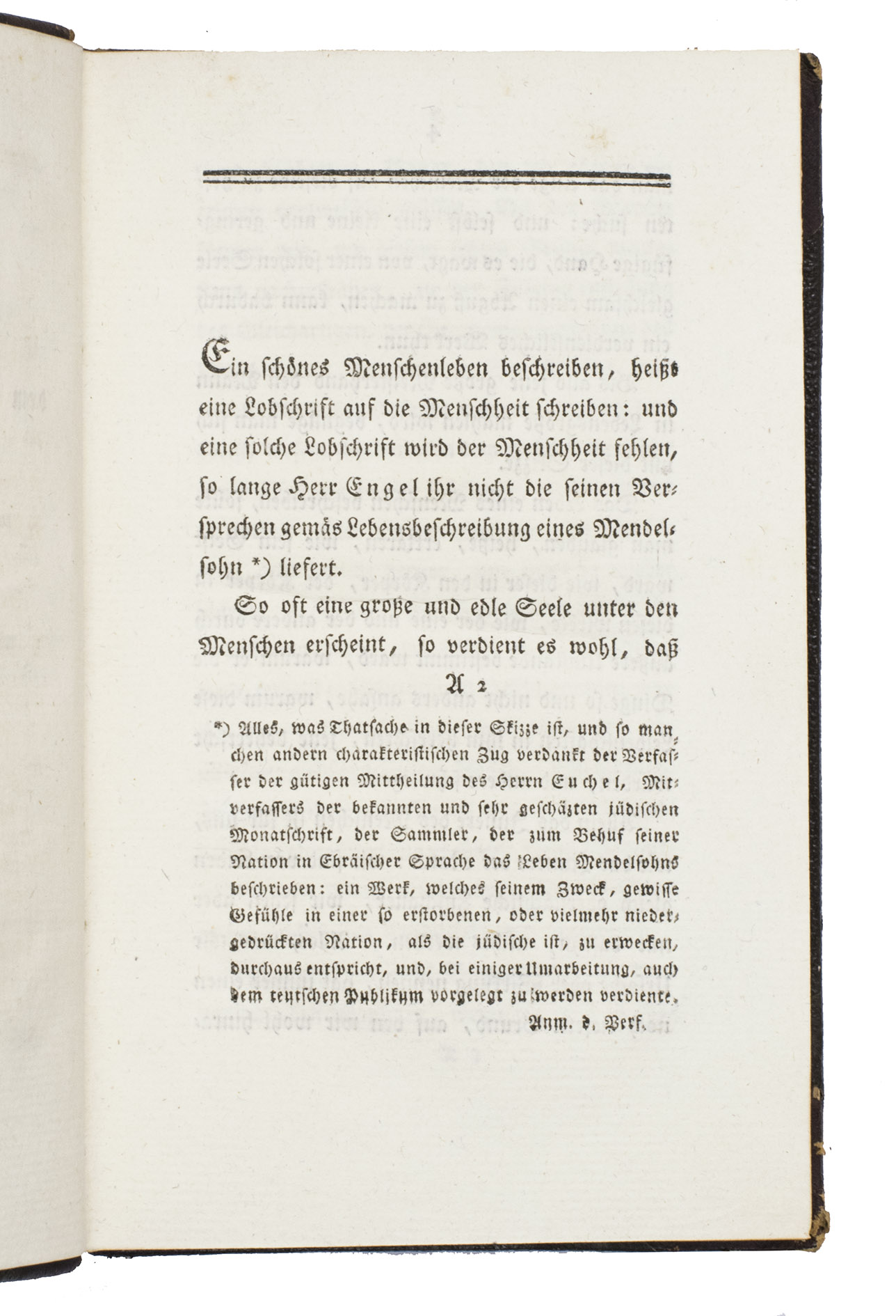 With a bookplate mounted on the front pastedown inscribed "Noel Gouton 1903(?)", made by Stern Graveur, a prominent Parisian engraving house active during the late 19th and early 20th centuries, which specialized in high-quality ex-libris. The edges of the boards are slightly scuffed, the spine is somewhat discoloured. Internally very clean. Otherwise in very good condition. Fürst II, p. 362; Goedeke IV, p. 164 no. 19; VD18 13630814; WorldCat 231070909, 172996042 (10 copies); cf. Albrecht, "Moses Mendelssohn 1729-1786. Das Lebenswerk eines jüdischen Denkers der deutschen Aufklärung", (1986).