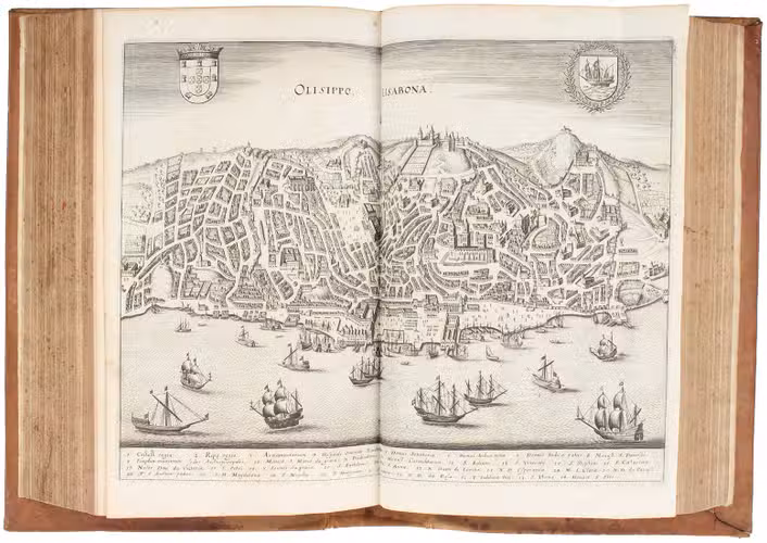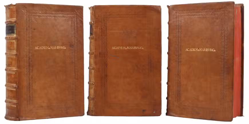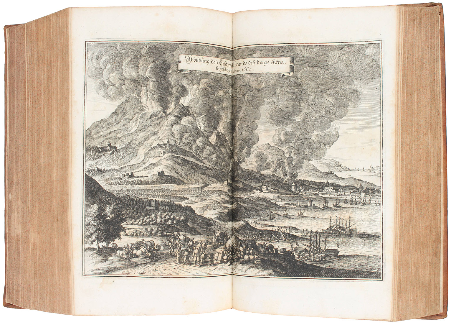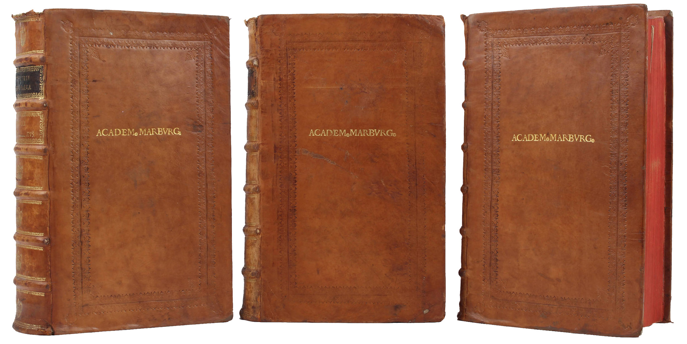 Frankfurt am Main, Daniel Fievet, Johann Görlin et al., ca. 1633-1738. 21 vols. Folio (ca. 22 × 33.5 cm). With 19 (of 20) engraved title-pages, 1 engraved title vignette, 1 armorial plate, 646 (of 686) engraved views, plans, and maps, many folding or double-page-sized, 690 (of 692) engravings in the text (mostly portraits on interleaves), and several folding tables. Early 18th century full leather bindings with gold-tooled spines (titles and crown crest) and blind-tooled frame on the boards; slightly differing from vol. 16 onwards with gilt supralibros "Academ. Marburg.".