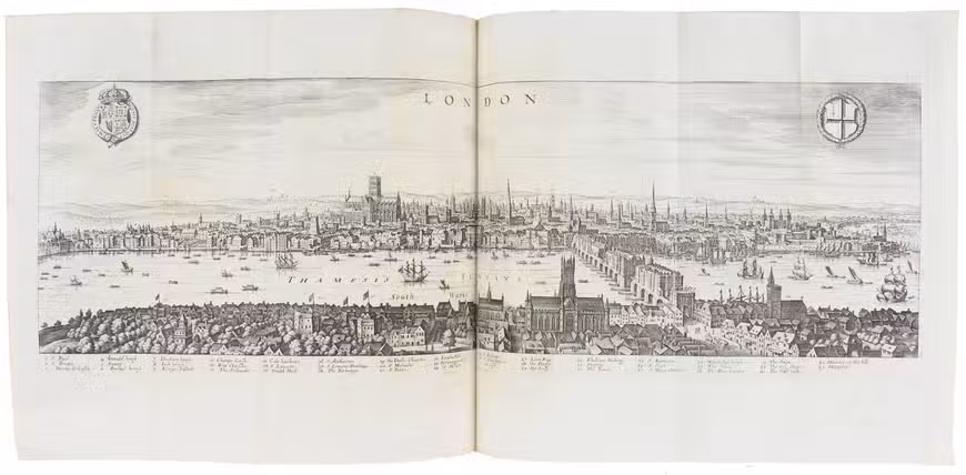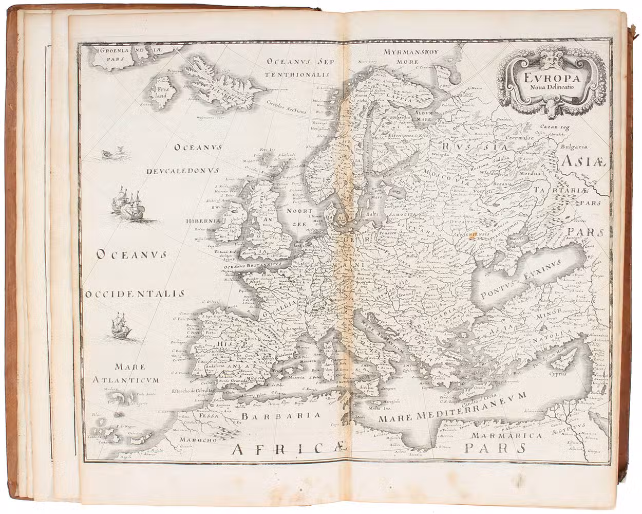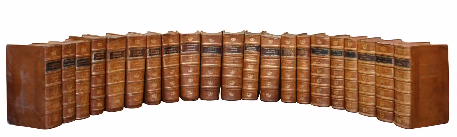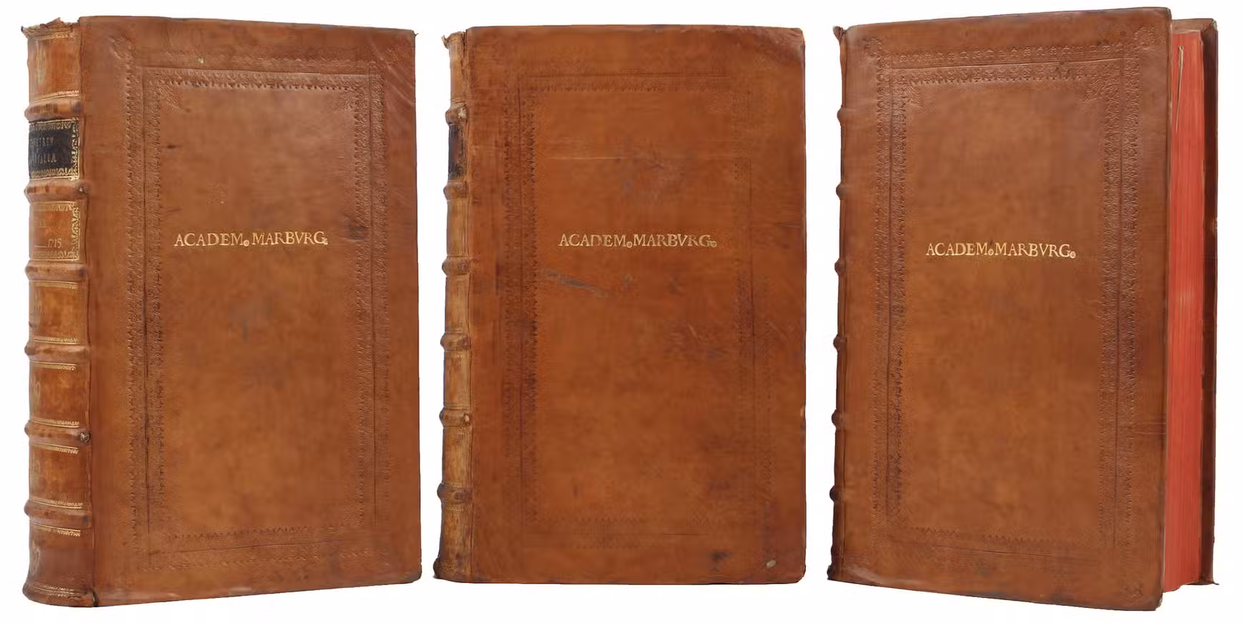 Frankfurt am Main, Daniel Fievet, Johann Görlin et al., ca. 1633-1738. 21 vols. Folio (ca. 22 × 33.5 cm). With 19 (of 20) engraved title-pages, 1 engraved title vignette, 1 armorial plate, 646 (of 686) engraved views, plans, and maps, many folding or double-page-sized, 690 (of 692) engravings in the text (mostly portraits on interleaves), and several folding tables. Early 18th century full leather bindings with gold-tooled spines (titles and crown crest) and blind-tooled frame on the boards; slightly differing from vol. 16 onwards with gilt supralibros "Academ. Marburg.".