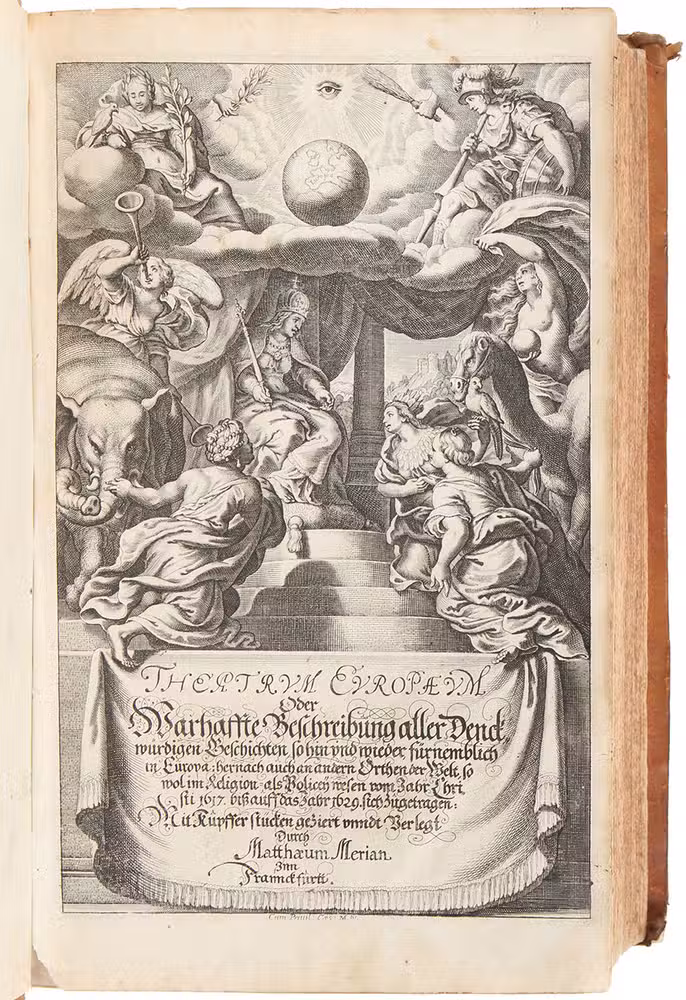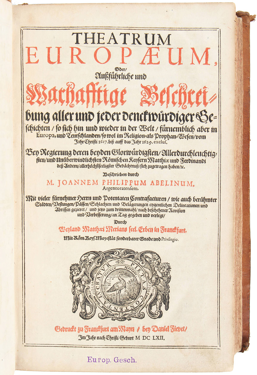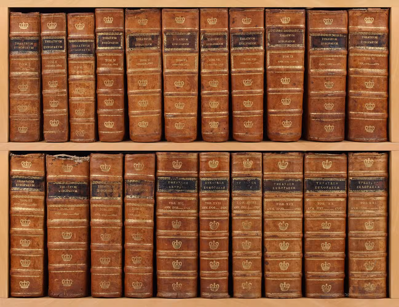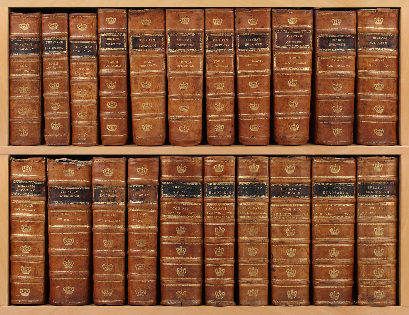 "One of the greatest printing enterprises of the 17th century [...] The numerous maps, views, portraits, and illustrations of historical events and battles lend the work an historical and cultural value that will endure" (LGB). "Based on our own experience we should wish to say that the German language possesses no other comparable or similarly ample repository of contemporary historical documentation on the age of the Thirty Years War and the Age of Louis XIV" (Wüthrich).