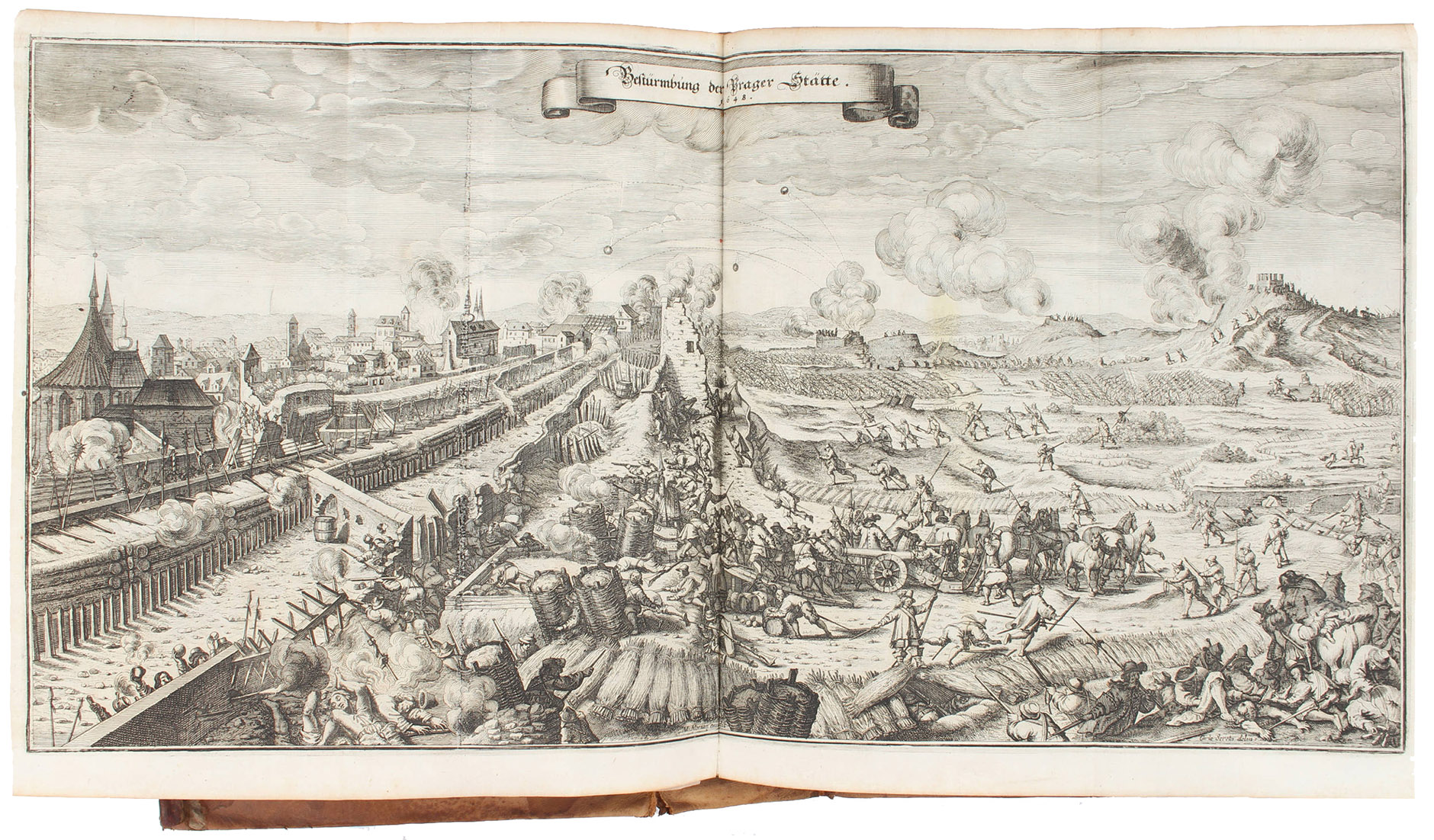 Bindings rubbed and chafed, some spine-ends chipped, occasional worming. Seven of the early volumes are a little smaller than the others, but have been brought to uniform size through the bindings. Wants the engraved title-page of vol. 16; none published for vol. 20. The 40 missing plates belong mostly to vols. 2-5, comprising numerous views of sieges of large German cities (as well as Lisbon in vol. 16, and 2 maps). Text somewhat browned throughout with some brownstaining; a few tears to the folds. Volume 2 (the earliest in the set) more markedly browned and stained; numerous edge tears to text (also in vols. 4-6); roughly a third of pp. 409f. has been remargined with loss. In a few volumes the index leaves and a few plates show edge tears; occasional slight worming; some plates in vol. 21 are stamped on the verso. From the library of the landgraves of Hesse-Kassel with their gilt-stamped crown to the spines; transferred to the Marburg University library after 1717. Later in the Princely Fürstenberg Court Library with their stamps. LGB² VII, 399f; Wüthrich III, 113-272 (supersedes the earlier accounts in Lipperheide, Bingel, Fauser, and Diesch).