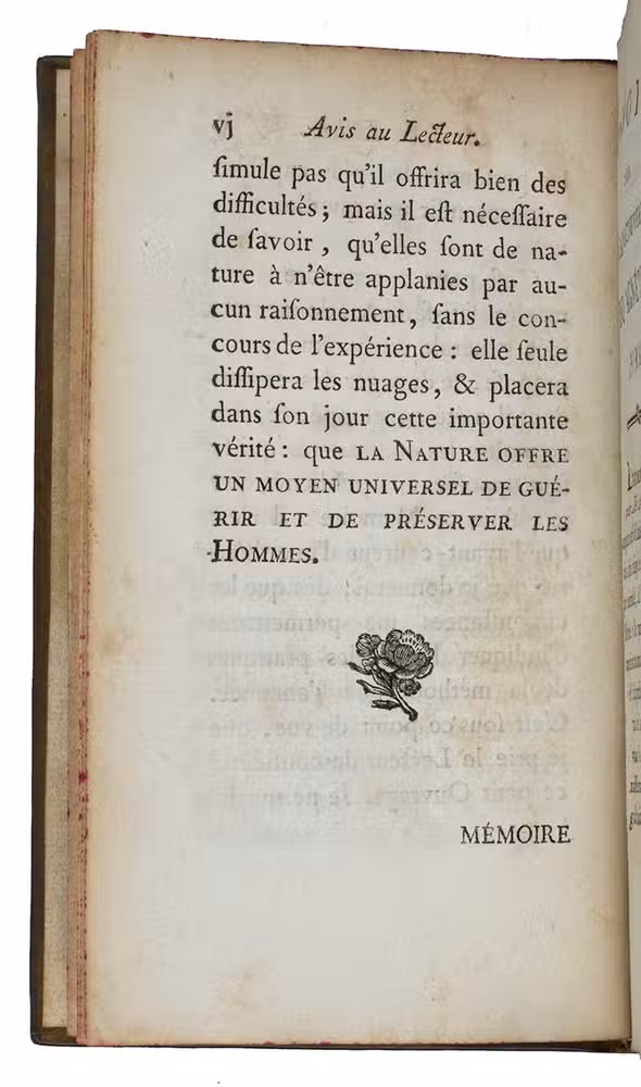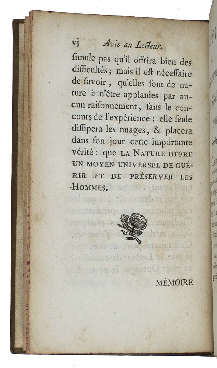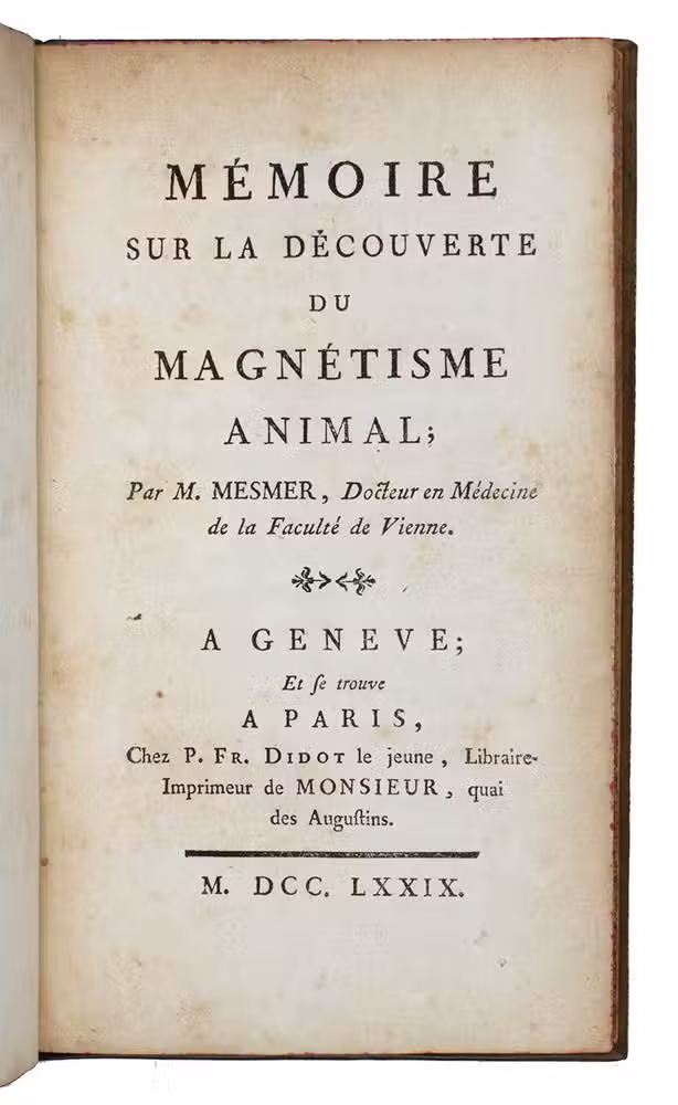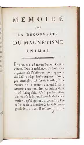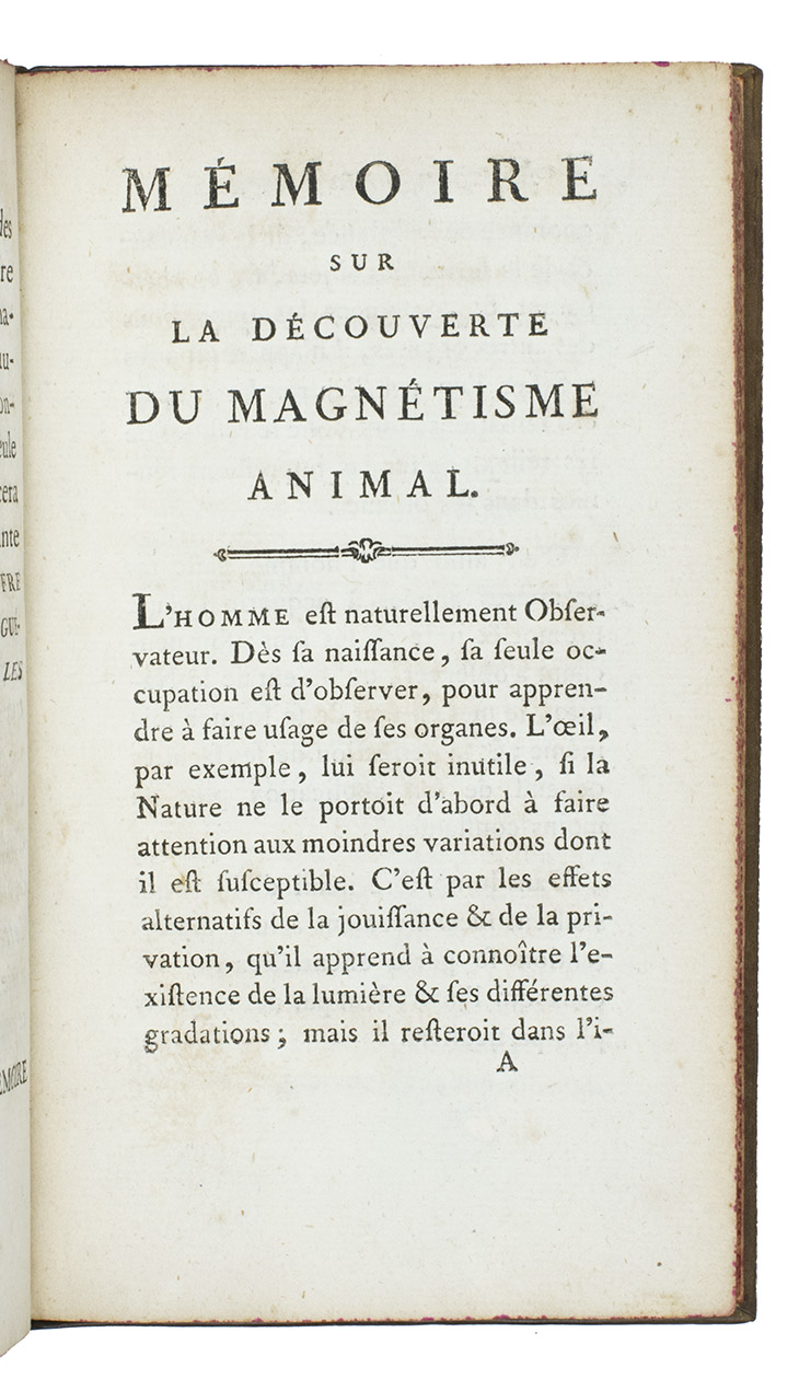 First edition of a famous (or infamous) treatise by Anton Mesmer (1733-1815) on the medical and healing use of magnetism and the healing magnetic power in his own hands, which he called "animal magnetism". His theories gave us the English word "mesmerize". Mesmer was an Austrian physician who believed that a magnetic fluid pervades the universe, is present in every living being and affects the nervous system. A blockage in this system, could prevent the magnetic energy from flowing throughout the body, which would provoke illnesses. Mesmer thought that he could redress the energetic imbalances with the use of magnetism.
