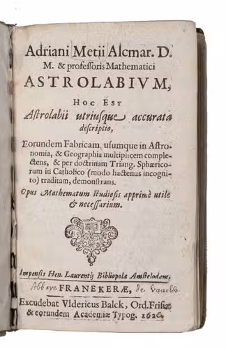 Very rare issue of the first edition of Adriaan Adriaansz Metius's Astrolabium, being an instructive manual on how to built an astrolabium catholicum, being a particular kind of astrolabe which was generally used by many Dutch pilots in the 16th and 17th century, as it is often depicted in frontispieces of Dutch atlases and pilot guides. The astrolabium catholicum (an universal astrolabe) "was an instrument for the graphic solution of various astronomical and nautical problems, based on the parallactic triangle on the celestial sphere" (Koeman).