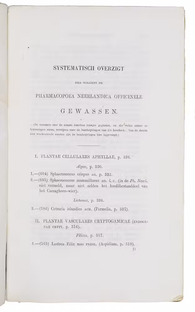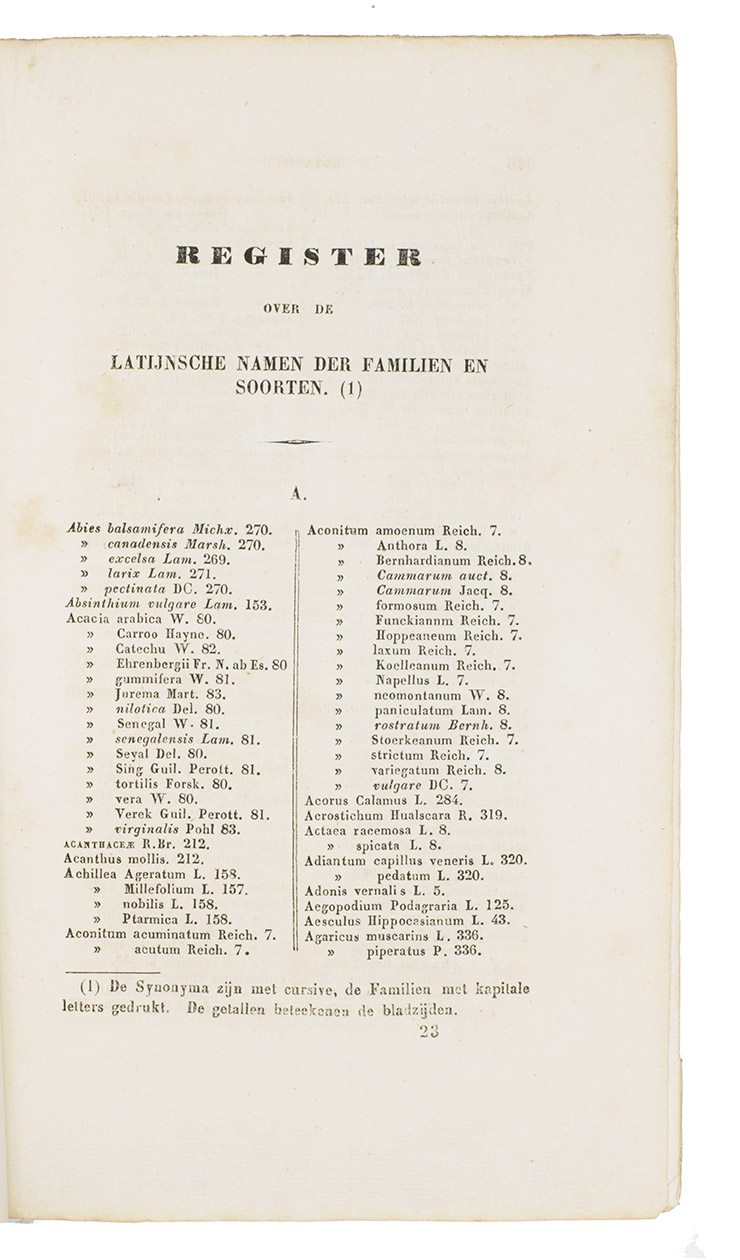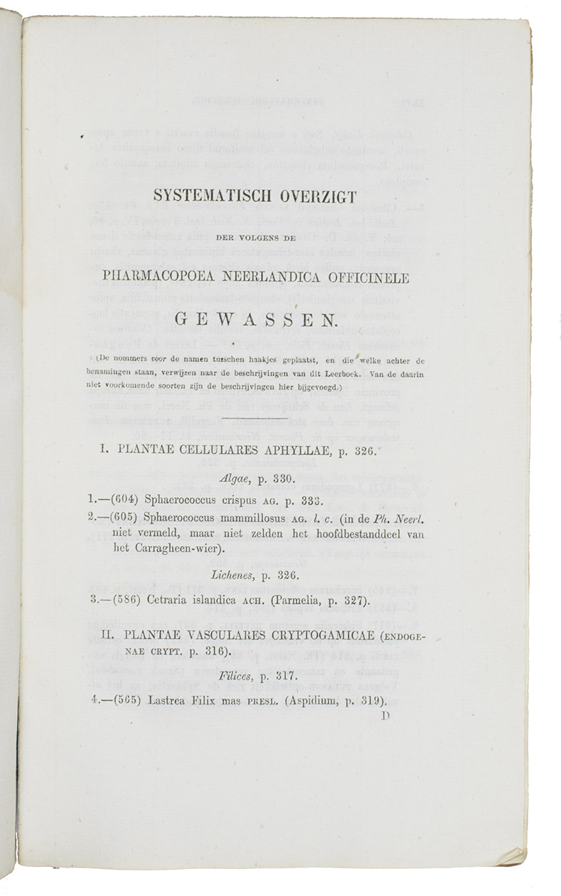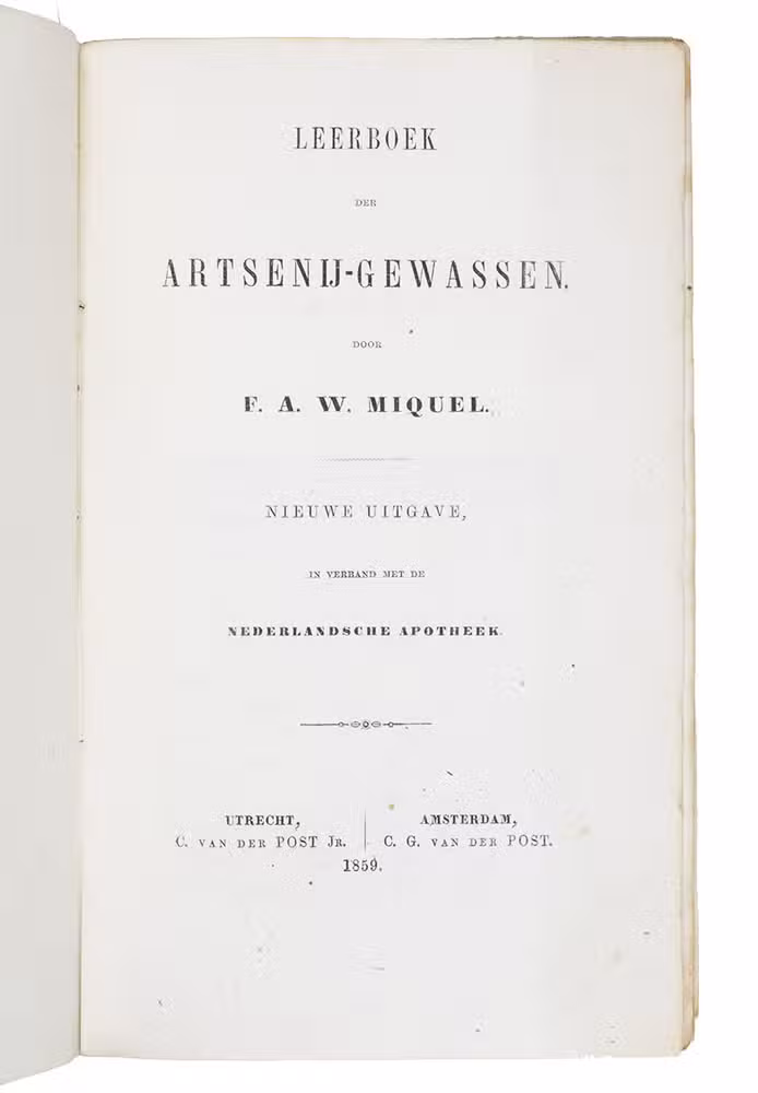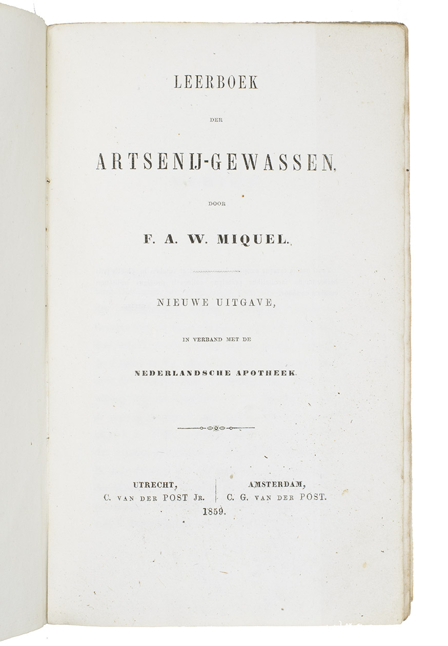 Next to his scientific works like the Flora Indiae Batavae (Amsterdam, 4 vols., 1855-1859), Miquel published this more practical handbook on pharmaceutical plants for students and practitioners, including very circumstantial information on the plants used in Dutch pharmacology. The present first edition appeared in the year Miquel was appointed in Utrecht.