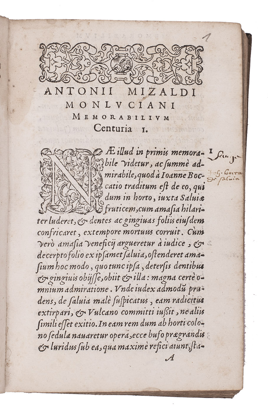 Mizauld (1510-1578) was a professor of medicine at the University of Paris and astrologer and physician to Margaret of Valois. Mizauld thought the poor often fell prey to greedy apothecaries, so he presented them with remedies they could often grow in their own gardens or gather in the wild. It was an entirely different work from the Memorabilium aliquot ... that Mizauld had published in 1554, but succeeded to and expanded on his Arcanorum naturae sylvula (1555).