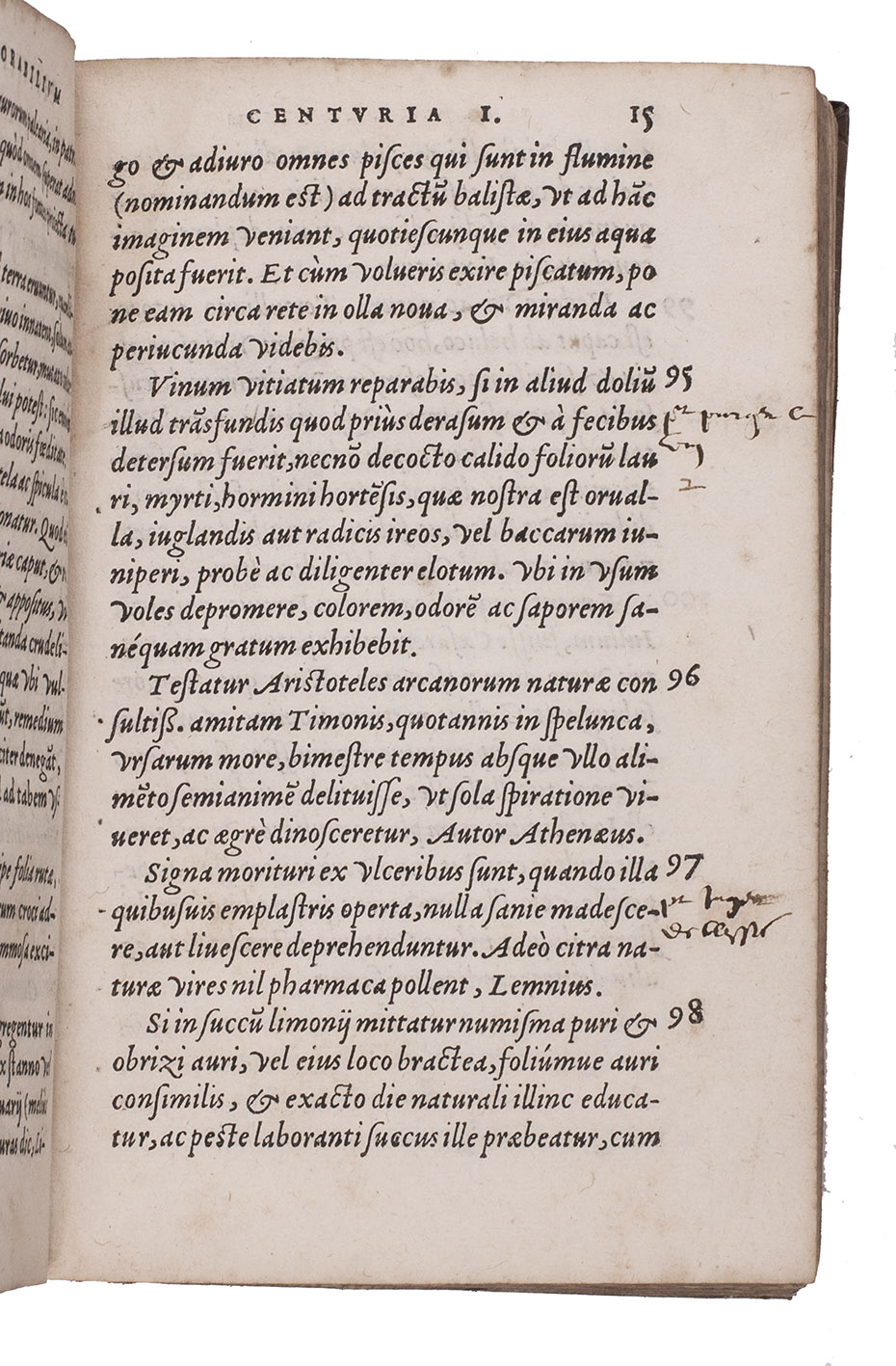 First edition, in the original Latin, of what proved an extremely popular work: 900 medical and other "secrets", including information on astrology, gardening, cosmetics and other subjects, arranged in nine numbered chapters, each containing 100 numbered prose "aphorisms". Like most books of secrets it offers a mixture of science and superstition gathered from a wide variety of ancient and modern sources, many of them named in the aphorisms, and its medicinal recipes served in turn as sources for other authors internationally. It is a beautiful little piece of book production, with finely engraved woodcut decorated initials and headpieces, excellent presswork and the main text set in a lovely Granjon St Augustin (86 mm/20 lines) italic.