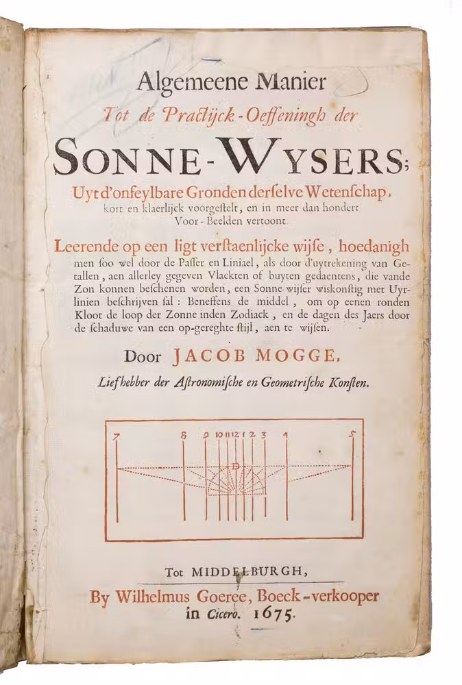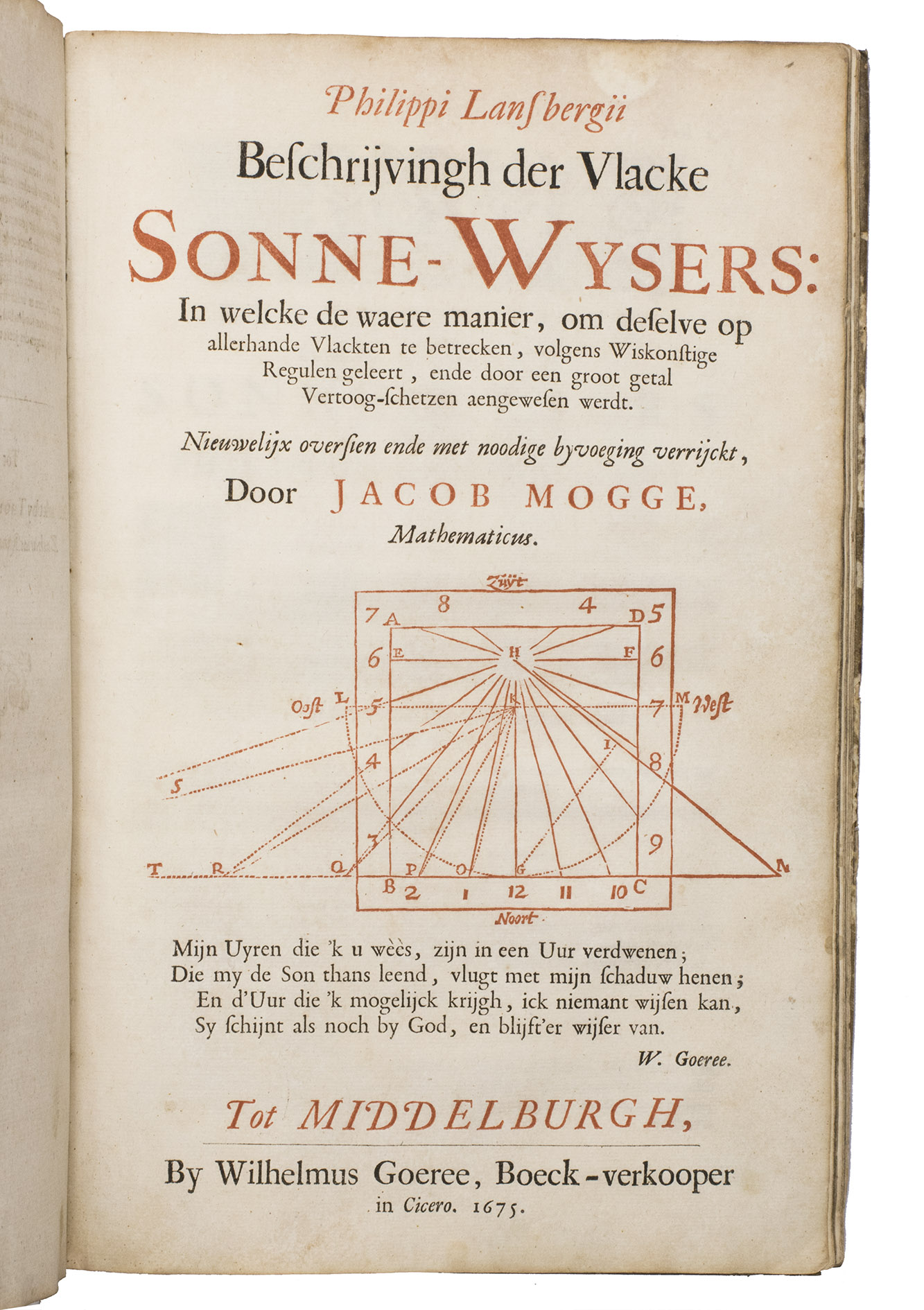 Re-issues by Willem Goeree in Middelburg of the first editions of Jacob Mogge's extensively illustrated general introduction to the making and use of sundials and of his extensively illustrated translation of Lansberge's further account of various sorts of sundials on flat surfaces. Mogge's own work was first published by Zacharias Roman in Middelburg as Inleydinge der Sonne-Wijsers in 1666. Roman had published the first edition of Lansberge's posthumous Latin work on planar sundials, Horologiographia plana, in 1663 and Mogge translated it into Dutch and expanded it for publication together with his own work in matching format and style in 1666. Roman apparently died in or soon after 1667, however, and Goeree must have acquired the remaining stock of these two books, having cancel title-pages printed to re-issue them in 1675. They therefore still include the colophons of the 1666 editions at the end.
