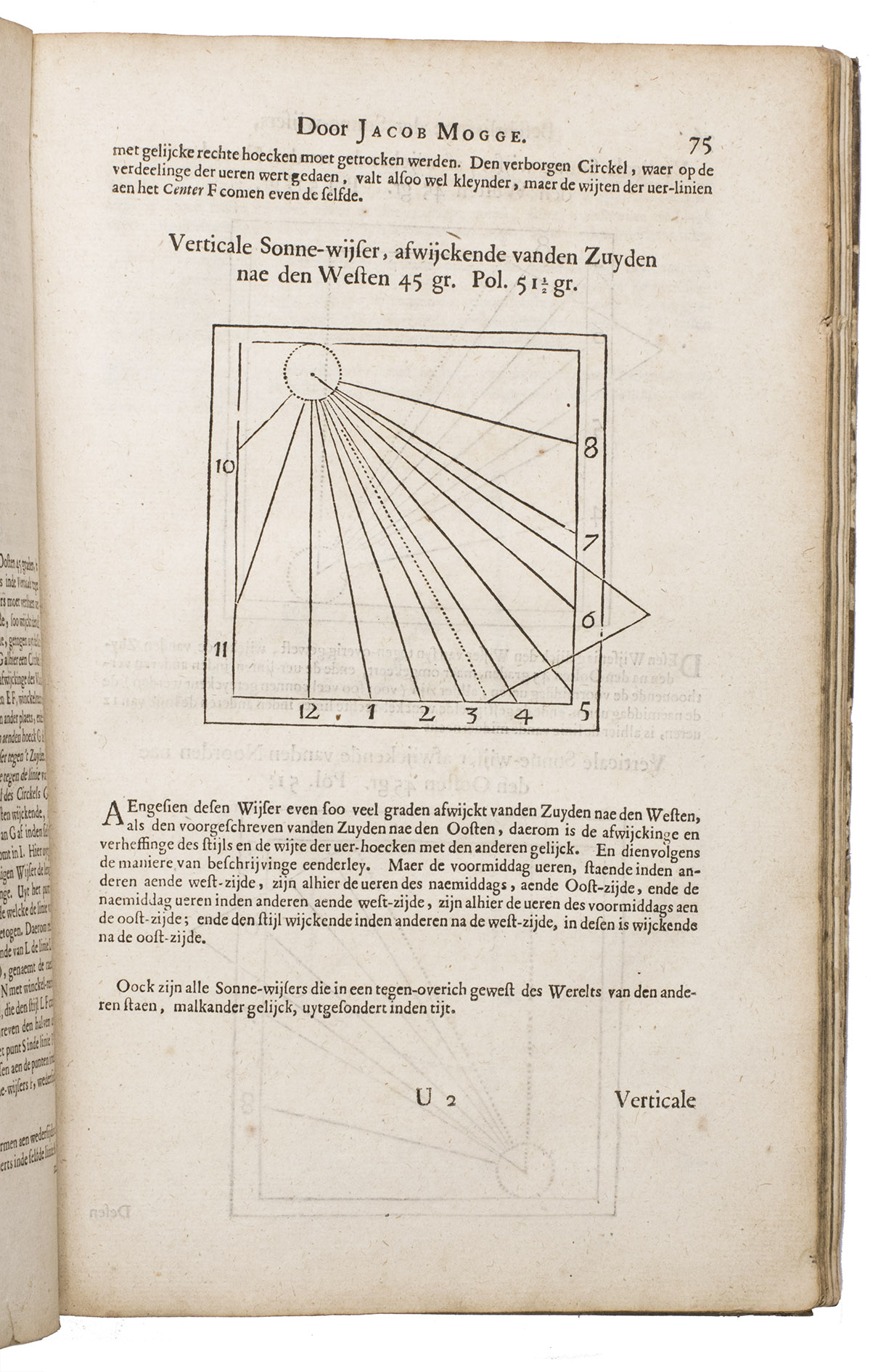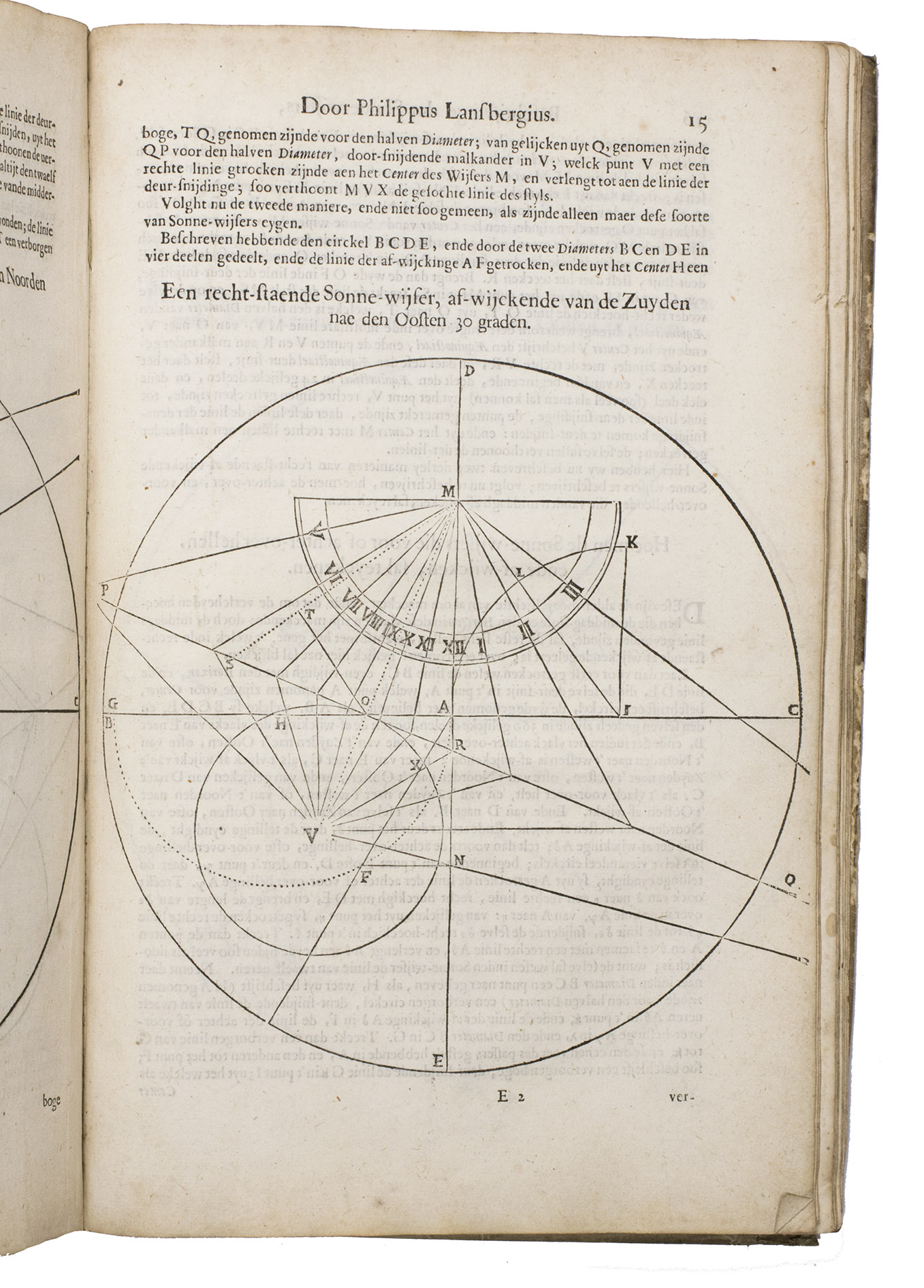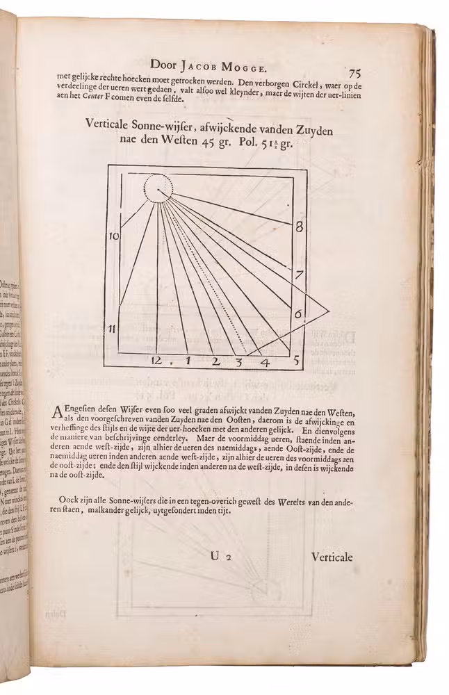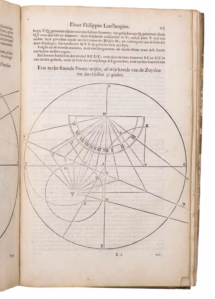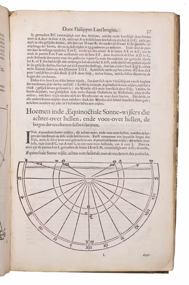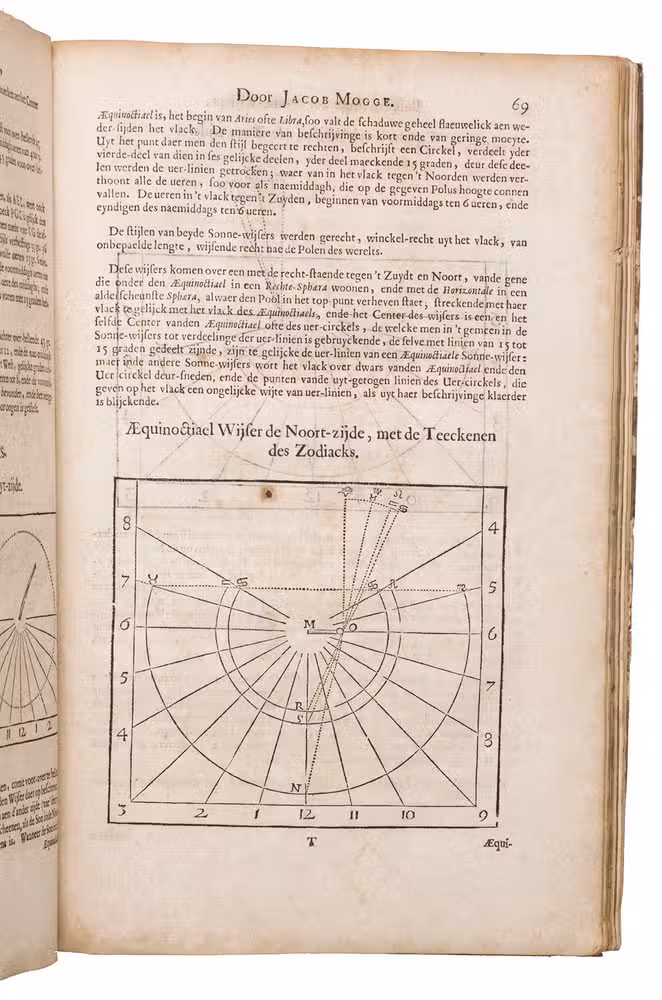 Mogge opens his work with a general introduction to geometry and astronomy, followed by a description of sundials on a flat surfaces and on the surface of the earth. Jacob Mogge (ca. 1613-1669) was a surveyor and map draughtsman active in Zeeland from ca. 1649 to ca. 1666, describing himself as surveyor to the water district, Vrije van Sluis. Lansberge (1561-1632) worked as physician and pastor in Middelburg, Zeeland, but devoted his last years to writing and publishing several important works on astronomy.