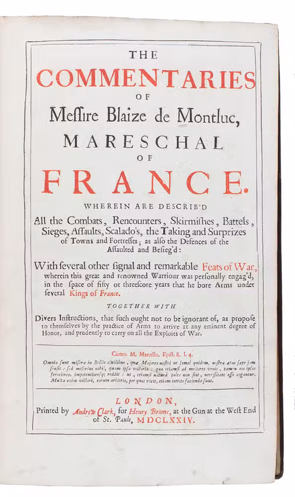 First English edition of Blaise de Monluc's own detailed account of his career, beginning as a foot-soldier and finally becoming Marshal of France, providing a military history of France from 1521 to 1576. He also provides "divers instructions" for anyone wishing to bear arms with "any eminent degree of honor" and "prudently" fight in wars. It therefore also serves as a practical handbook of military techniques and tactics. The present translation is by Charles Cotton (1630-1697), an English poet who dedicated the work to Philip, Earl of Chesterfield and Lord Stanhope, and also contributed one of the preliminary verses. Blaise de Monluc (1501-1577) began his career as an archer and foot soldier in the reign of King Francois I (1494-1547), who played a major role in bringing Renaissance culture and technical knowledge to France, inaugurating its golden age.