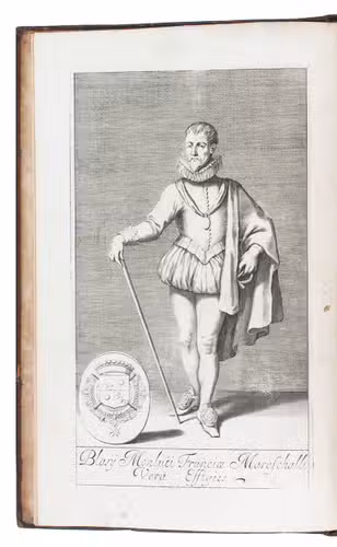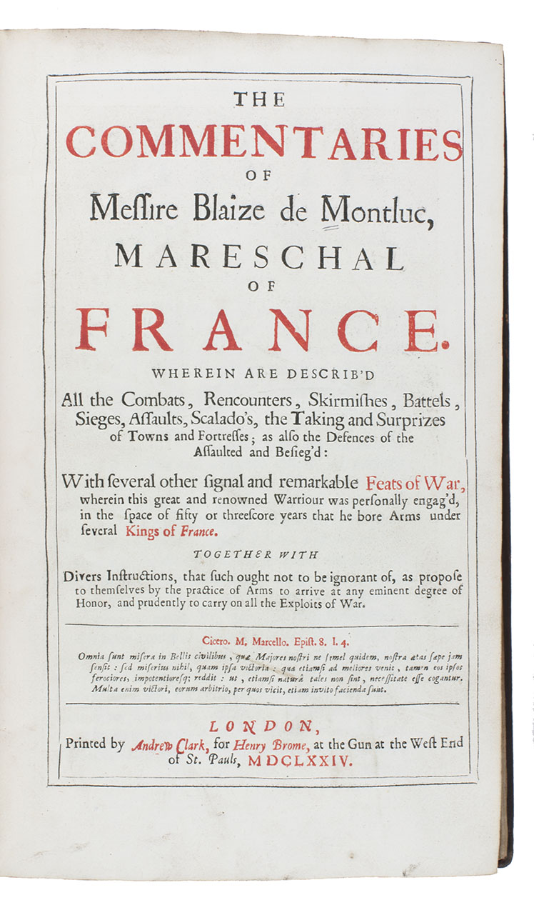 With two engraved bookplates. With a couple small abrasions on the frontispiece, but otherwise in very good condition, with only some minor defects. The binding has been rebacked and the boards show some restorations. A colourful and insightful account of military actions, tactics and techniques in Renaissance France. ESTC R37642; Wing M2506; cf. Sloos, Warfare and the age of printing 03051.