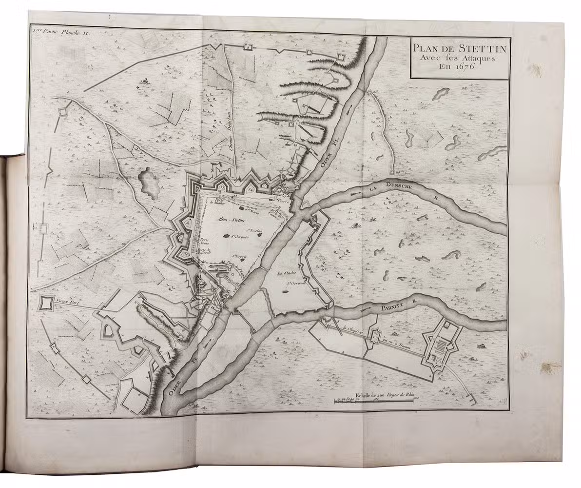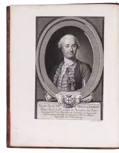 With several library- and deaccession stamps. Occasionally some minor foxing and some marginal (water) stains. Some plates slightly browned and a few with frayed edges. Overall in very good condition and with wide margins. Bindings somewhat rubbed, some tiny wormholes, but still firm and good. Encyclopaedia Brittanica, Marc-René, marquis de Montalembert (online); Jähns, p. 1863; Jordan 2561; Sloos, Warfare 08168.