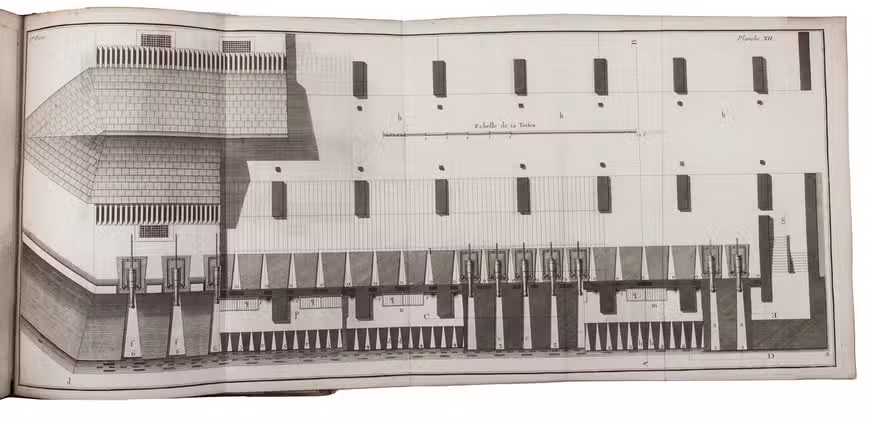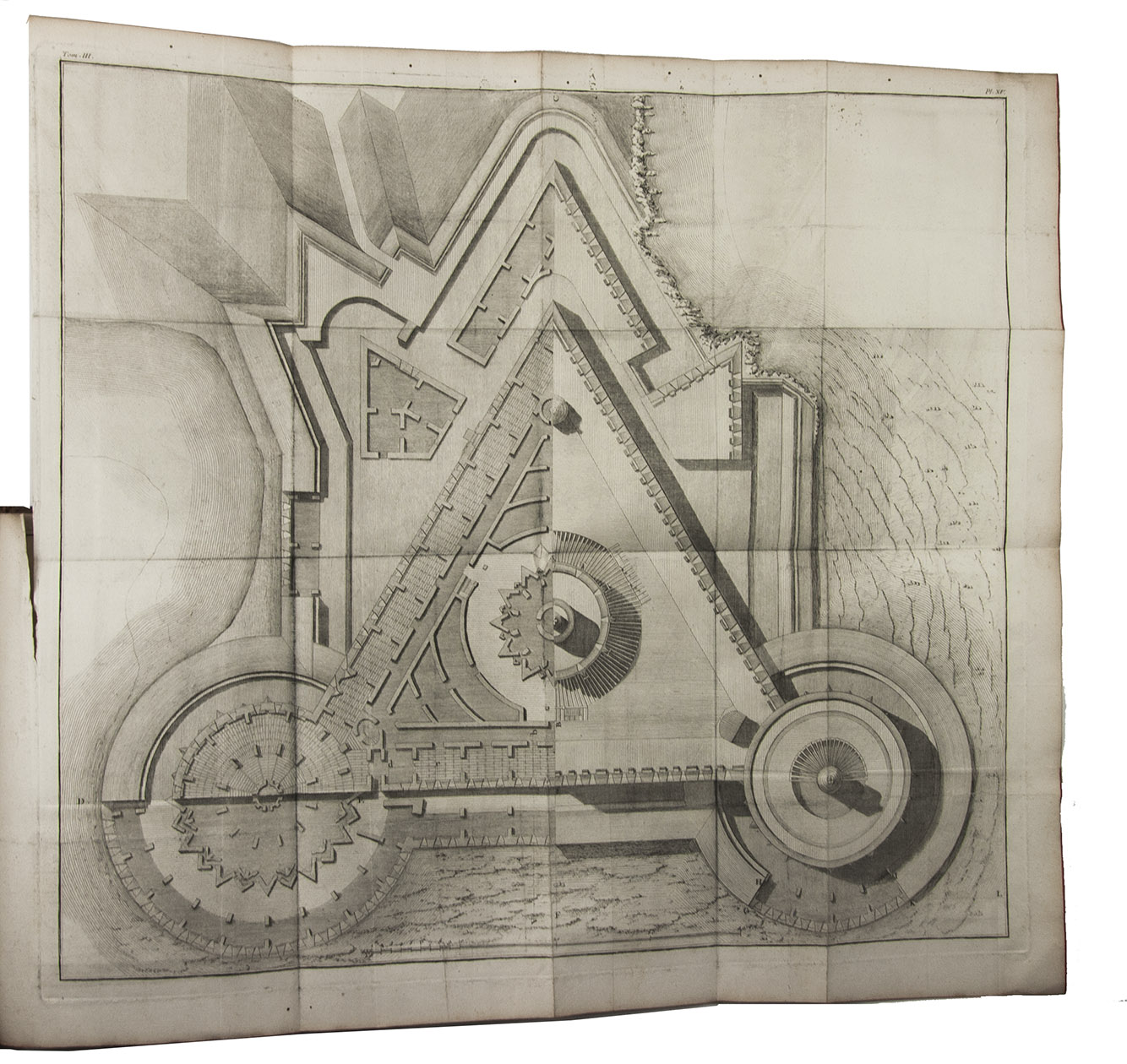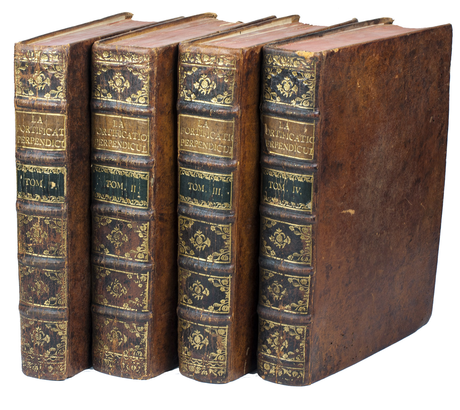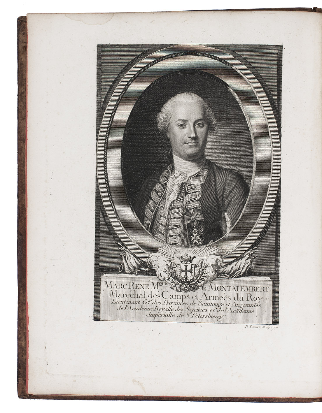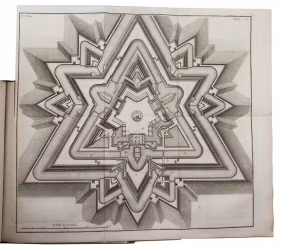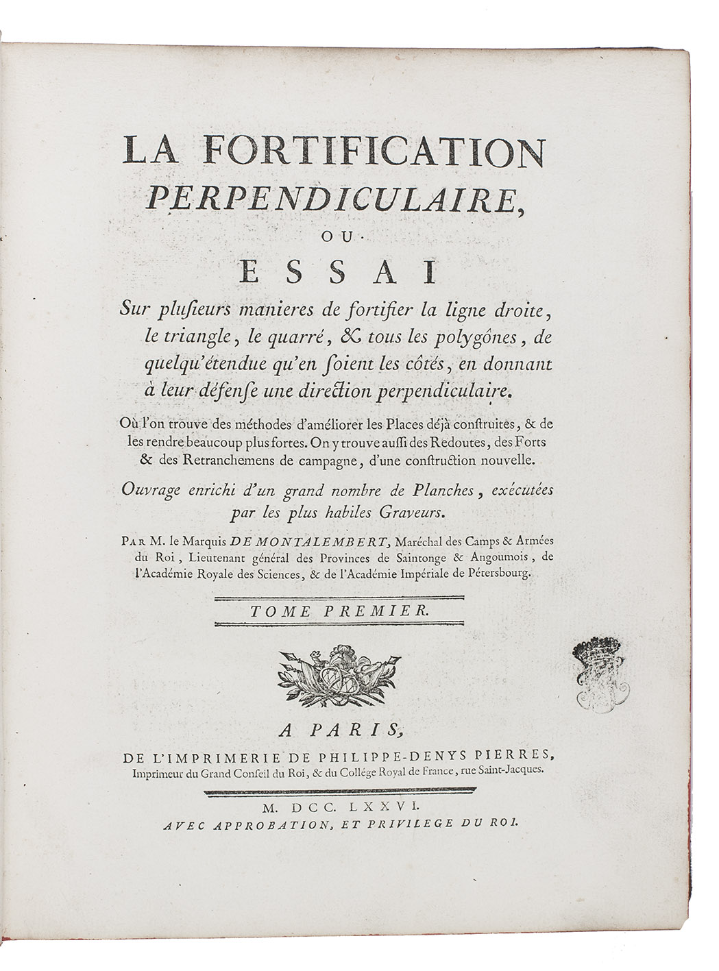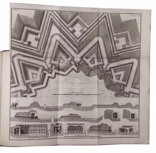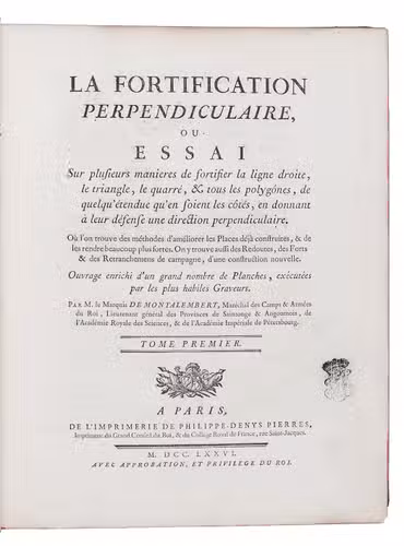 First edition of a very extensive work on fortification, by the French military engineer Marc-René, marquis de Montalembert (1714-1800). "Viewing fortresses as nothing more than immense permanent batteries designed to pour overwhelming fire on attacking armies, Montalembert simplified the intricate geometric designs of Vauban and relied on simple polygonal structures, often with detached peripheral forts instead of projecting bastions. The fortifications at Anklam, Stralsund, Aix-en-Provence, and Île d'Oléron were among his most prominent creations." (Encyclopaedia Brittanica). The first volume is devoted to the origins and progress of fortification, the others to the usefulness, construction, attack, defence and other aspects of fortresses. A fifth volume with 17 folding plates, added in 1784, is not included in the present set, which was probably issued before it appeared.