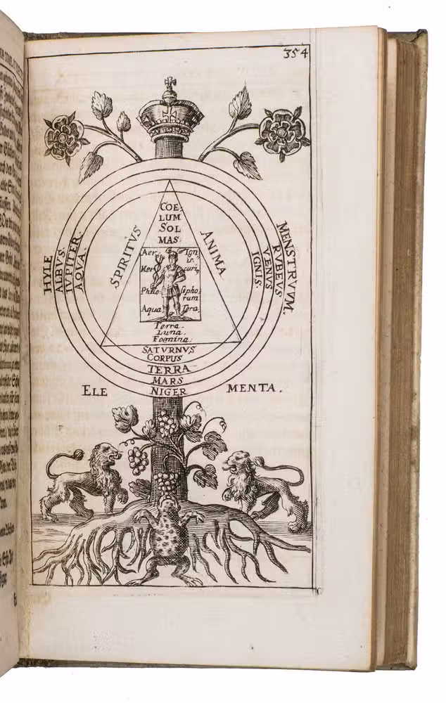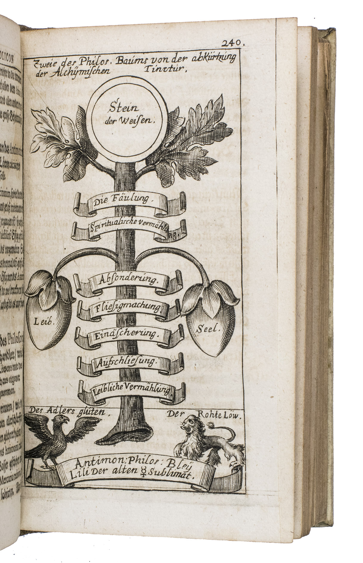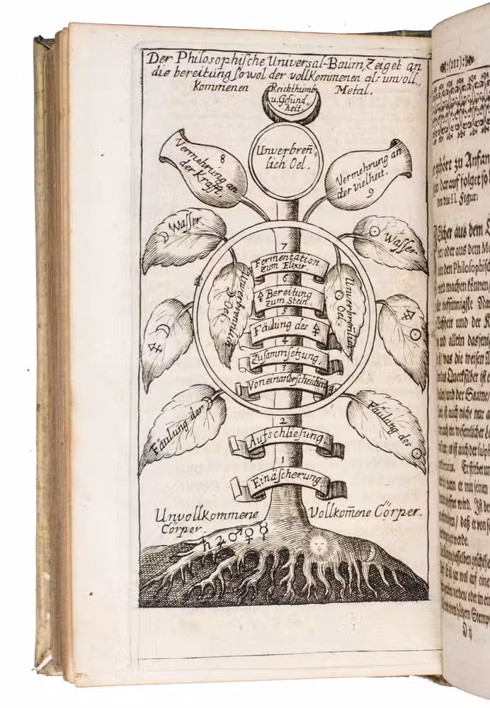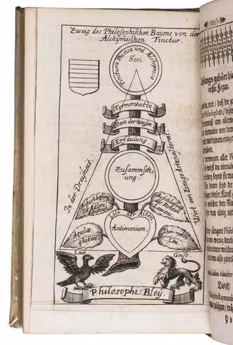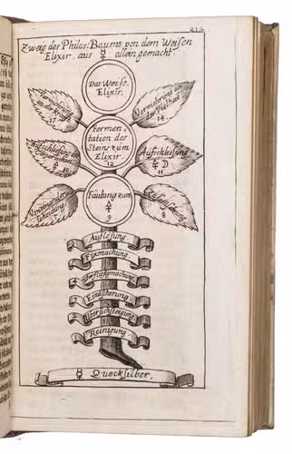 The first part of the present compilation is a German translation of Traittez du vray sel secret des philosophes (1621) by De Nuisement. This work discusses salt, one of the four basic elements in alchemy. It was seen as a stable, pure element, which could provide the foundation for alchemical transformations. According to De Nuisement, the "true salt" is a secret fire that comes from the sun, which he explains in more detail in his tract. The second part of the work contains all eight alchemical treatises by Norton. They explain various alchemical processes, including the process of creating the vegetable, mineral, animal, mixed and transparent stones, as well as the elixir of life. This part of the work is illustrated with full page engravings of the alchemical processes, depicted schematically in the shape of trees.