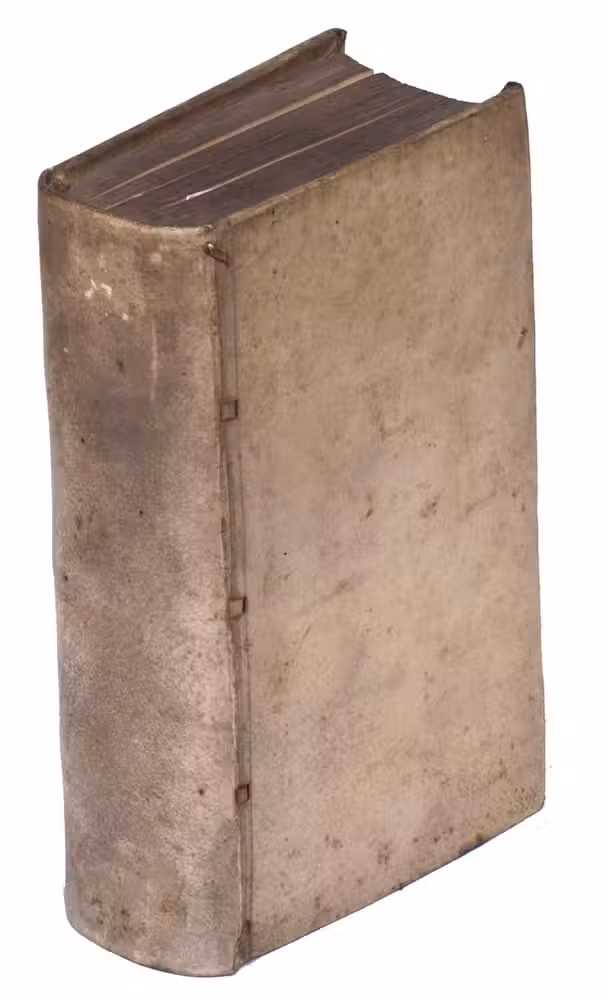 The vellum is somewhat soiled, with a brown ink stain on the back board, remnants of a paper label at the head of the spine. The work is lightly browned throughout, pp. 295-298 are detached, but still present. Otherwise in good condition. Brüning 2158; Caillet 7686; Duveen p. 410; Ferguson II, p. 102; USTC 2584629 (7 copies); VD17 3:304753Z (6 copies); WorldCat 14297390, 69152517, 457937950.