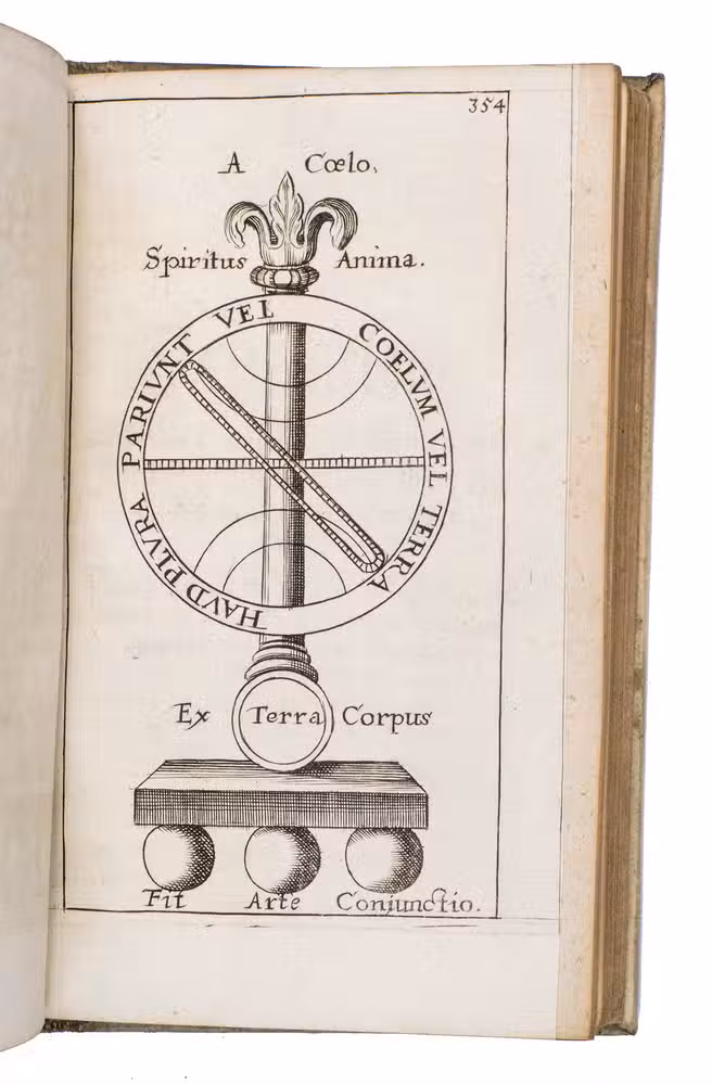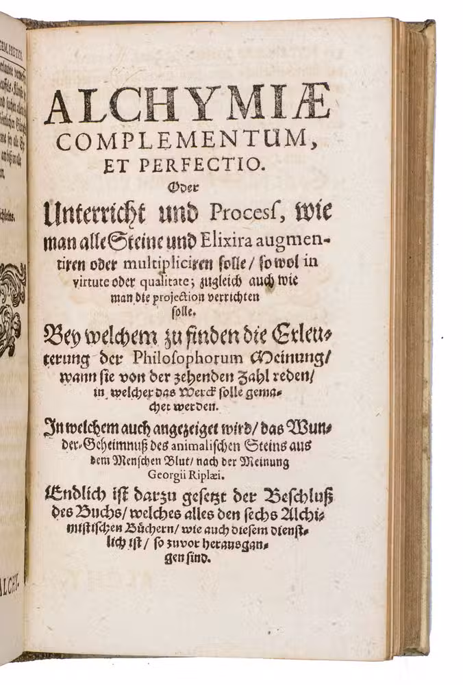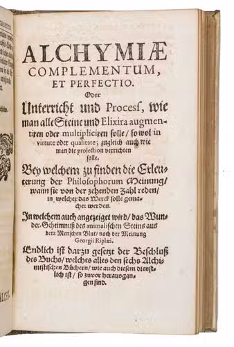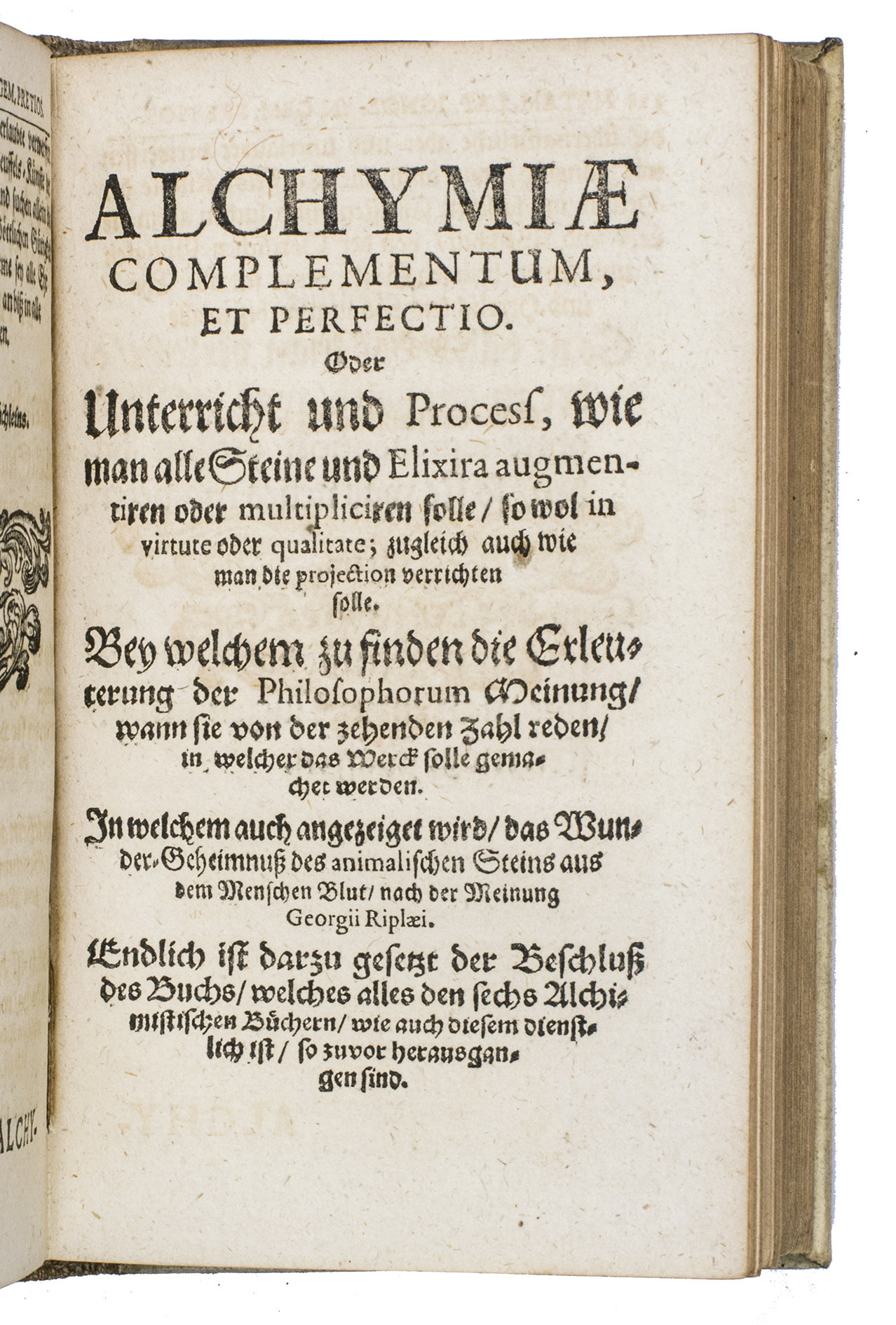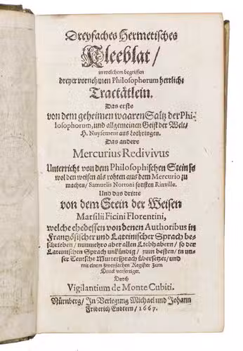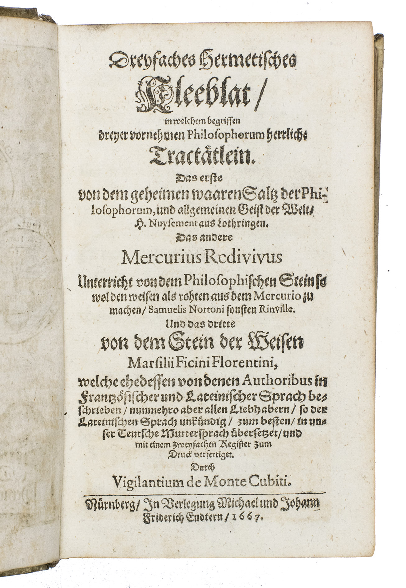 First edition of a scarce compilation of important alchemical tracts, containing the first known edition of a work attributed to Marsilio Ficino (1433-1499) about the philosopher's stone. The other tracts were written by Samuel Norton (1548-1621) and Clovis Hesteau de Nuisement (also known as Jacques de Nuysement, ca. 1550-1623/24), and both appear here in German translation for the first time. According to the title page, the present edition and translation of the texts was the work of a certain Vigilantus de Monte Cubiti (dates unknown), presumably an editor and translator operating under a pseudonym. The work rarely appears on the market, as we have only been able to find four other copies in recent sales records.