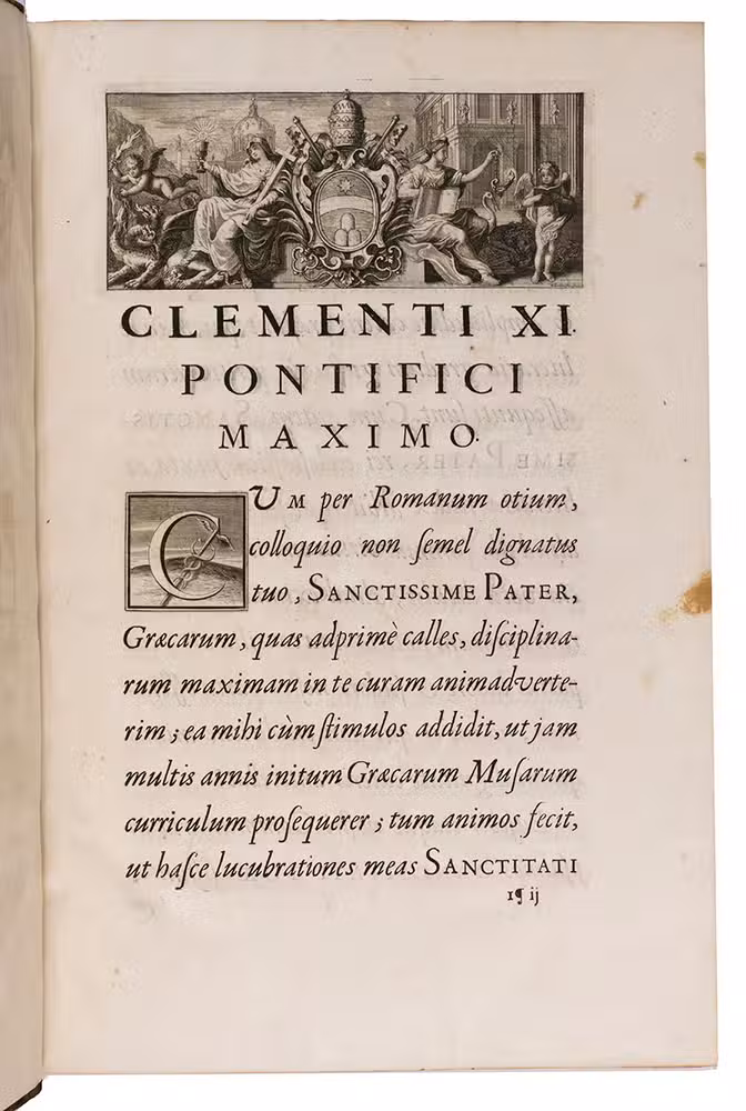 Paris, Claudius Rigaud, 1707. 2 volumes. Folio. With 4 engraved plates, and 3 woodcut illustrations in the text. Each volume with an engraved headpiece, the first incorporating the coat of arms of Pope Clement XI, and the second that of Jean-Paul Bignon. Contemporary calf, richly gold-tooled spine and binding edges. [14], XL, [1], [1 blank], 732, [26], [2 blank]; [16], LXVIII, 112, [2], I-XXIV, 113-593, [26], [1 blank] pp.