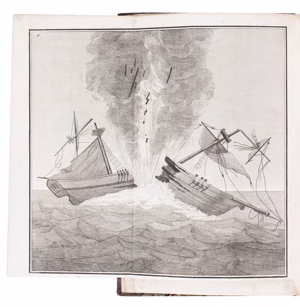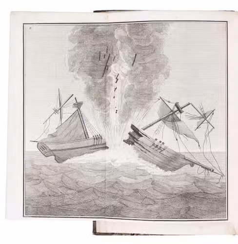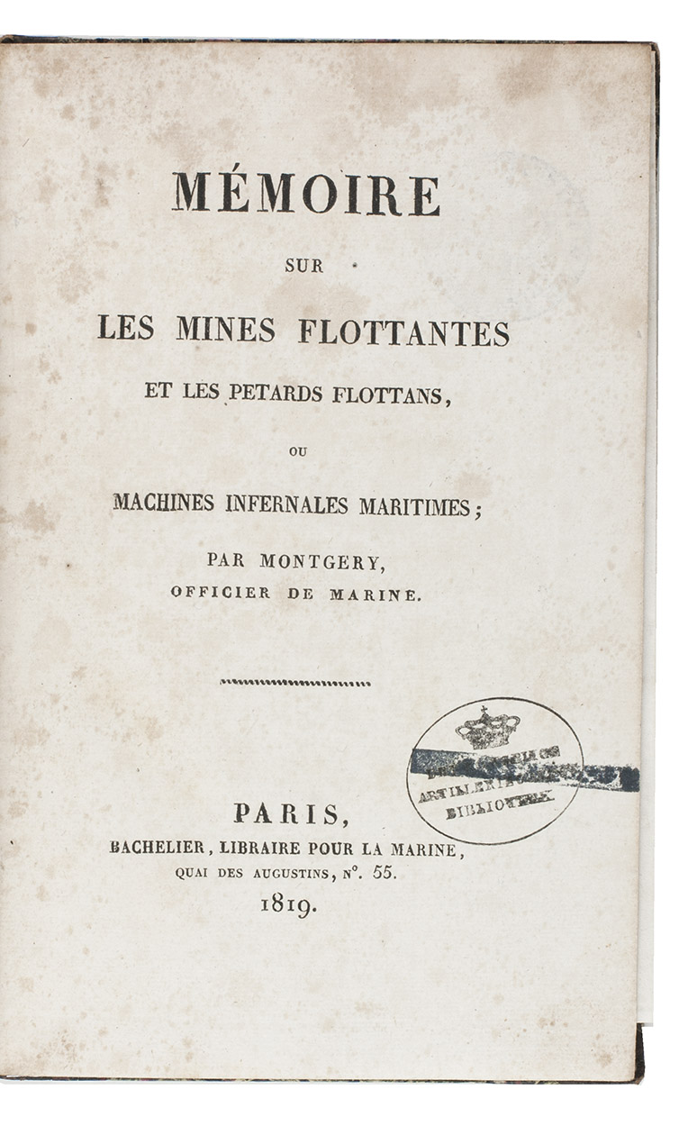 Paris, Bachlier, libraire pour la marine (printed by De Fain), 1819. 8vo. With a finely engraved folding copperplate of a ship being blown up by a mine (16.5 x 17.5 cm). Lacking the half-title and the final leaf with the publisher's list of books, but with the folding plate, often lacking. Contemporary half tree calf, stormont marbled sides. [2], 78 pp.