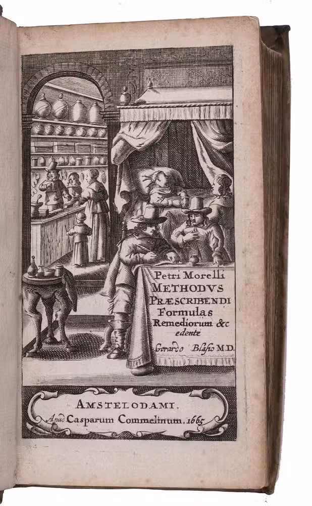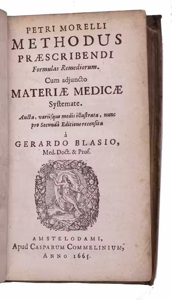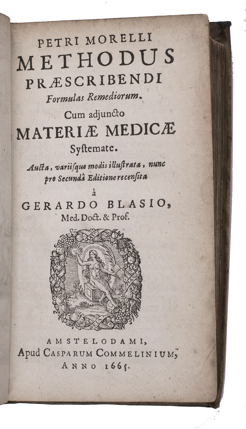 Very rare second edition printed in the Netherlands of a work on medicines prescriptions by Pierre Morel. It is divided into two sections, the first dealing with different types of medicines and when to prescribe them, distinguishing between medicines with more general effects and some very specific medicines. Also included is a recipe for toothpaste. The second half is a materia medica. The present work was edited by the Dutch physician and anatomist Gerardus Blasius (1627-1682).
