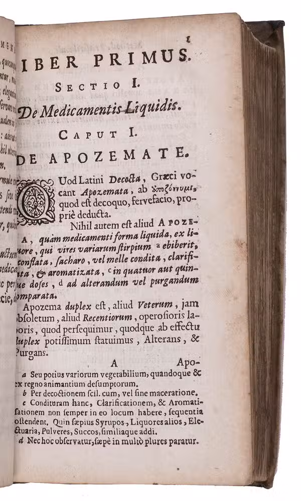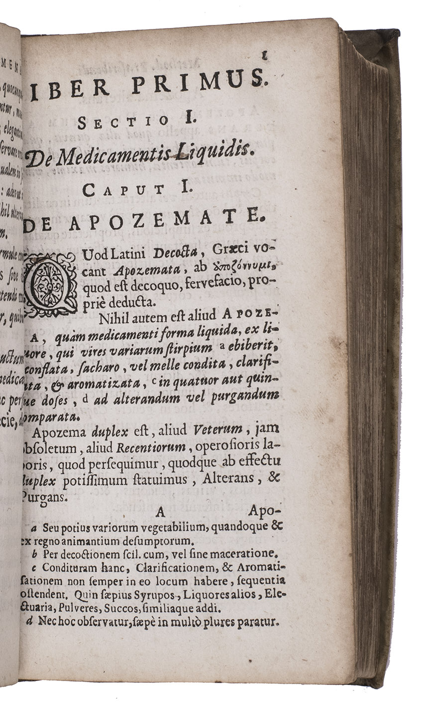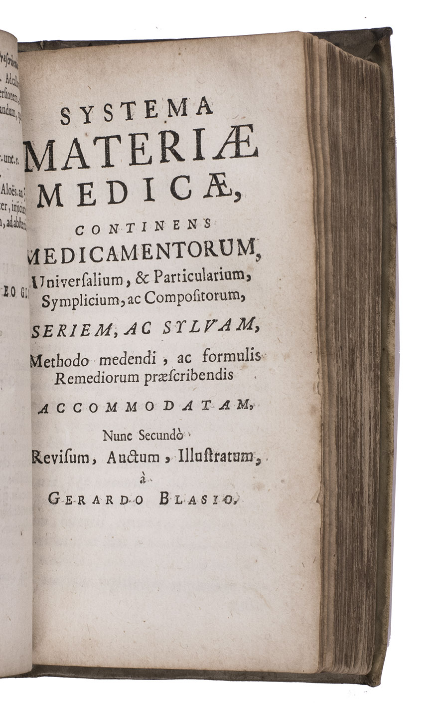 Amsterdam, Casparus Commelinus, 1665. 12mo. With engraved title-page, showing the interior of a pharmacy, woodcut device on title-page and letterpress folding table. Contemporary vellum. [36], 578, [6], [6 blank] pp.