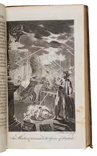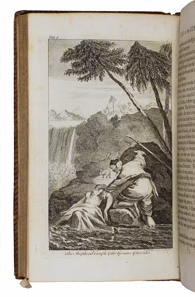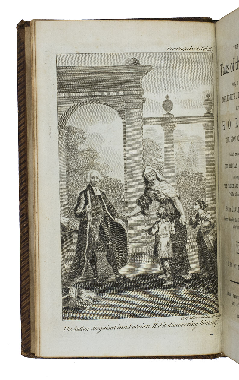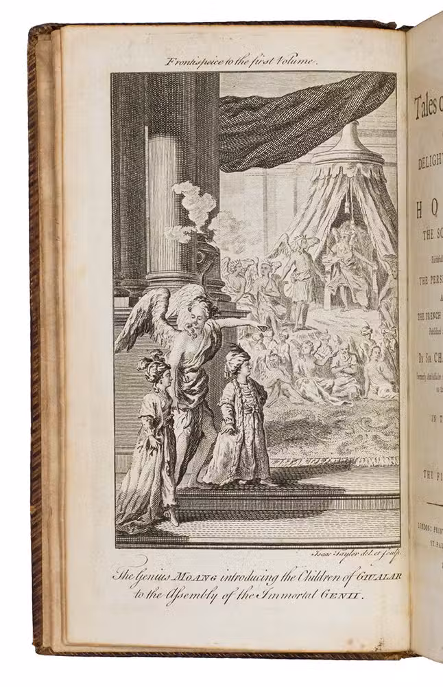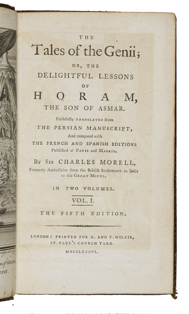 Rare edition of a series of stories based on those of the Arabian nights, first published in 1764 and written by James Kenneth Ridley (1736-1765) but issued under the pen name "Sir Charles Morell", supposedly a former ambassador to the Great Mogul representing the British settlements in India. Ridley's Tales were allegedly composed by an imam named Horam and translated from a Persian manuscript; in actuality, they were products of Ridley's imagination. They belong to a genre of imitation orientalia popular in the 18th century.