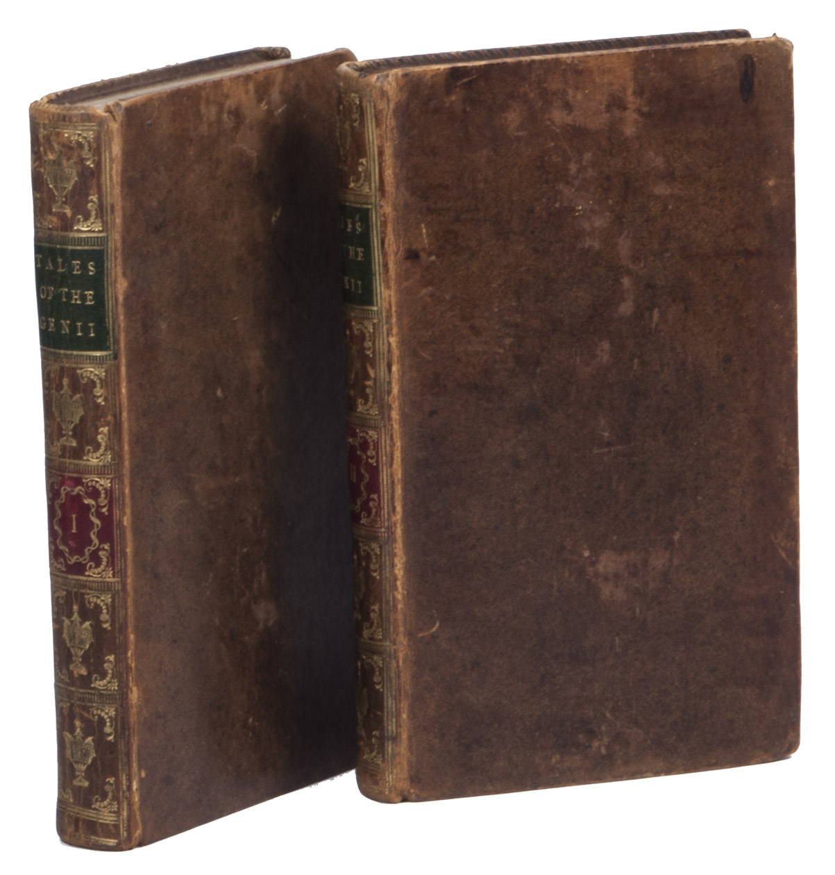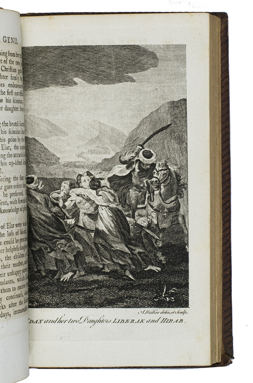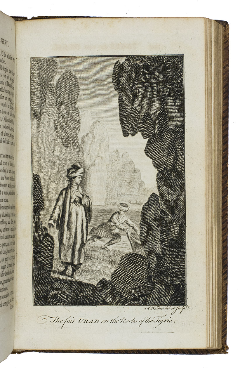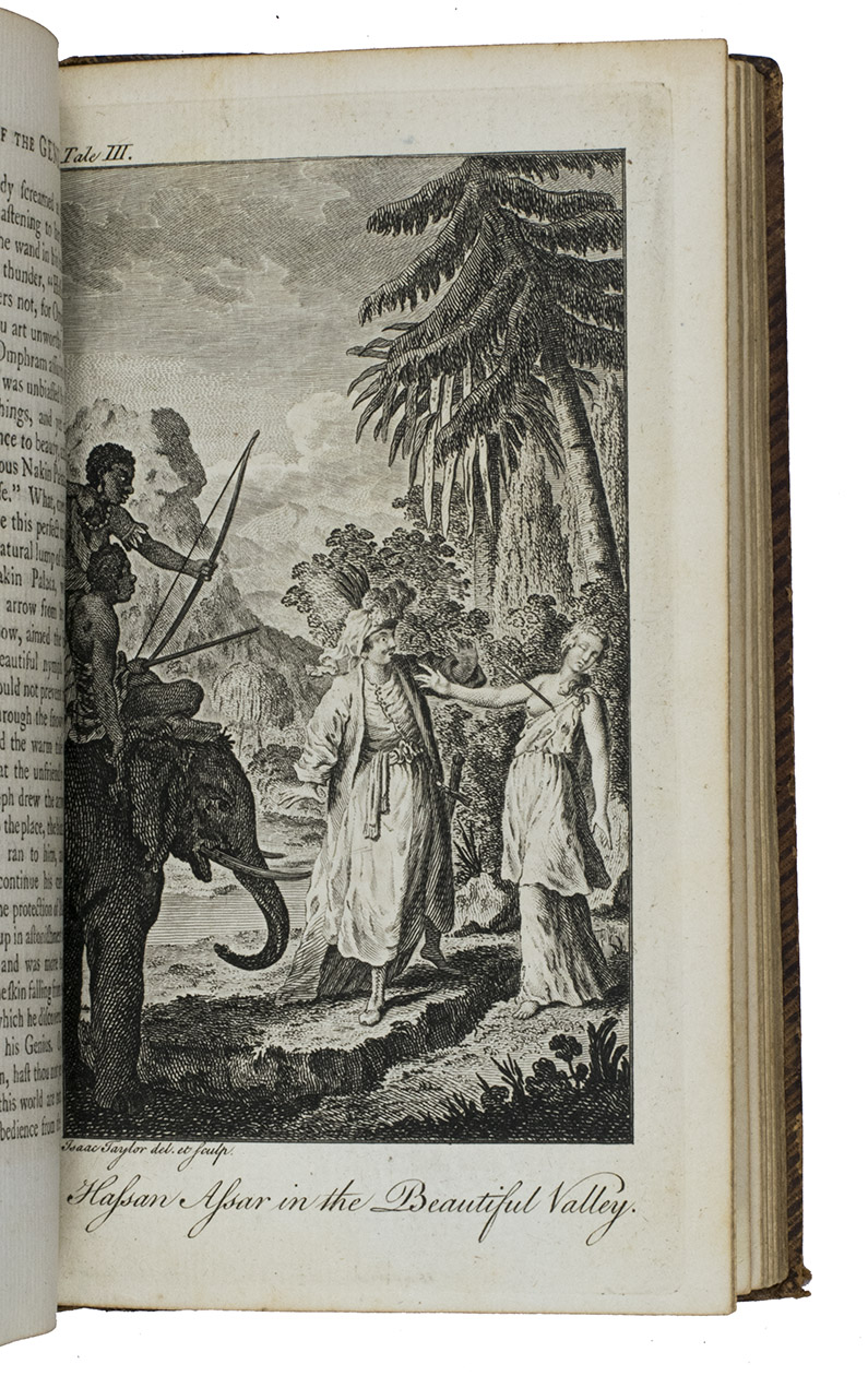 London, printed for G. and T. Wilkie, 1786. 2 volumes. 12mo. With 2 letterpress title-pages and 14 engraved plates (including the 2 frontispieces) illustrating the various tales. Near contemporary, uniform calf (ca. 1800?), gold-tooled smooth spines in 6 fields, with a green (title) and red (volume) label in the 2nd and 4th fields, gold-tooled board edges, blind-tooled turn-ins. xxxvi, 285, [3 blank]; [1], [1 blank], 338 pp. plus 2 frontispieces and 12 other plates.