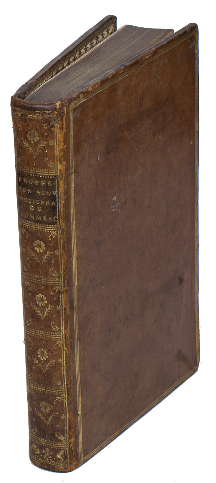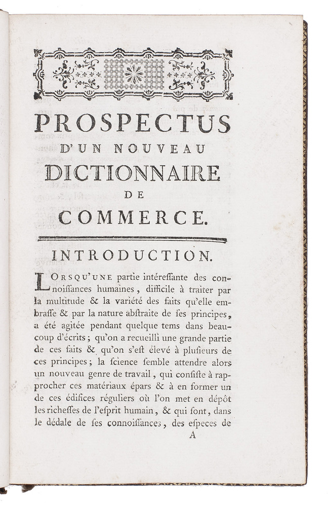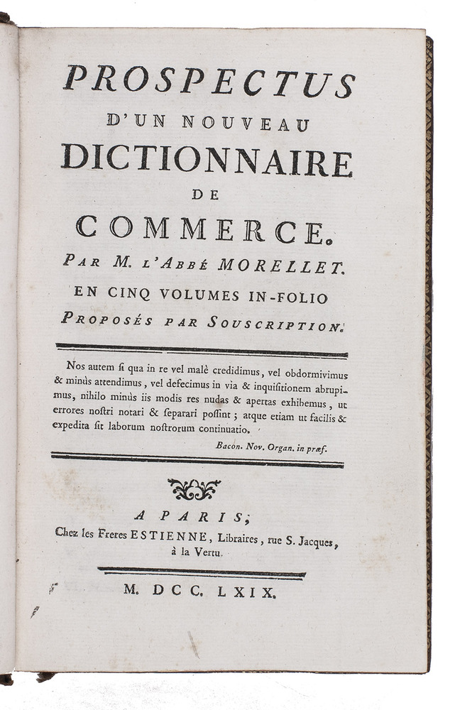 Fine copy of an interesting and very extensive prospectus, by André Morellet (1727-1819), announcing a new commercial dictionary in 5 folio volumes and calling for subscriptions. He first explains why a new dictionary is needed, extensively describing the first commercial dictionary in Europe of Jacques Savary des Brûlons. He also mentions English dictionaries of commerce. He found all these dictionaries far from complete, omitting many interesting details and says they are not as universal as they claim. So in the present prospectus Morellet proposes a new, complete, universal commercial dictionary, and describes the differences between his planned dictionary and the existing ones. The prospectus is very detailed and well organised, no doubt because he needed to convince his public of the need for such an extensive and therefore probably expensive dictionary. Morellet worked on his dictionary for 20 years before the French Revolution interrupted him, but never published the dictionary itself.