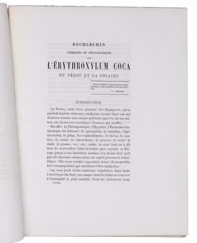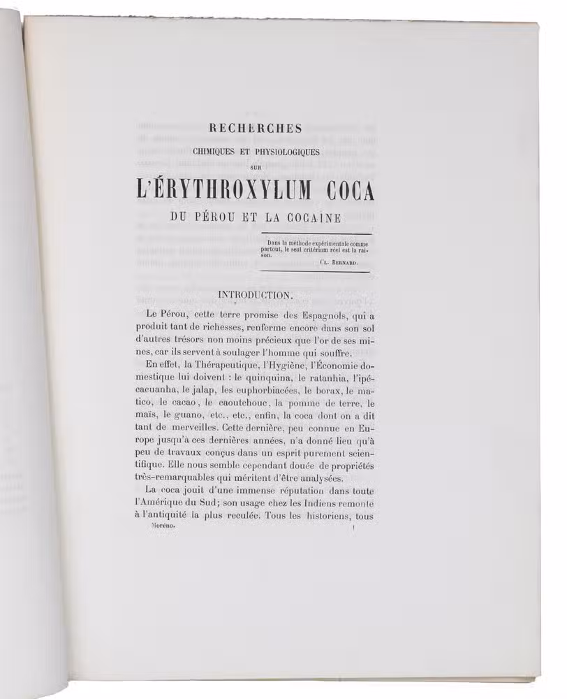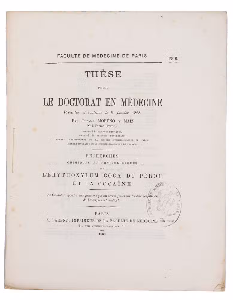 This exceptionally rare doctoral thesis is widely considered to be the first ever study on the physical effects of cocaine. It was published less than a decade after cocaine was first created (1860). The research was conducted by Thomas Moréno y Maïz (dates unknown), a Peruvian surgeon who went to Paris for post-graduate training. His pioneering thesis has been well-studied. Nevertheless, there are very few copies of it in either libraries or on the market.