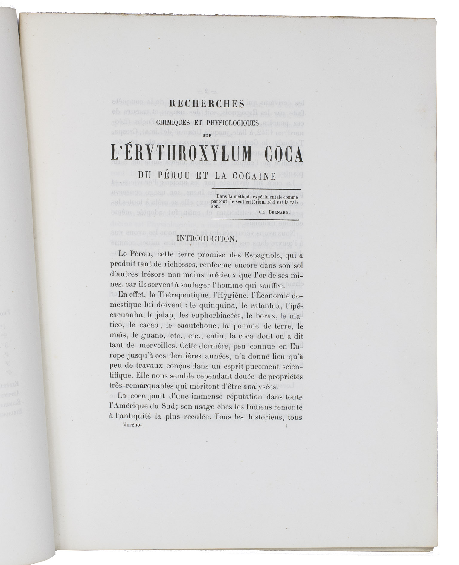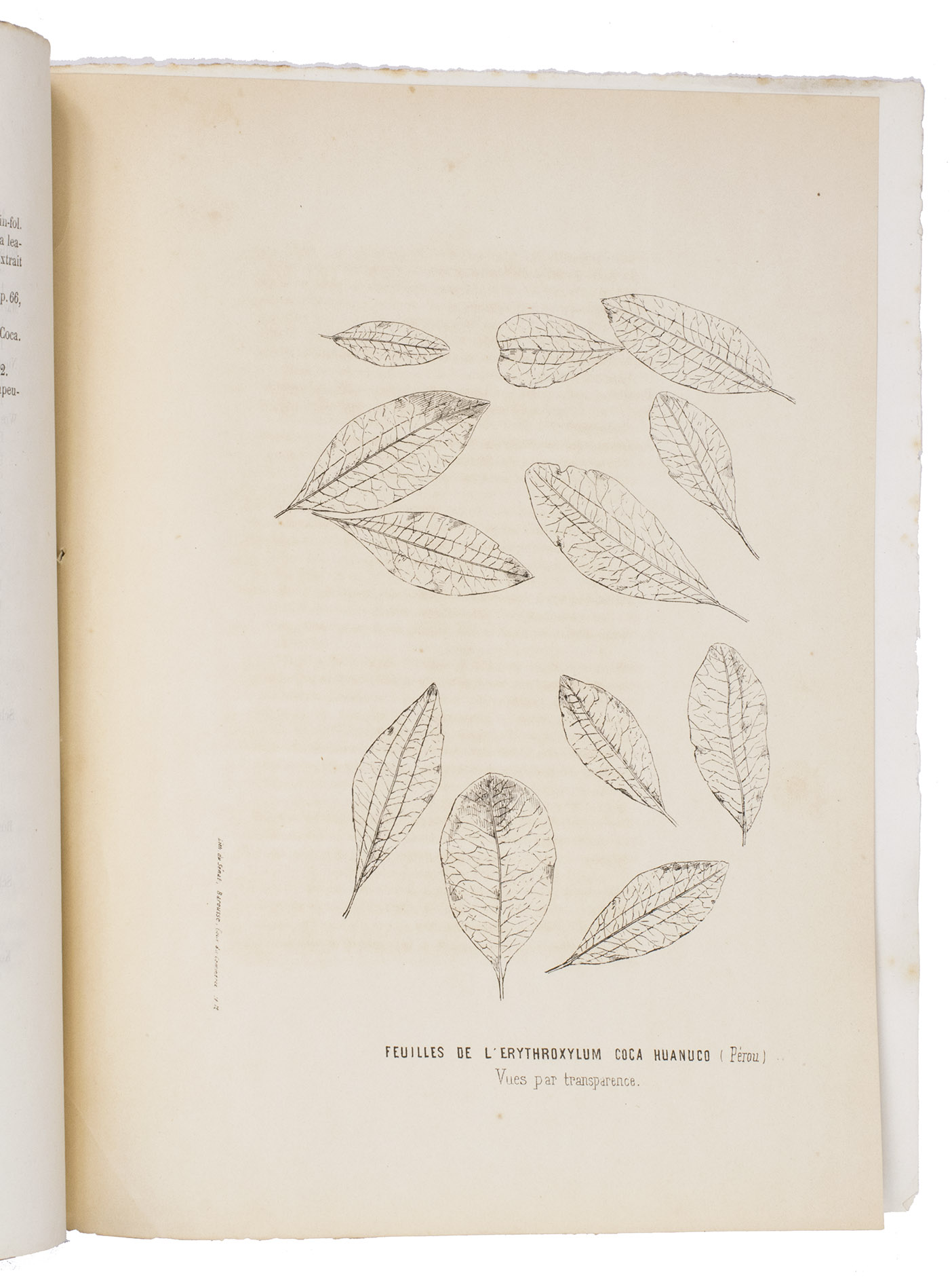 Paris, A. Parent, imprimeur de la faculté de médecine, 1868. 4to. With a lithographic plate of coca leaves and 7 figures in the text showing the tension on the arteries after ingesting coca in various ways. Side stitched through 2 holes. [8], 90, [2] pp.