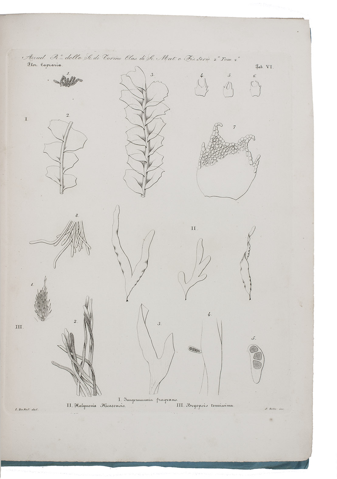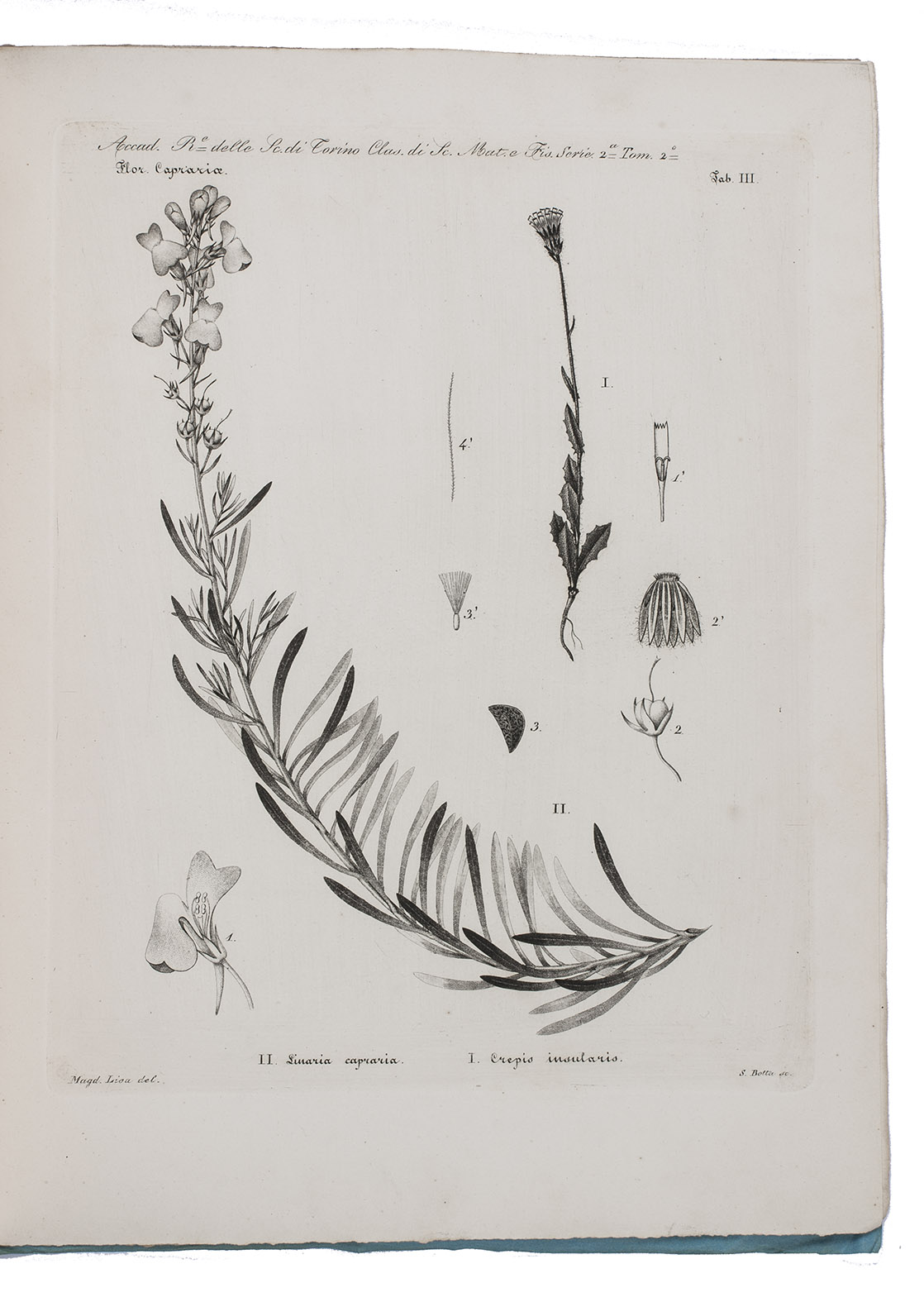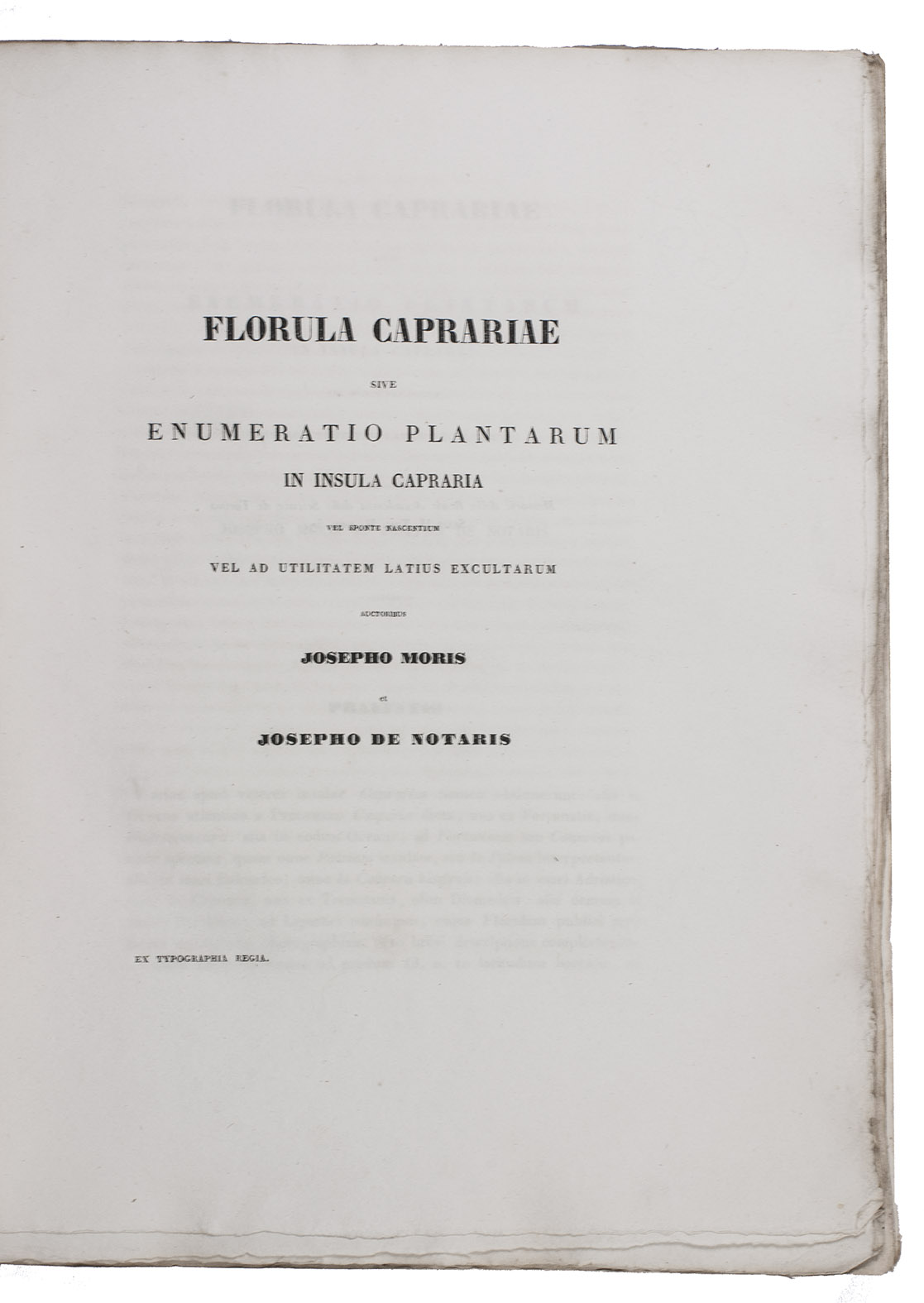 First issue of a detailed flora of the isle of Capraia, one of the seven islands of the Tuscan Archipelago, belonging to the Province of Livorno. Moris's six-page Stirpes Sardoae novae aut minus notae, a supplement to the first volume of his Flora Sardoa (1837), is included as an appendix with its own title-page at the end. The Stirpes Sardoae also appeared in the same year and the Florula Capraria in the following year in the Memorie della Reale Accademia delle Scienze di Torino. The plates were engraved by S. Botta after Magd. [=Domenico?] Lisa and Giusppe de Notaris, and the three after Lisa are remarkable for the subtlety of their aquatint shading.