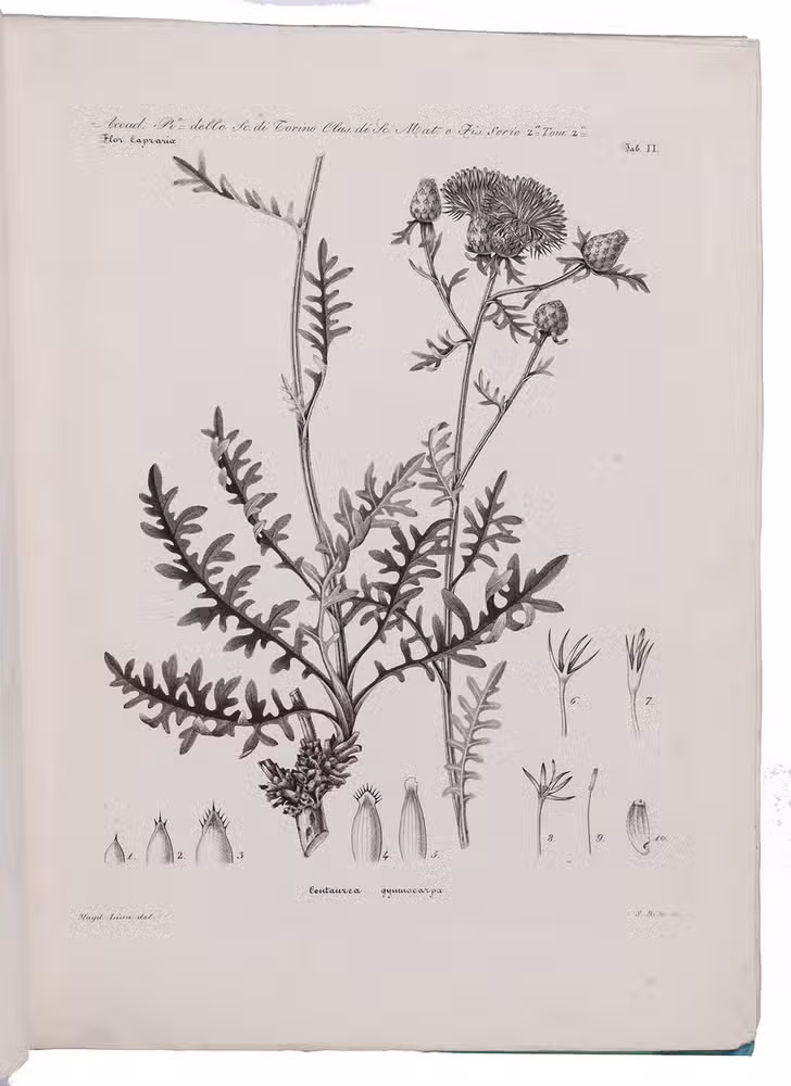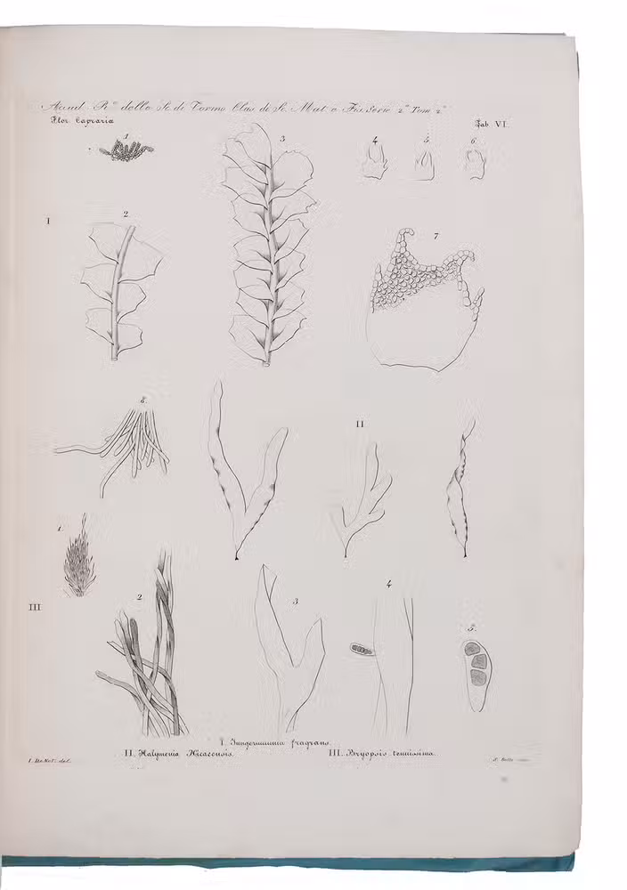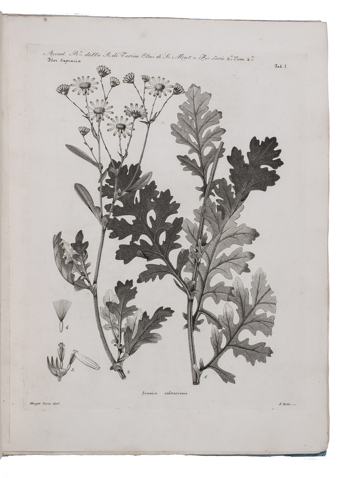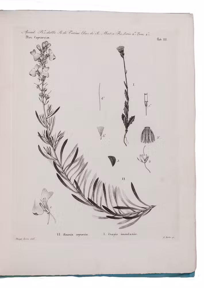 First issue of a detailed flora of the isle of Capraia, one of the seven islands of the Tuscan Archipelago, belonging to the Province of Livorno. Moris's six-page Stirpes Sardoae novae aut minus notae, a supplement to the first volume of his Flora Sardoa (1837), is included as an appendix with its own title-page at the end. The Stirpes Sardoae also appeared in the same year and the Florula Capraria in the following year in the Memorie della Reale Accademia delle Scienze di Torino. The plates were engraved by S. Botta after Magd. [=Domenico?] Lisa and Giusppe de Notaris, and the three after Lisa are remarkable for the subtlety of their aquatint shading.