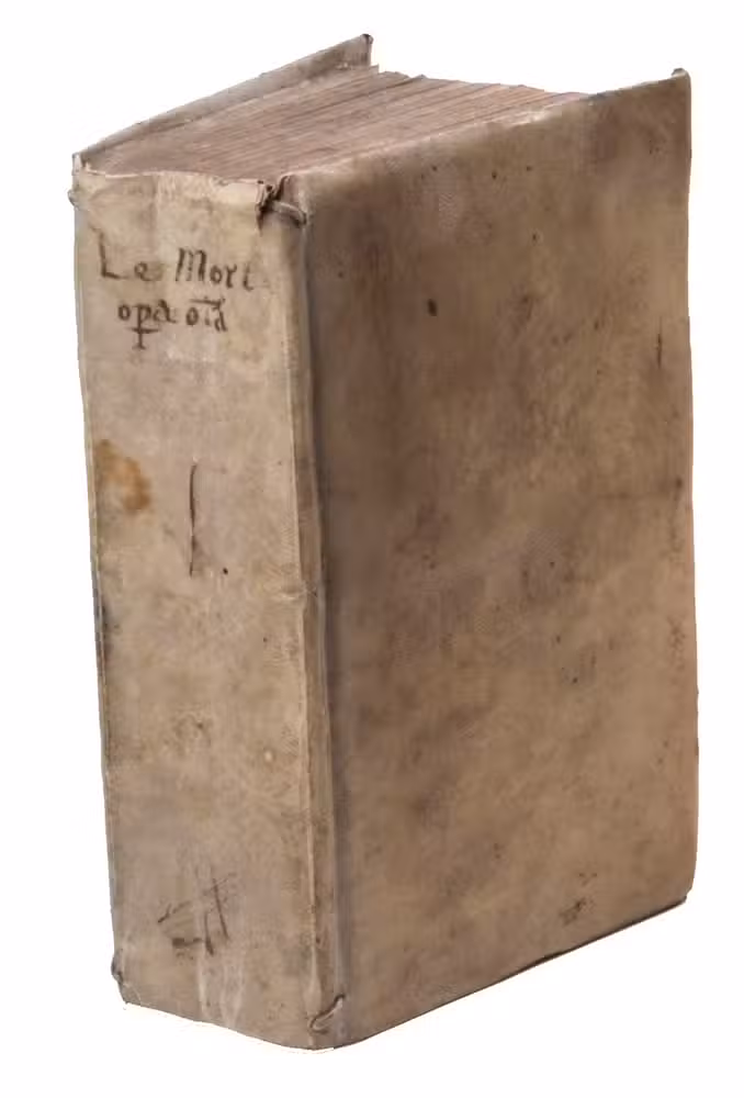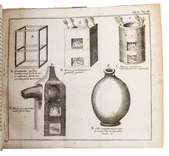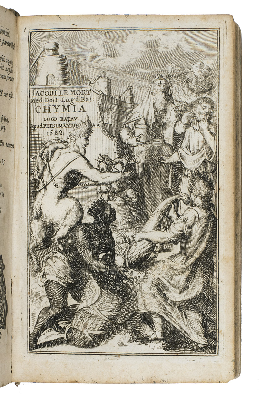 Leiden, Petrus vander Aa, 1688. 8vo. With beautiful allegorical frontispiece (also by Adriaan Schoonebeek?), dated 1688, 2 folding engraved plates of furnaces and distilling equipment and utensils, Vander Aas woodcut herald angel device, initials and head- and tailpieces. Contemporary vellum over boards, title in ink on spine: "Le Mort opera omnia". 14], 256, [34]; [36], 366, [62] pp.