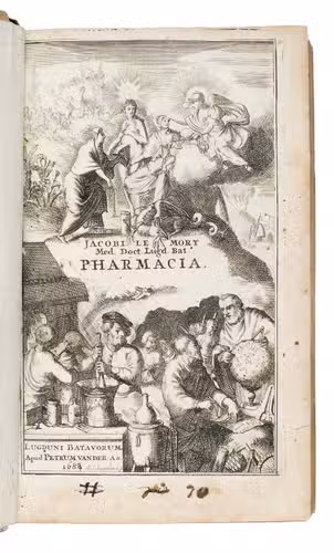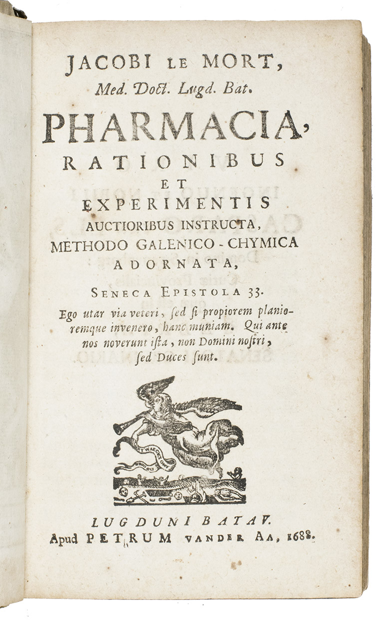 Pharmacia, rationibus et experimetis auctoribus instructa, methodon Galenico-chymica adornata.Leiden, Petrus vander Aa, 1688. With a frontispiece engraved by Adriaan Schoonebeek (with an allegorical scene above and an apothecary and others at work below), originally dated 1684, changed to 1688, and Vander Aas herald angel device on title-page.