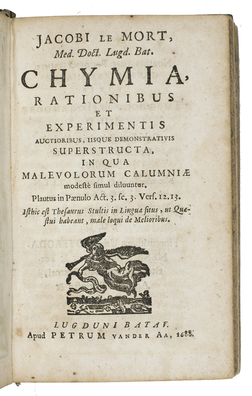 With: MORT, Jacobus Le. Chymia, rationibus et experimetis auctoribus, iisque demonstrativis superstructa, in qua malevolorum calumniate modestè simul diluuntur.