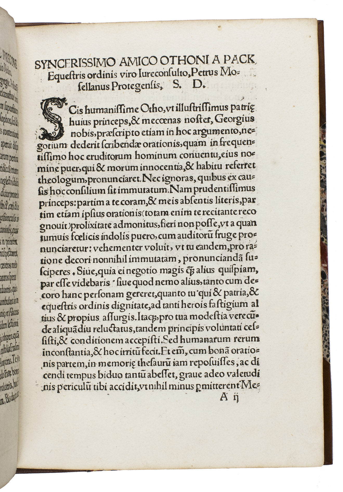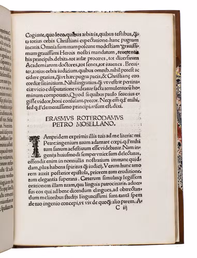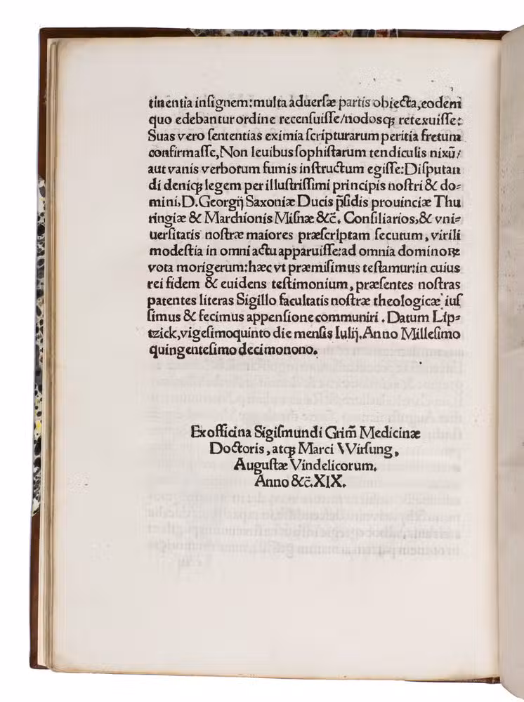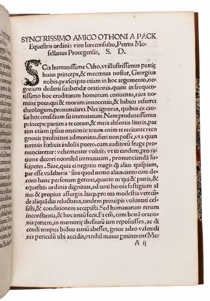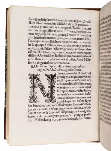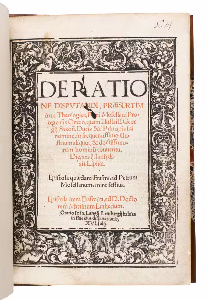 Early edition of the Latin oration delivered by Petrus Mosellanus (or Peter Schade, 1493-1524) at the opening of the Leipzig Disputation, 27 June 1519, commissioned by George, Duke of Saxony (1471-1539). This work offers a contemporary witness to one of the defining theological events of the early Reformation: the public disputation between Martin Luther (1483-1546), Andreas Karlstadt (1486-1541), and Johann Eck (1486-1543). Trained in Cologne and later professor and twice rector at the University of Leipzig, Mosellanus was a prominent humanist, philologist, and Catholic theologian. In his oration, he advocated moderation and the use of classical philosophical reasoning in theological discourse.