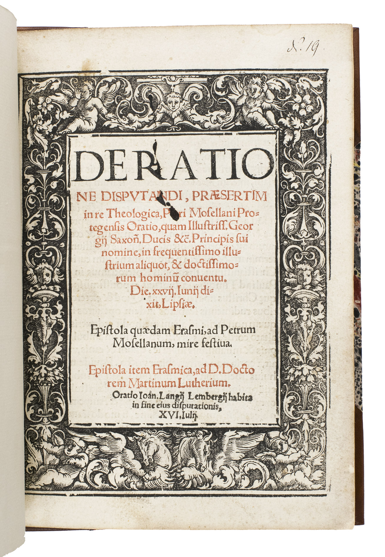 Although his address made little immediate impact on the disputants, it reflected Erasmusian ideals and marked the apex of Mosellanus' academic career. In the book are two important letters by Erasmus, both written from Louvain in 1519: one to Mosellanus (22 April), encouraging him in his humanist efforts, and another to Luther (30 May), reflecting Erasmus growing concern over the escalating theological tensions. A second oration, delivered by Johannes Langius Lambergius (1485-1565) at the conclusion of the disputation on 16 July 1519, further frames the historic event. It concludes with a laudatory poem praising the intellectual exchange between the three principal disputants.