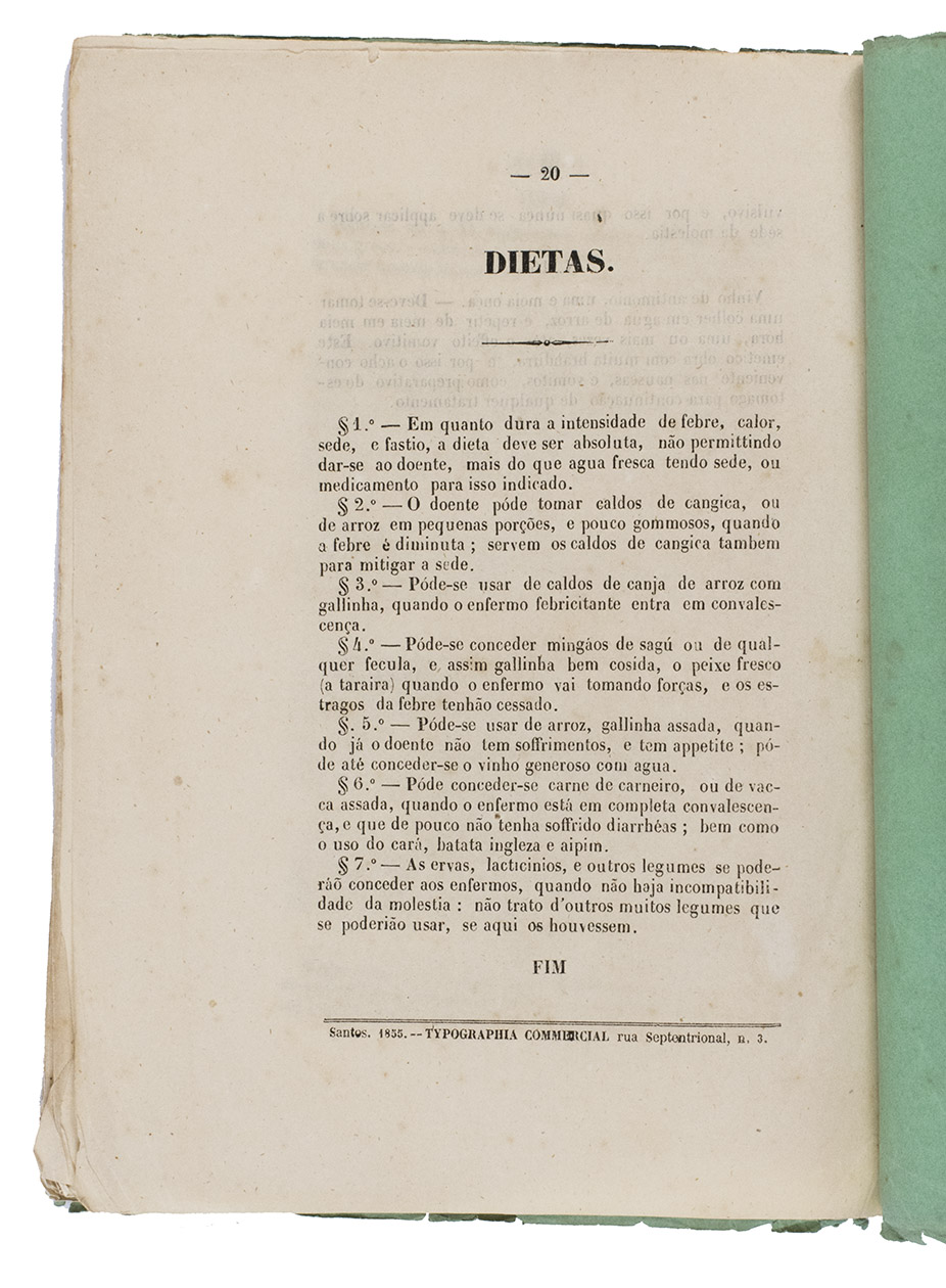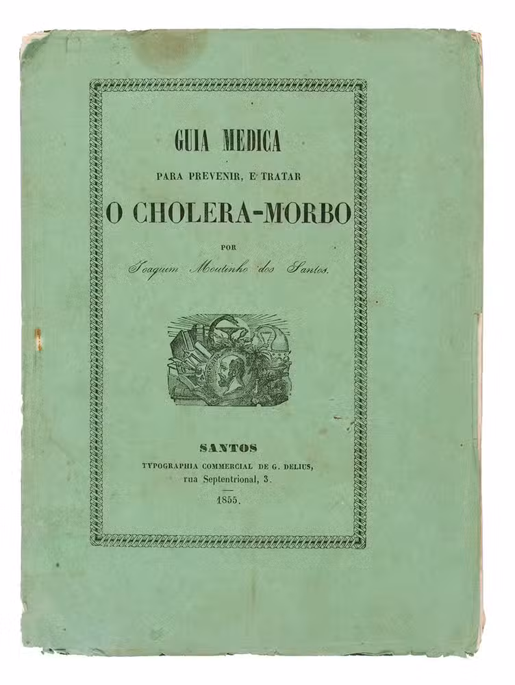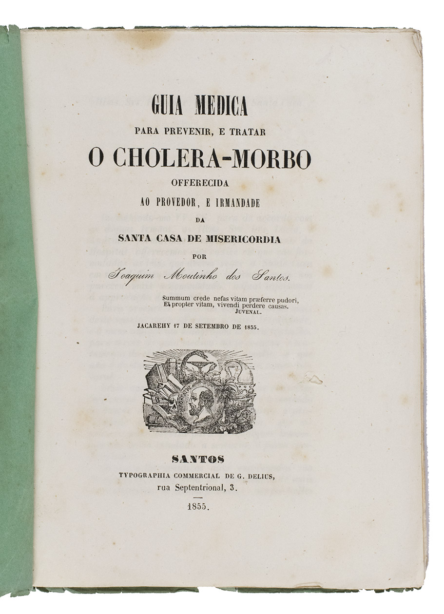 Santos, Typographia commercial de G. Delius, 1855. With the title on the front wrapper set within a decorative frame and the front wrapper and the title page show the same decorative device, including medical instruments, books, the profile of a head with a name(?) in Greek letters. Original publisher's green wrappers. 20 pp.