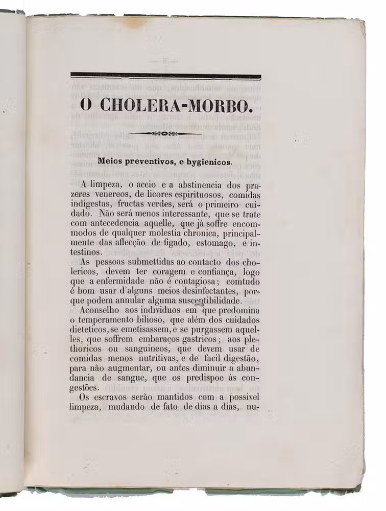 Incredibly rare medical guide to prevent and treat cholera morbo (cholera morbus). Apart from the present copy, no other copies have appeared on the market in the last century and only two other copies are held institutionally, one in the United Kingdom (the Wellcome Library) and one in the United States (Cornell University).