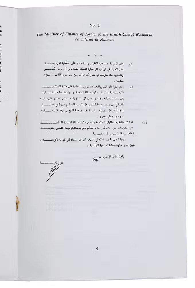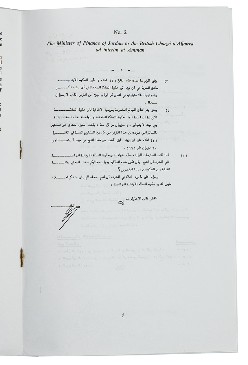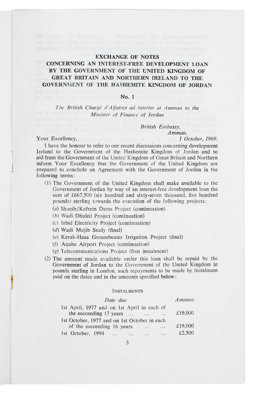 First edition of an official UK Government publication providing a transcription of the the diplomatic exchange that took place in Amman, Jordan on 1-13 October 1969 between the Government of the Hashemite Kingdom of Jordan and the UK Governemt. The notes of this diplomatic exchange were presented to the Parliament of Great Britain on January 1970. Discussed topic were an interest-free development loan for Jordan of 667,500 pounds, for the construction of a.o. an airport and dams.
