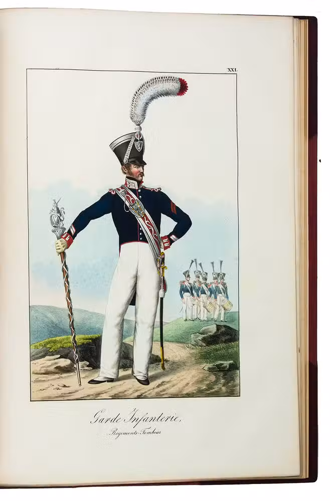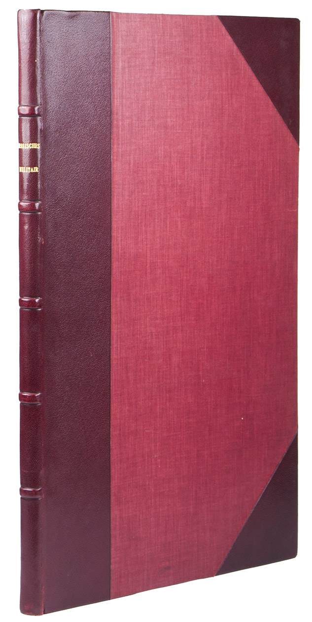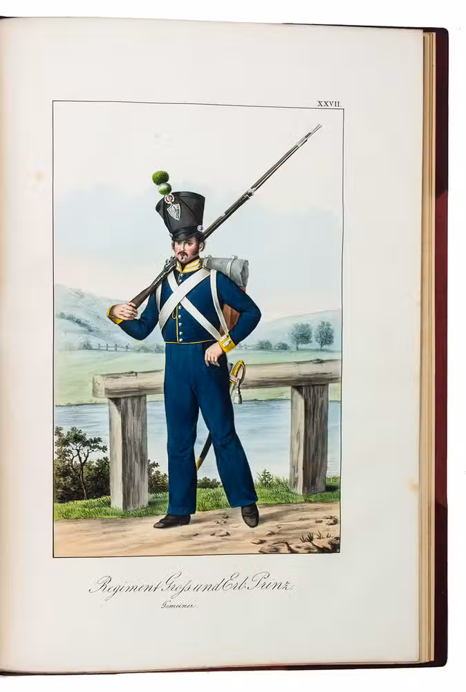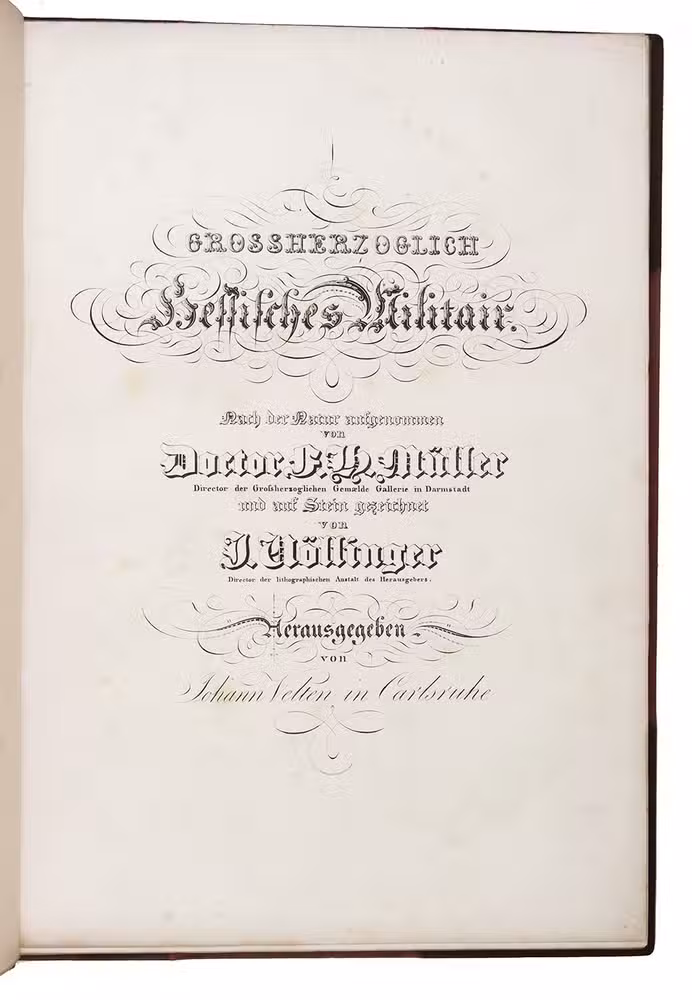Fine and rare work on military costumes by Franz Hubert Müller (1784-1835) depicting the uniforms of military of all ranks in the Hessian army. The large costume plates are finely coloured by a contemporary hand, with rich, brilliant colours for the uniforms and subtle shades for the clouds and other background elements. With engraved dedication to Ludwig "Großherzog Von Hessen und bei Rhein". The plates show a Major General, a warrant officer of the Duke of Hessen, a general officer, engineers and figures from all divisions of the army: cavalry, artillery, infantry, military police, etc., standing or on horseback in a landscape, in the barracks or in a town.