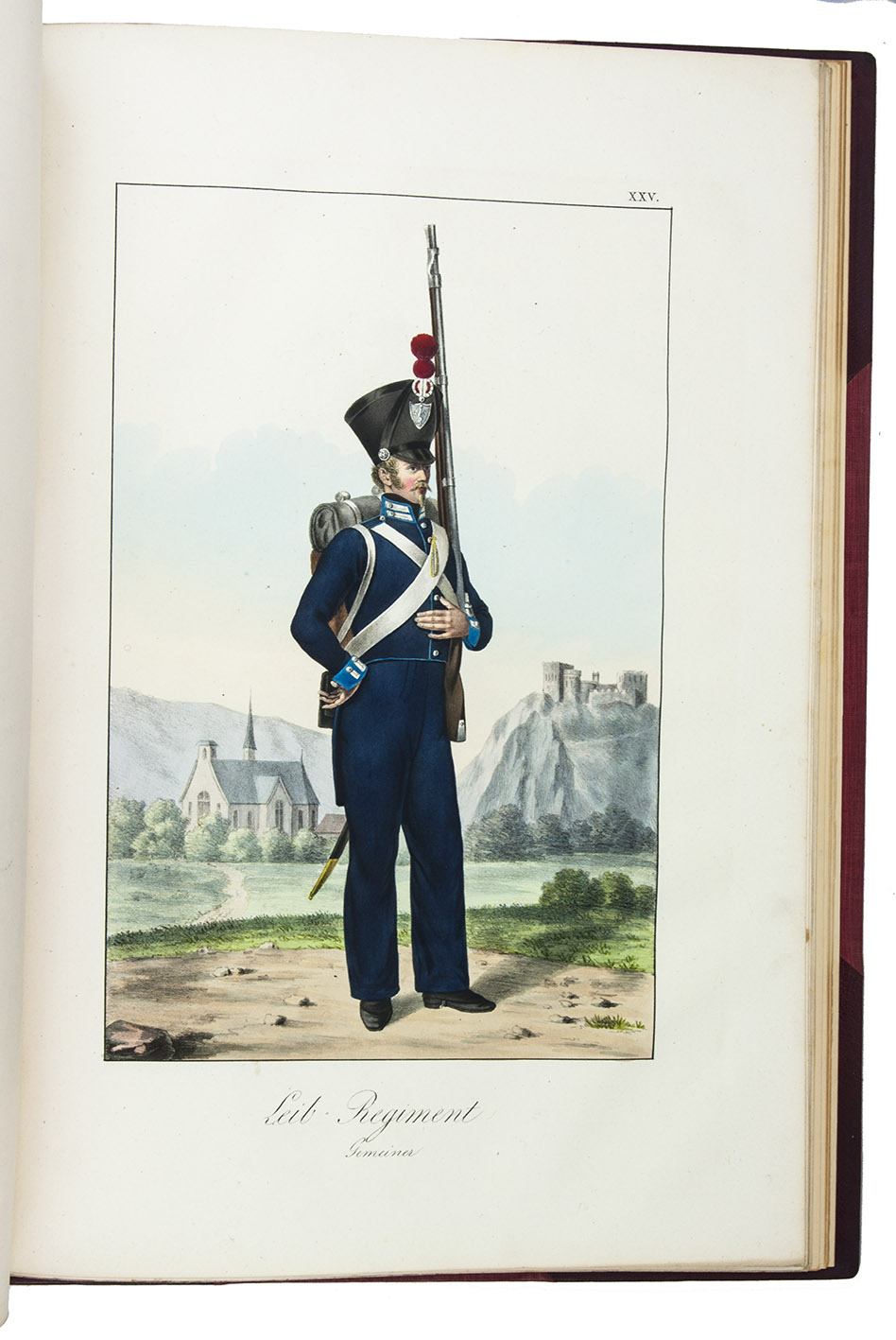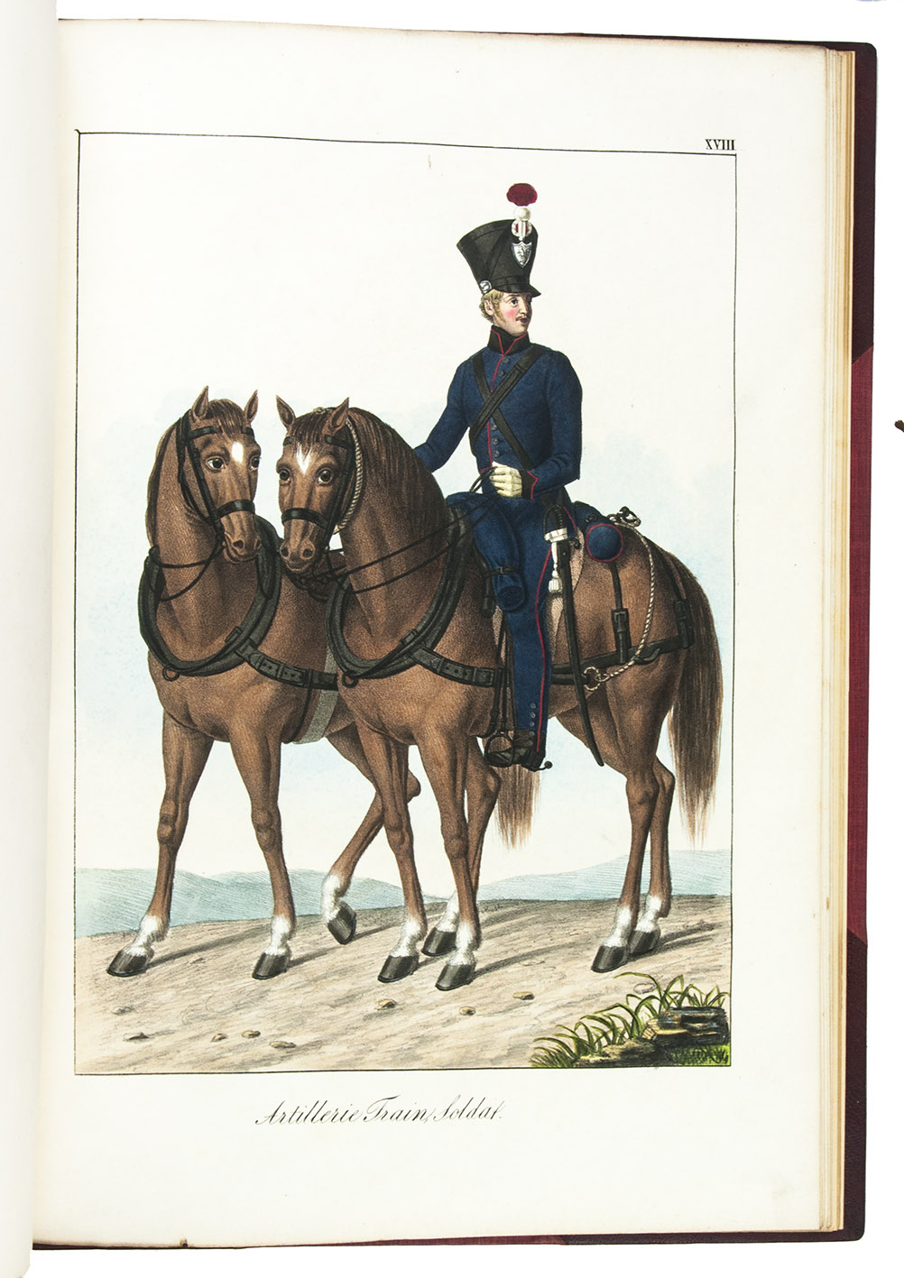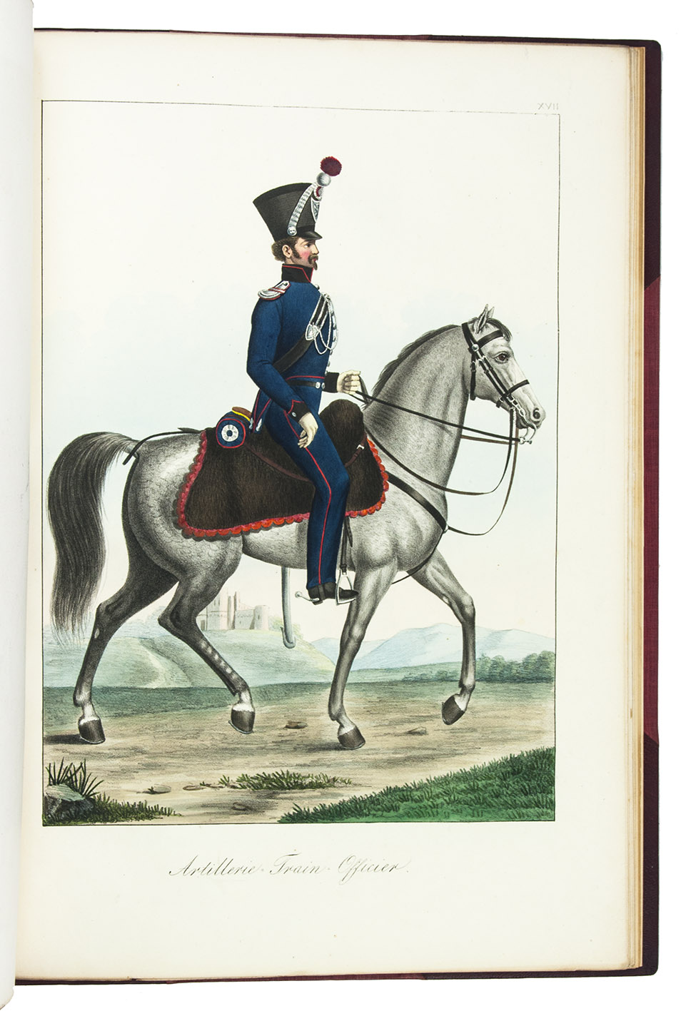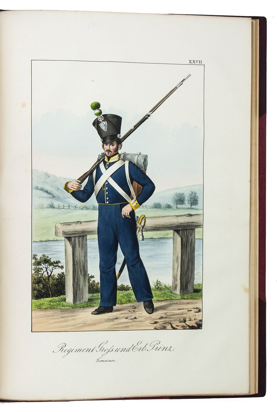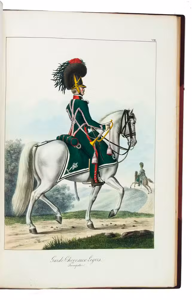 Karlsruhe, Johann Velten, [ca. 1830]. Royal folio (45×32 cm.) With a lithographic title page and dedication to the Archduke Ludwig von Hessen (both by Johann Evangel. Mettenleiter), contents list and 30 numbered lithographs of army officers and enlisted men, many on horseback, all beautifully coloured by hand with watercolour, gouache and glazed highlights. Modern red half morocco. [2], 30, [1] ll.