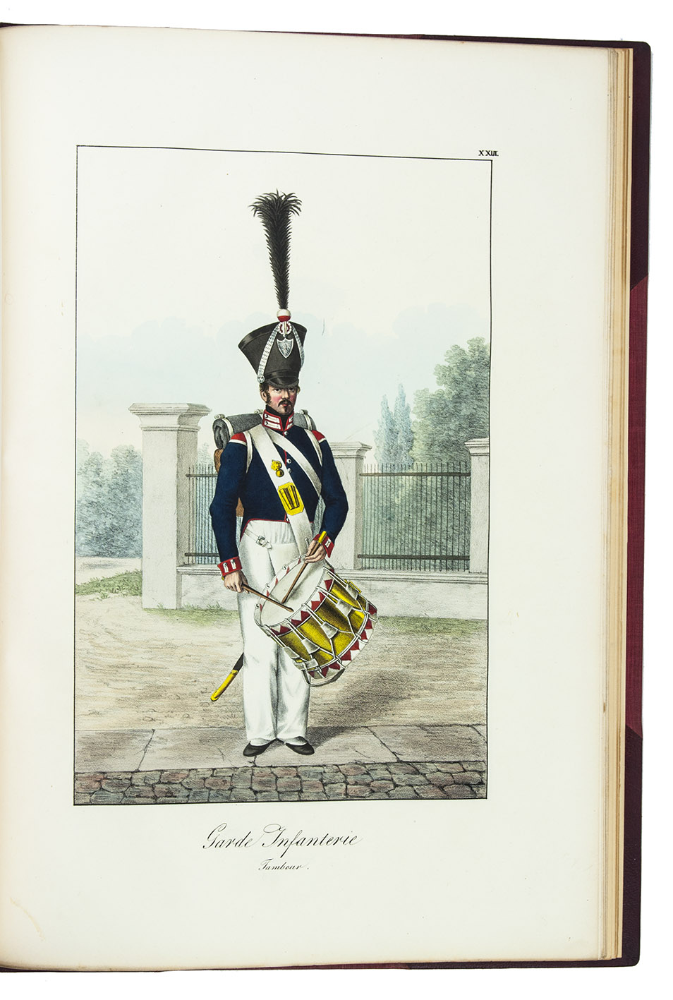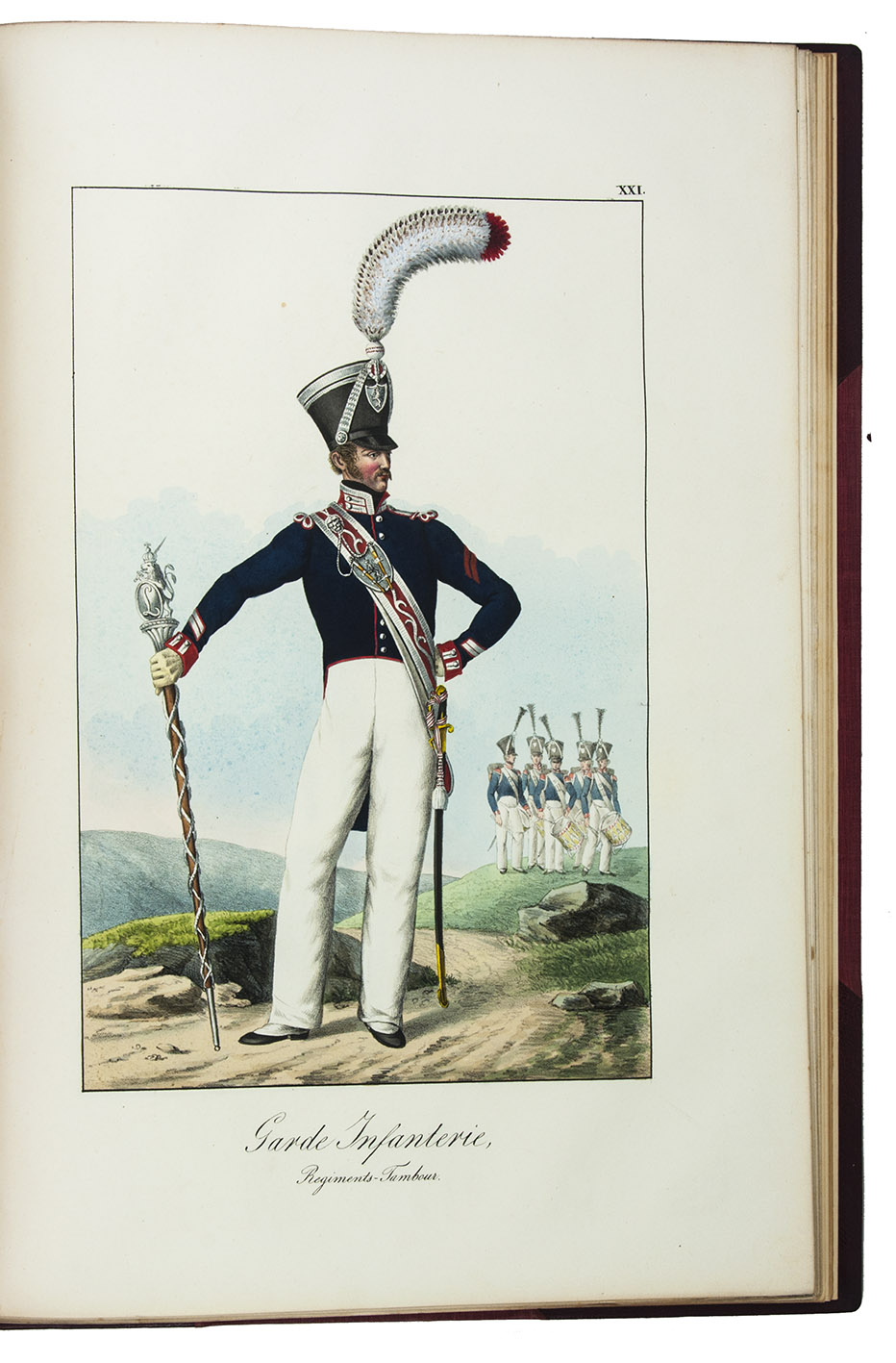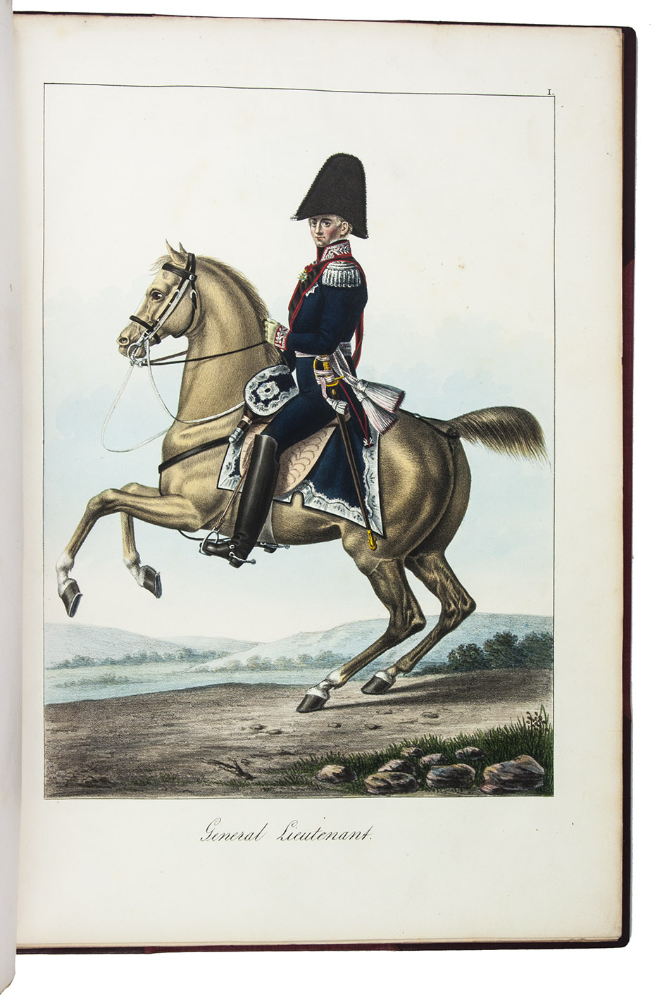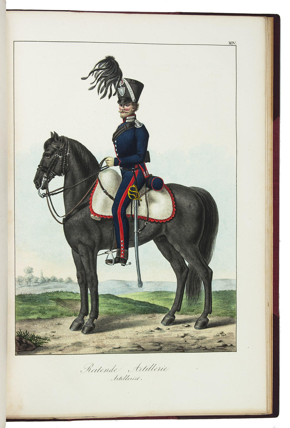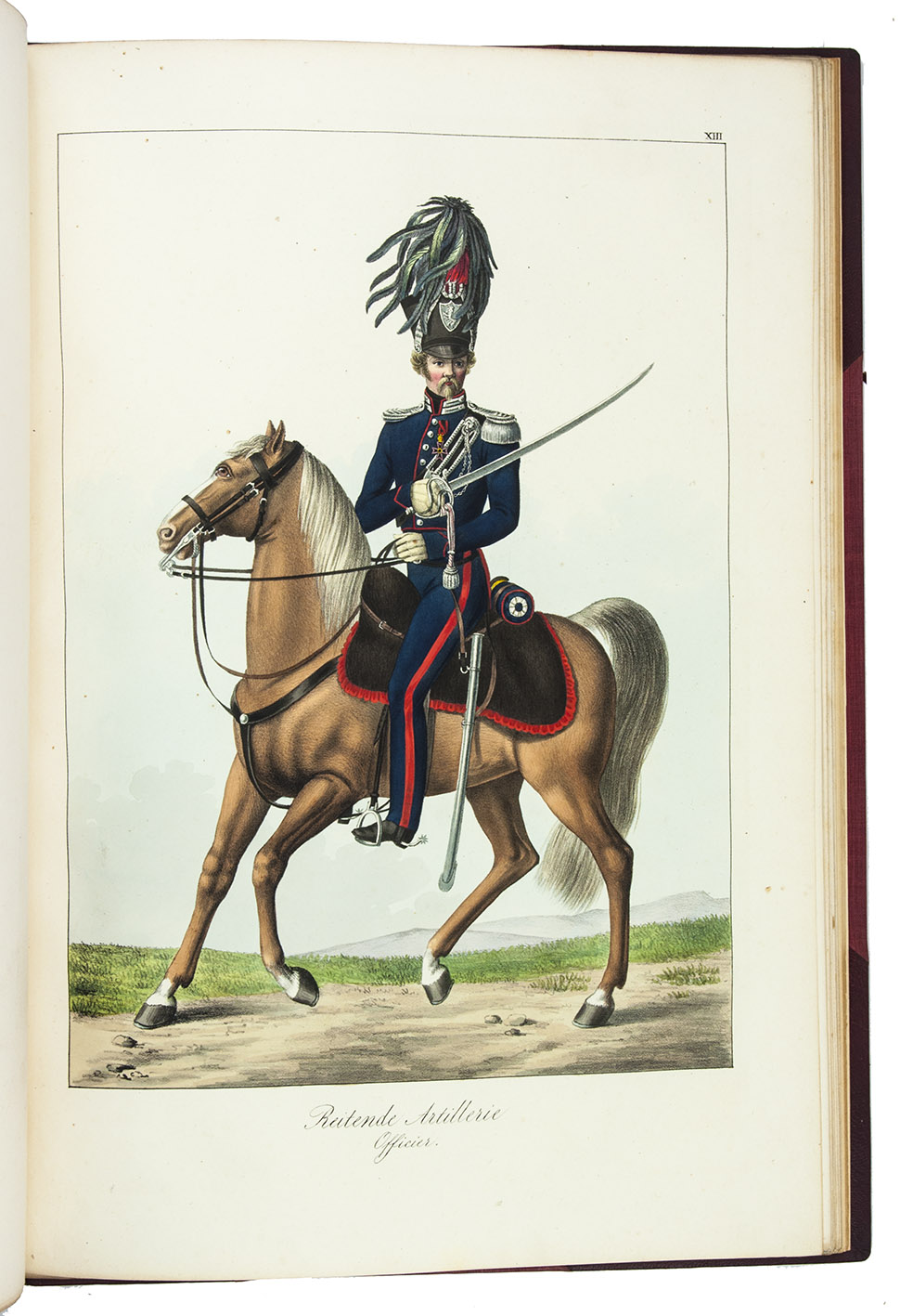 Karlsruhe, Johann Velten, [ca. 1830]. Royal folio (45×32 cm.) With a lithographic title page and dedication to the Archduke Ludwig von Hessen (both by Johann Evangel. Mettenleiter), contents list and 30 numbered lithographs of army officers and enlisted men, many on horseback, all beautifully coloured by hand with watercolour, gouache and glazed highlights. Modern red half morocco. [2], 30, [1] ll.