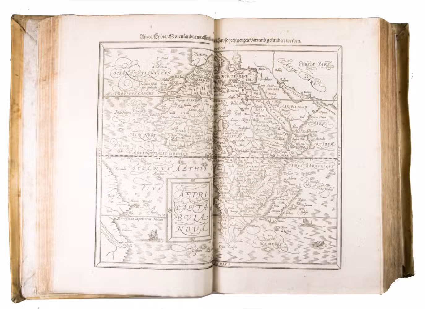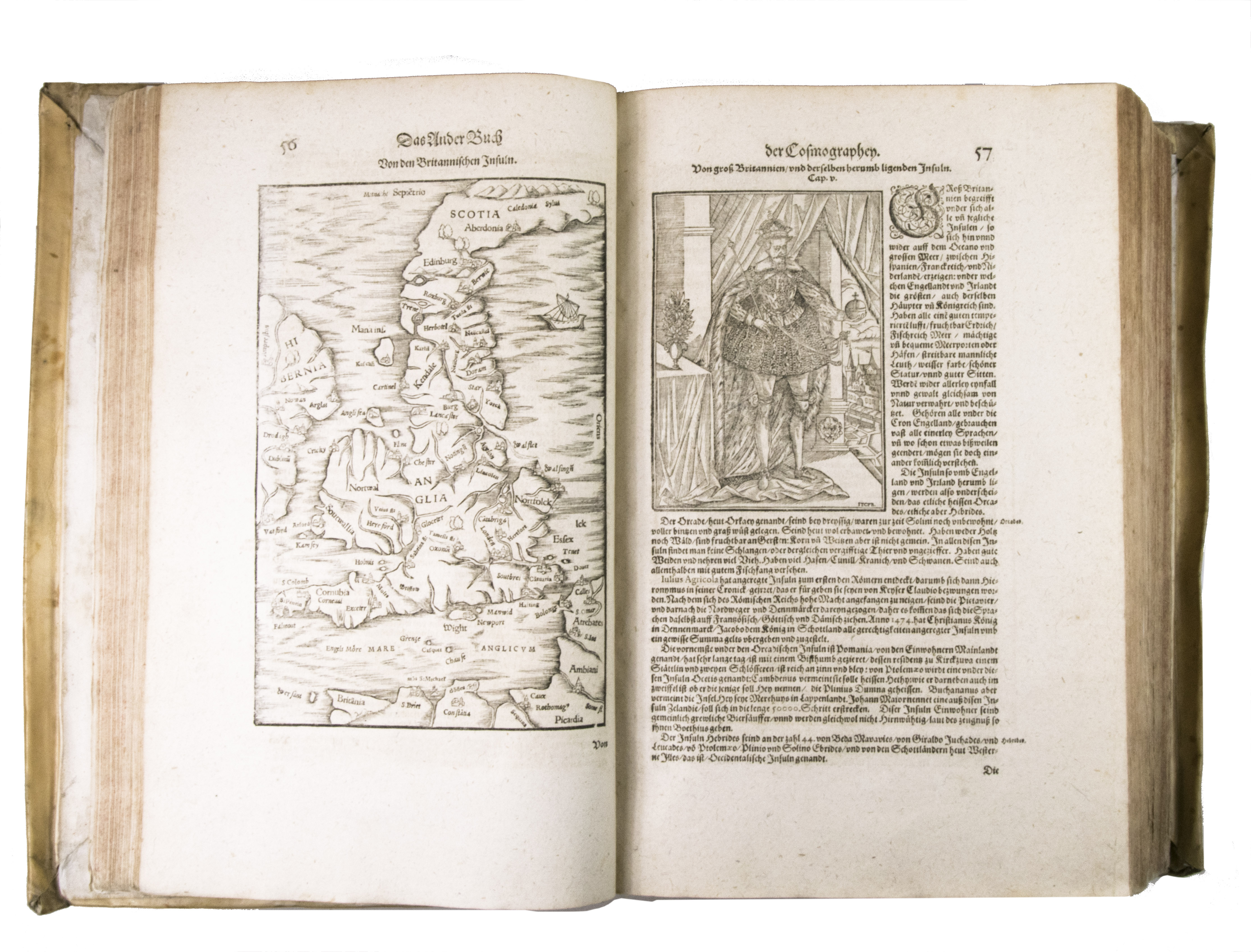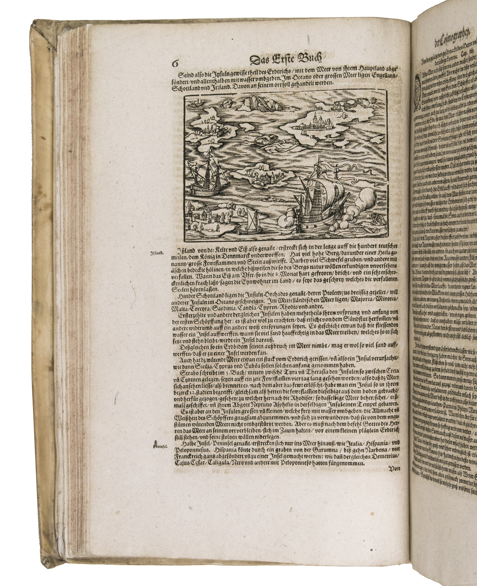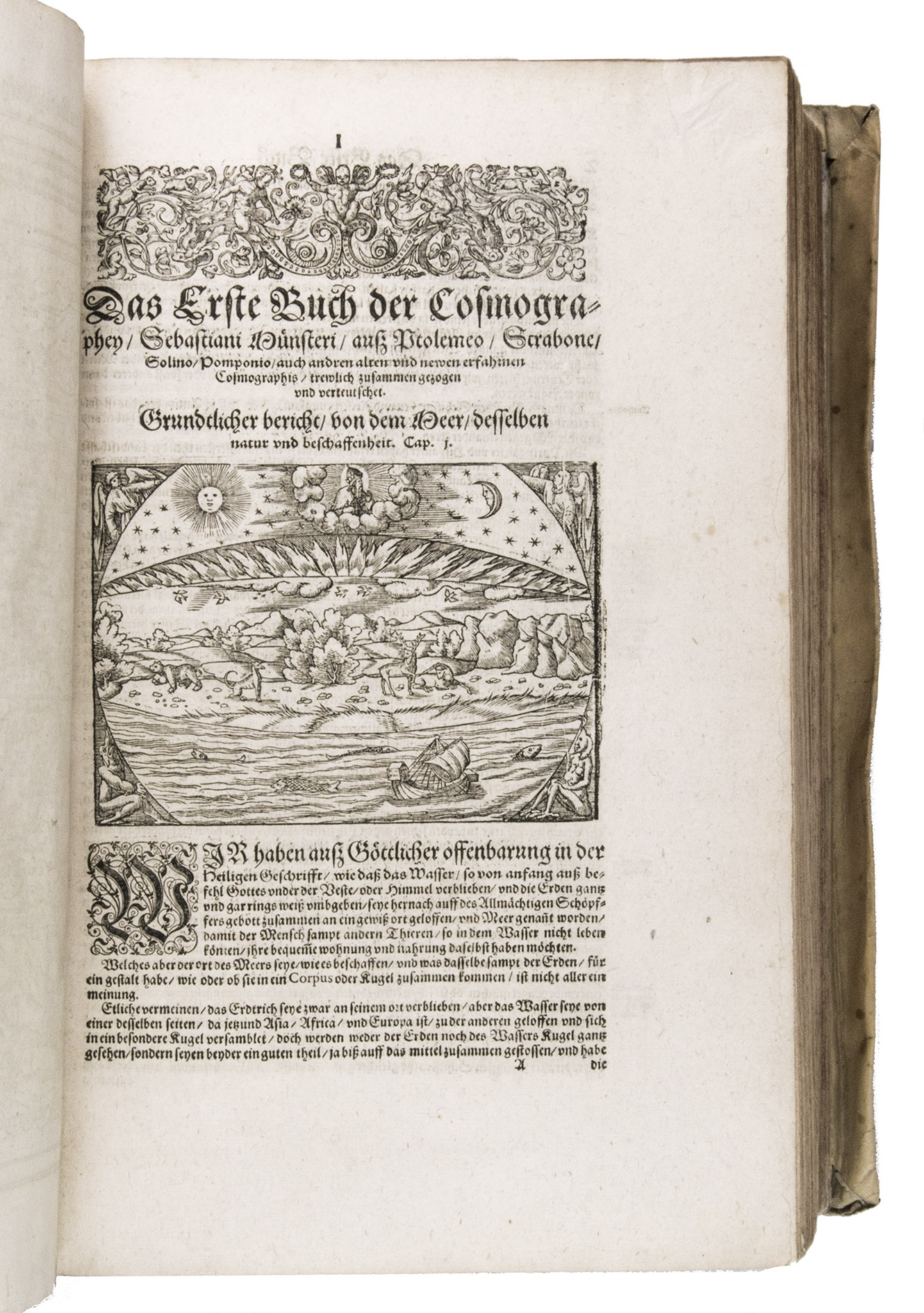 Basel, heirs of Sebastian Henricpetri, 1628. Folio (38 x 24.5 cm). With engraved title-page, letterpress title-page printed in red and black with woodcut portrait of Münster on the back, 26 numbered double-page woodcut maps on inserted bifolia, 72 double-page woodcut maps, plans and views on integral leaves, and about 1500 woodcut illustrations in the text (including repeats) showing maps, plans, views, plants, animals, monsters, etc. Contemporary vellum. [24], “1752” [=1748] , [12] pp.