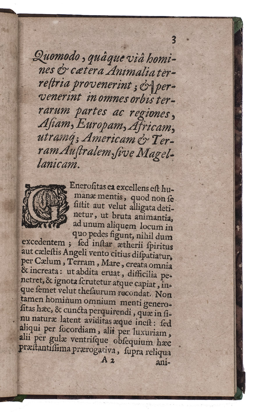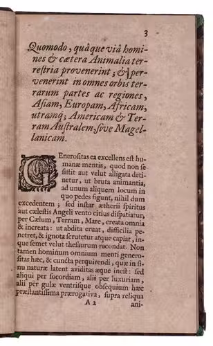De origine animalium, et migratione populorum, ... Ubi inquiritur, quomodo quaque via homines cateraque animalia terrestria provenerint; & post deluvium in omnes orbis terrarum partes & regiones: Asiam, Europam, Africam, utramque Americam, & terram Australem, sive Magellanicam, pervenerint.
