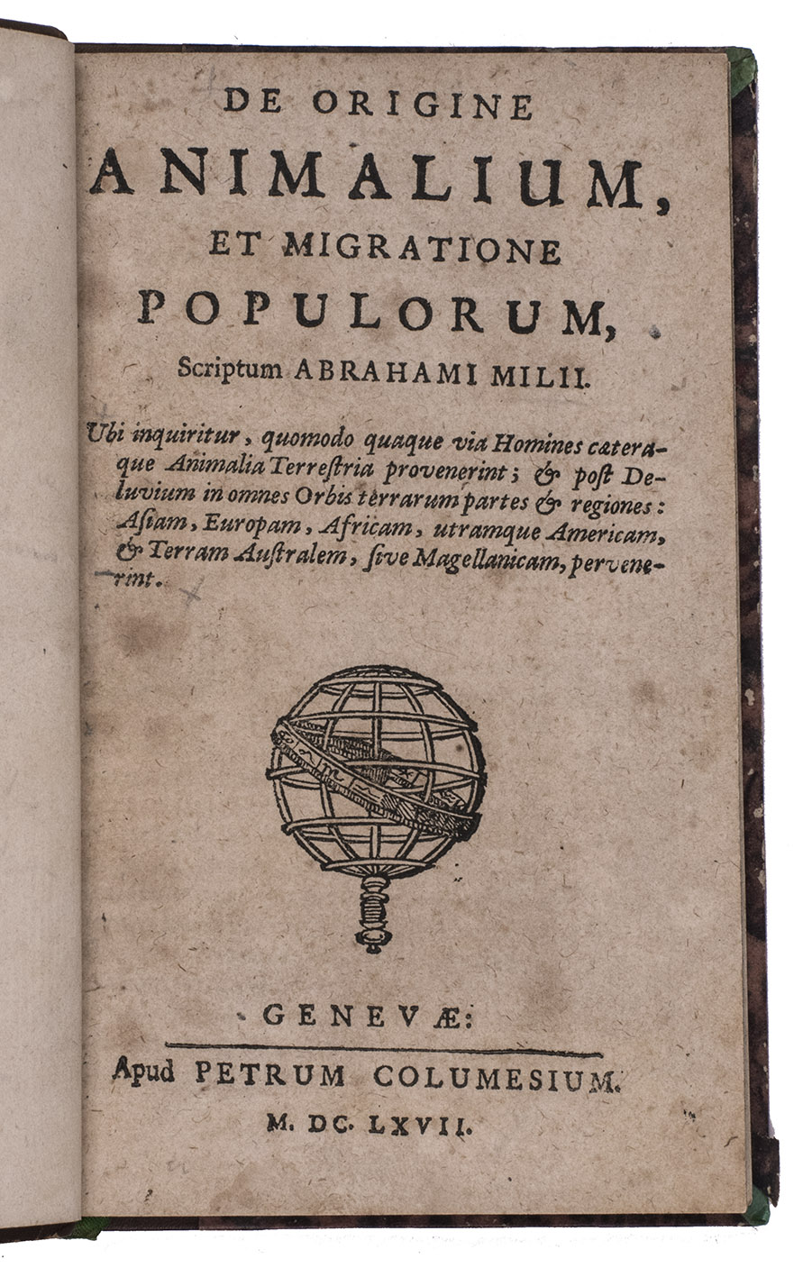 First edition of treatise on the origin and migration of man and animals, a posthumously published work by the Dutch linguist and minister Abraham van der Myl (1563-1637). "It was only after the discovery of America that the attention of naturalists was powerfully drawn to the wonderful differences between the animal population of the central and southern parts of the new world and that of those parts of the old world which lie under the same parallels of latitude. So far back as 1667 Abraham Mylius, in his treatise "De Animalium origine et migratione populorum," argues that, since there are innumerable species of animals in America which do not exist elsewhere, they must have been made and placed there by the Deity" (Huxley). "lncludes a curious dissertation on the origin of the American races" (Sabin). A German translation appeared in 1670.