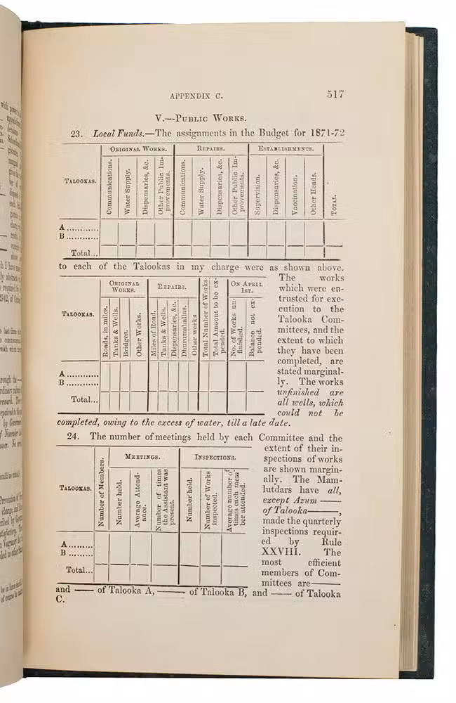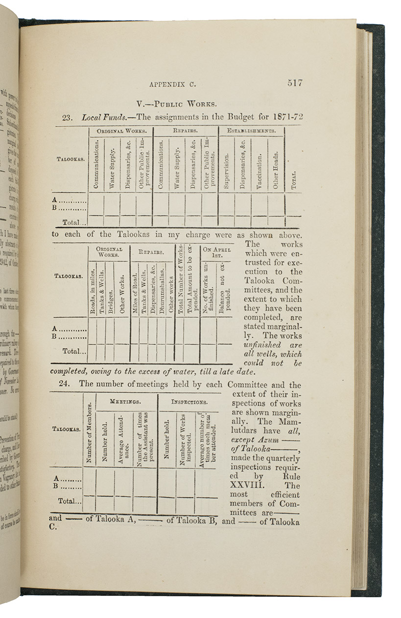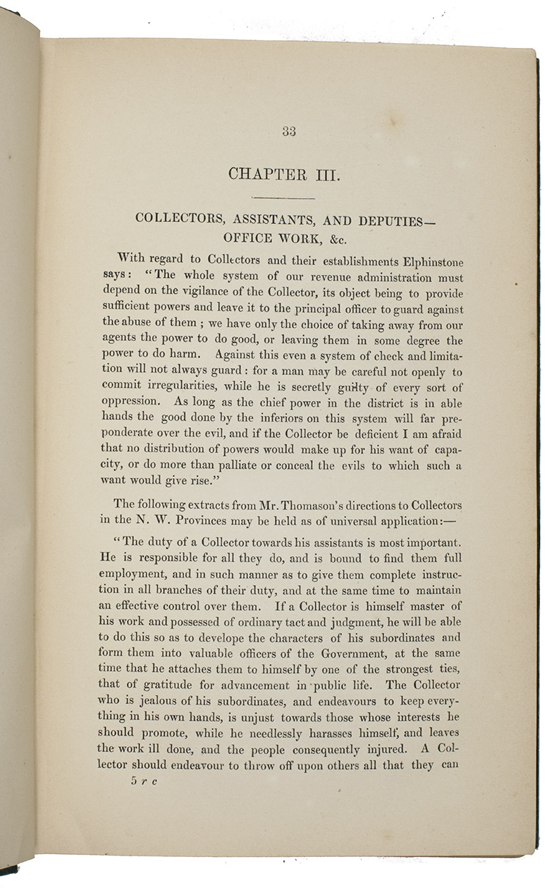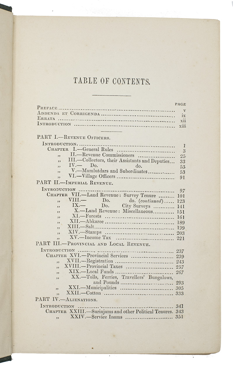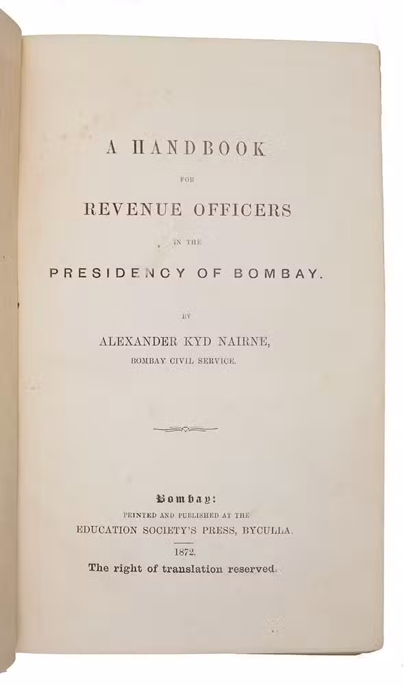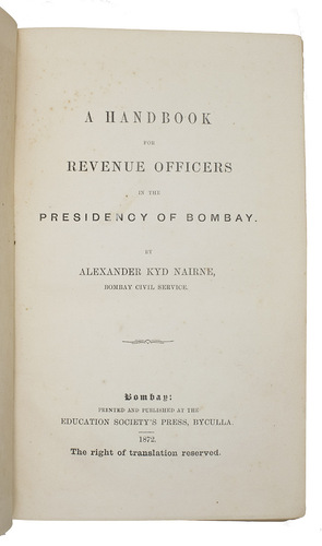 Very rare first edition of a guide for government officials in the presidency of Bombay, an administrative subdivision of British India. The author, Alexander Kyd Nairne, worked for the Bombay civil service and the government had him compile the relevant information and write a handbook for other civil servants tasked with administering and collecting taxes. The book is divided into five parts and informs the reader of general and particular rules relating to imperial, provincial and local taxes and several important special cases and exceptions to the rules. Not much is known about the personal life of the author. A second edition appeared in 1878, while a third edition, revised by H.A. Acworth, appeared in 1884. All editions are rare.