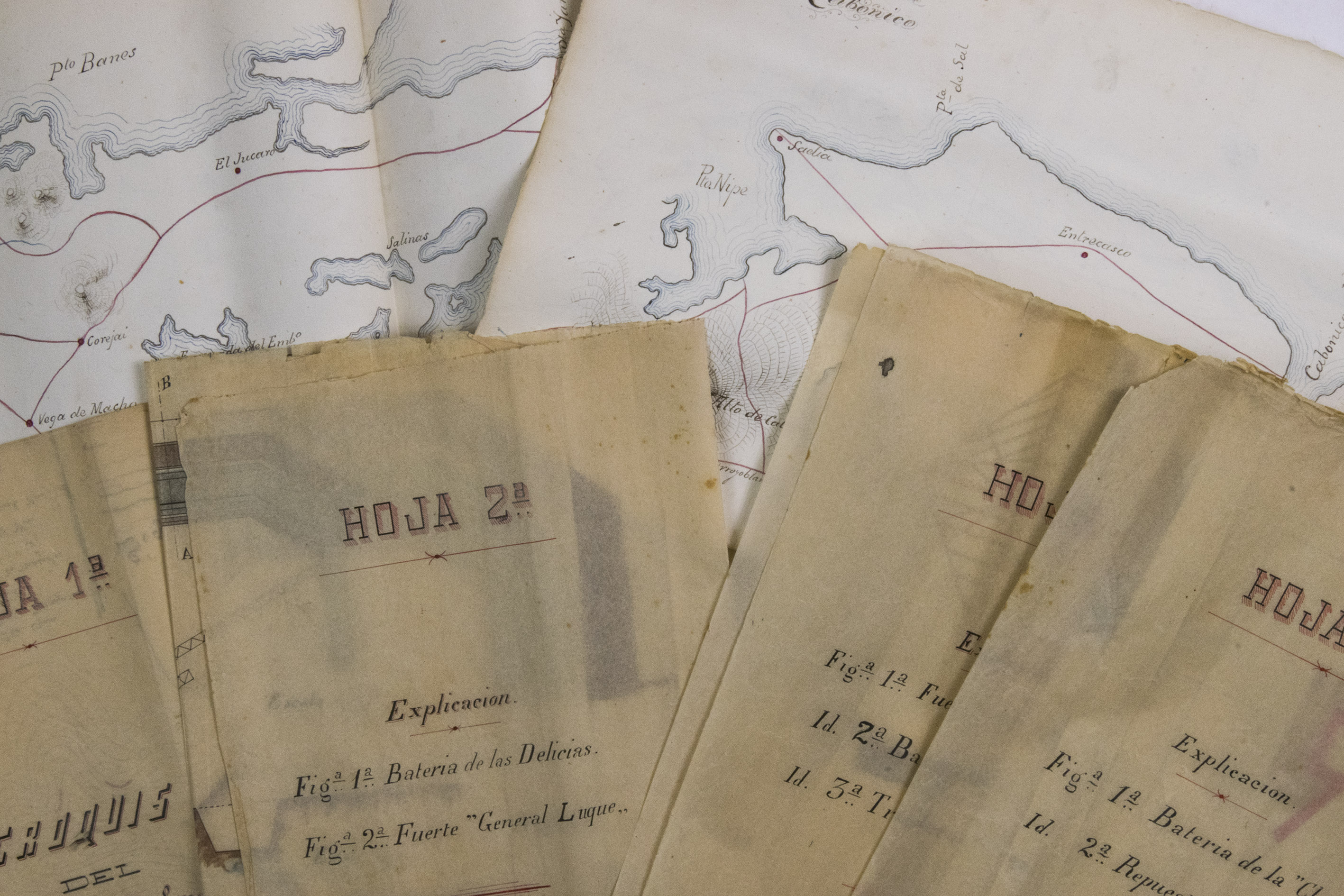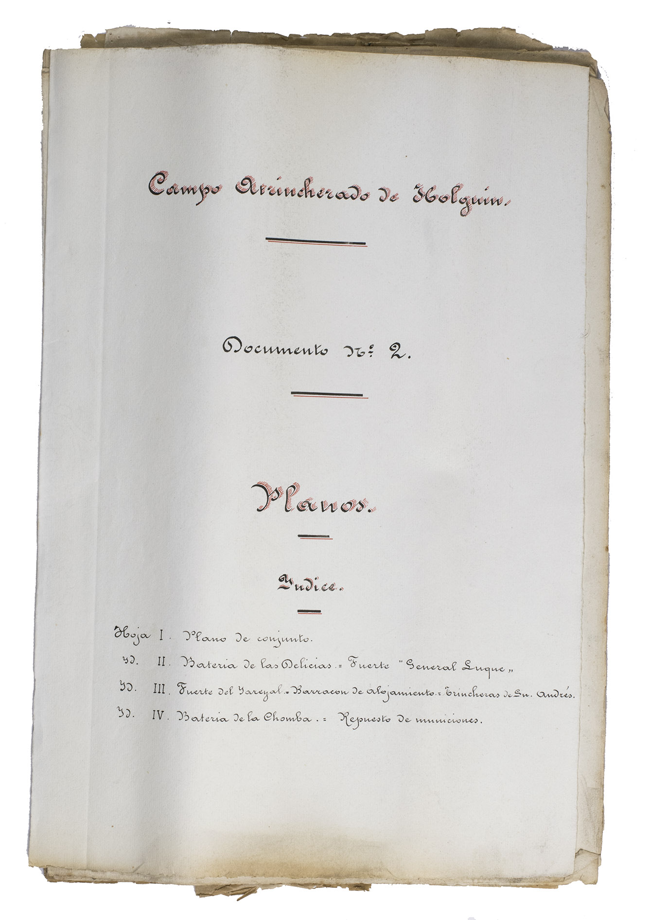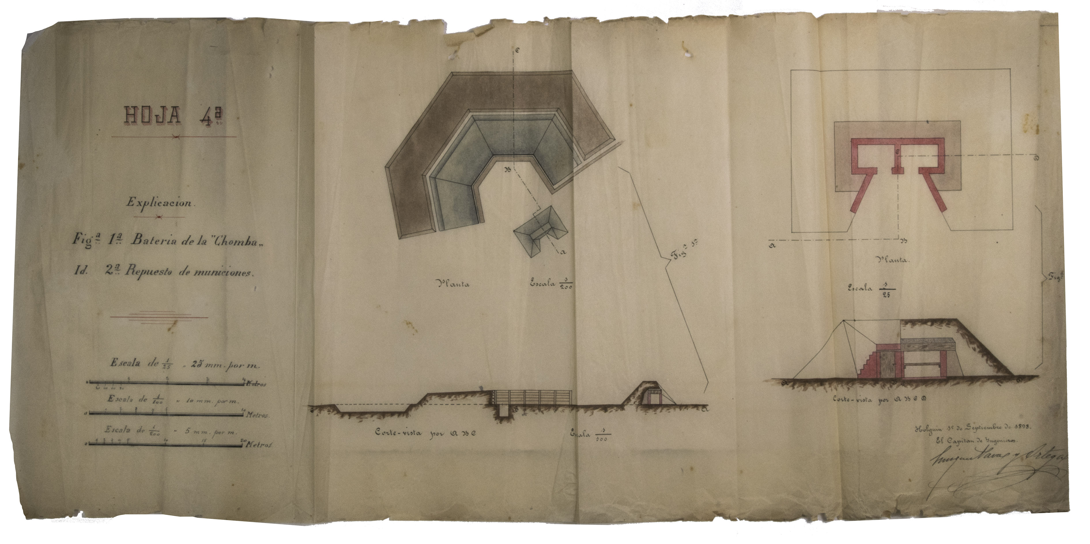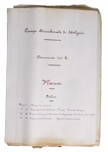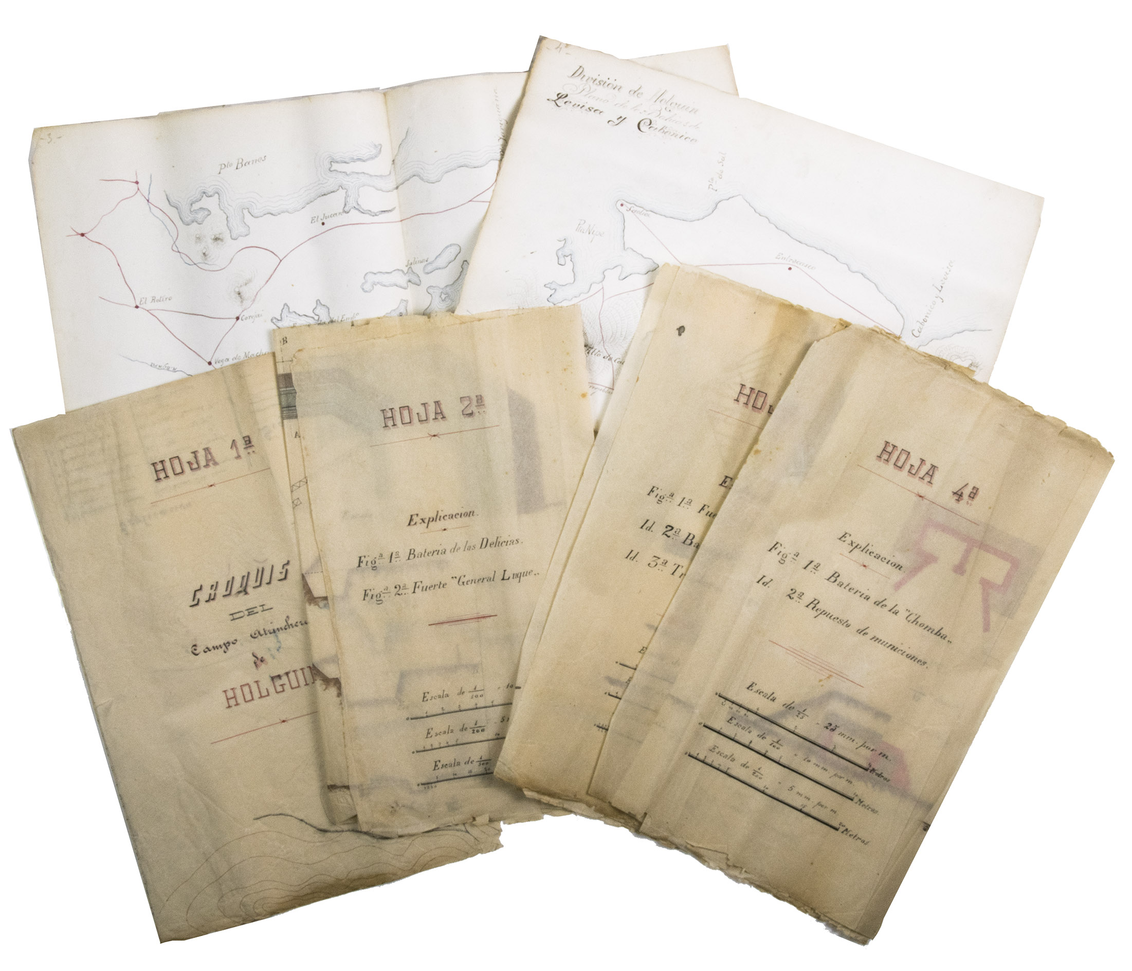 Holguín, 1 September 1898. 2 documents. Folio. With a double-page manuscript map, 2 full-page manuscript maps, and 4 manuscript plans on tissue paper. Including: IDEM. Campo Atrincherado de Holguin. Documento no. 2. Planos.