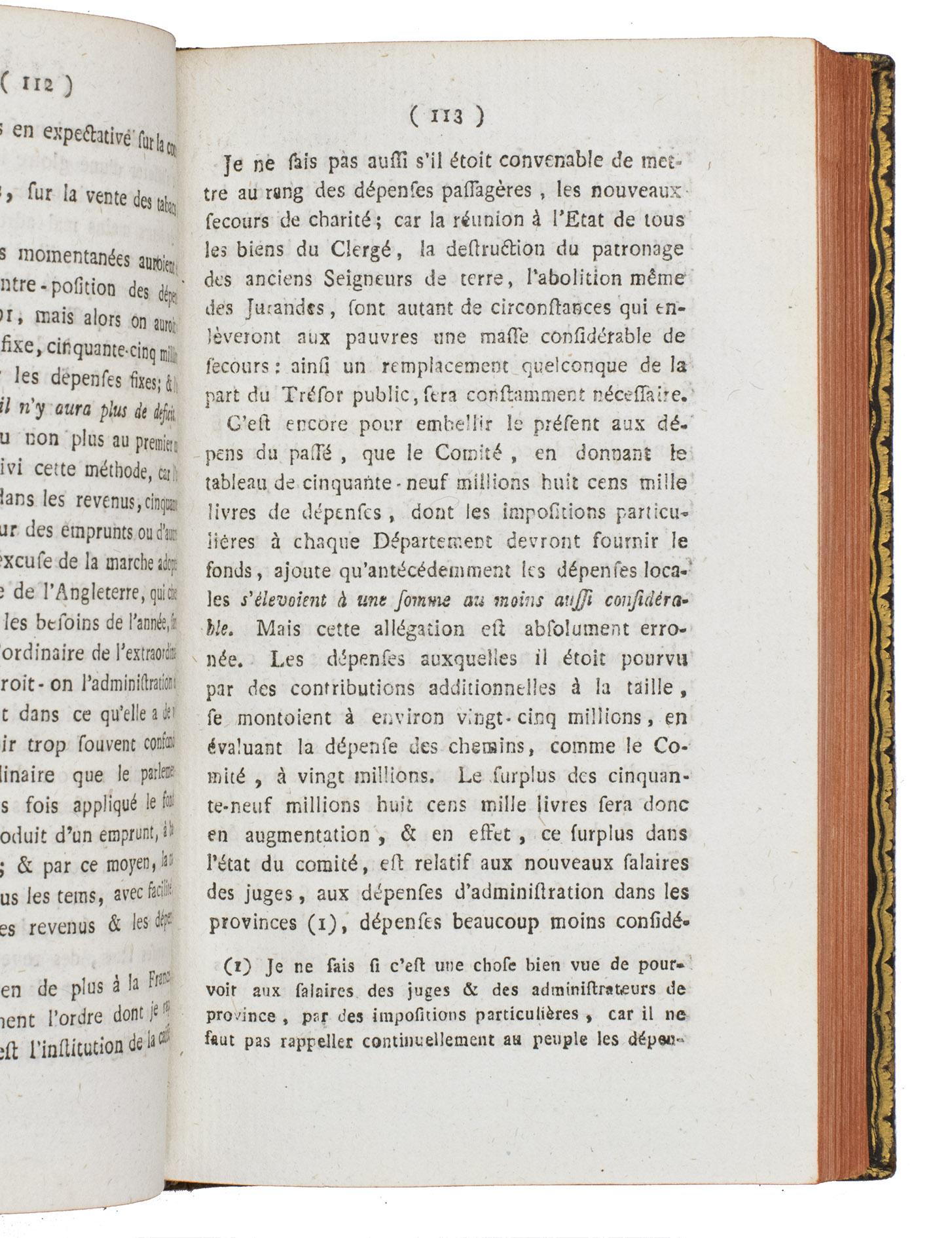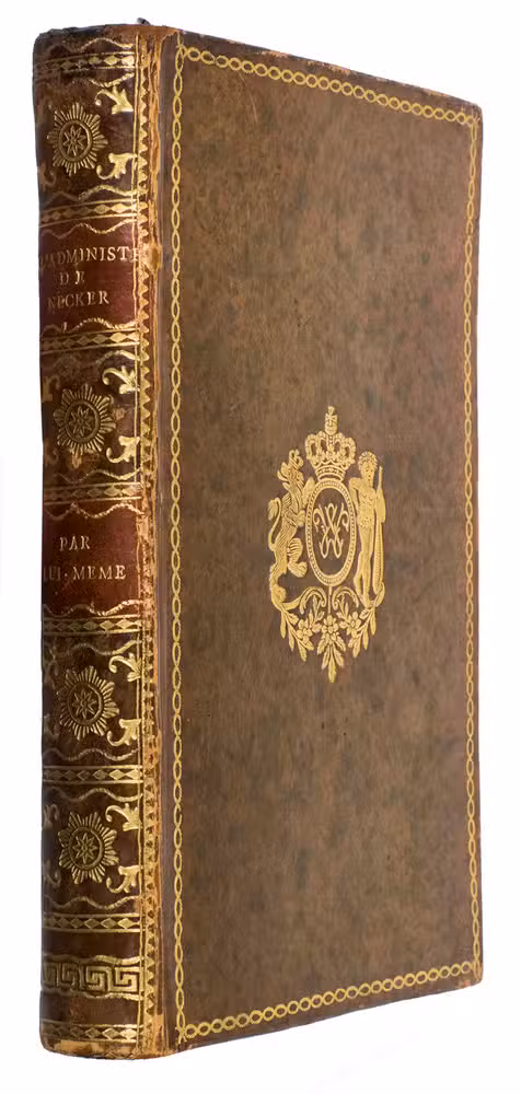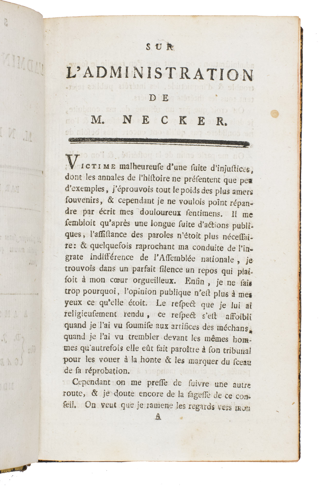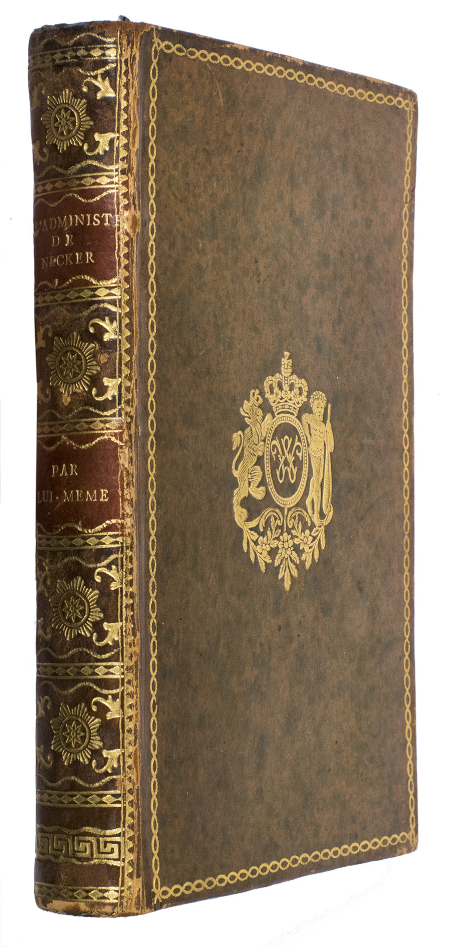 The joints, corners and edges of the boards show minor signs of wear. Otherwise in very good condition. Harris, R.D., Jacques Necker: Reform Statesman of the Ancien Regime (1979) and the review by G. Taylor, in: Journal of Econ. Hist., 40 (1980), pp. 877-879; Necker and the Revolution of 1789 (1986), passim; STCN 29155623X (2 copies); WorldCat 458842139, 1154667369 (4 copies, incl. 1 also in the STCN); cf. Goldsmith 15022 (Paris 1791 ed.).